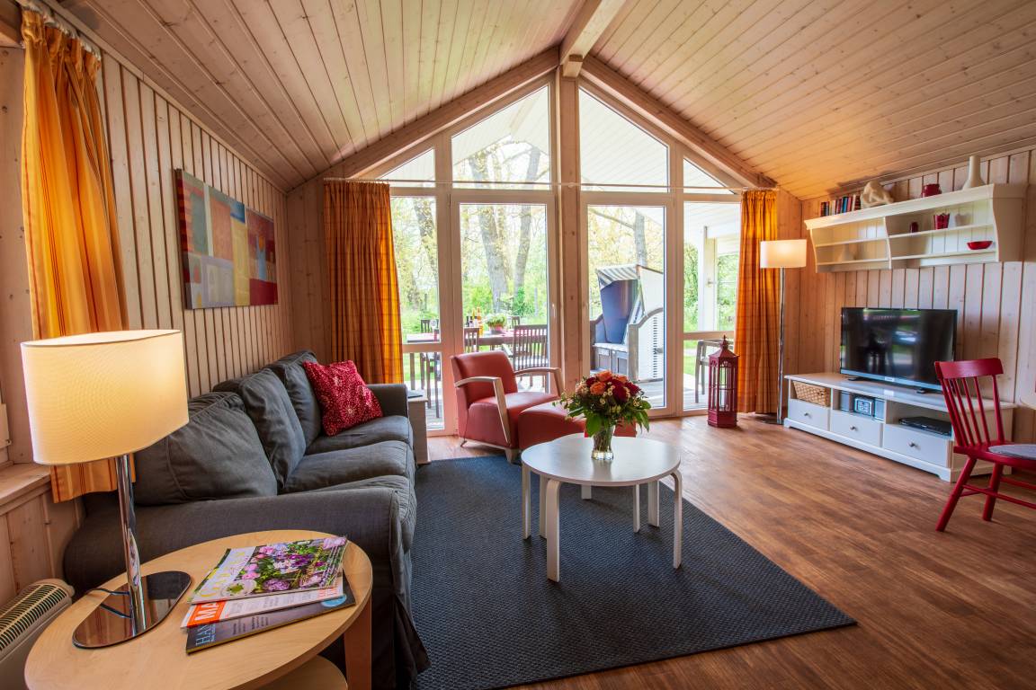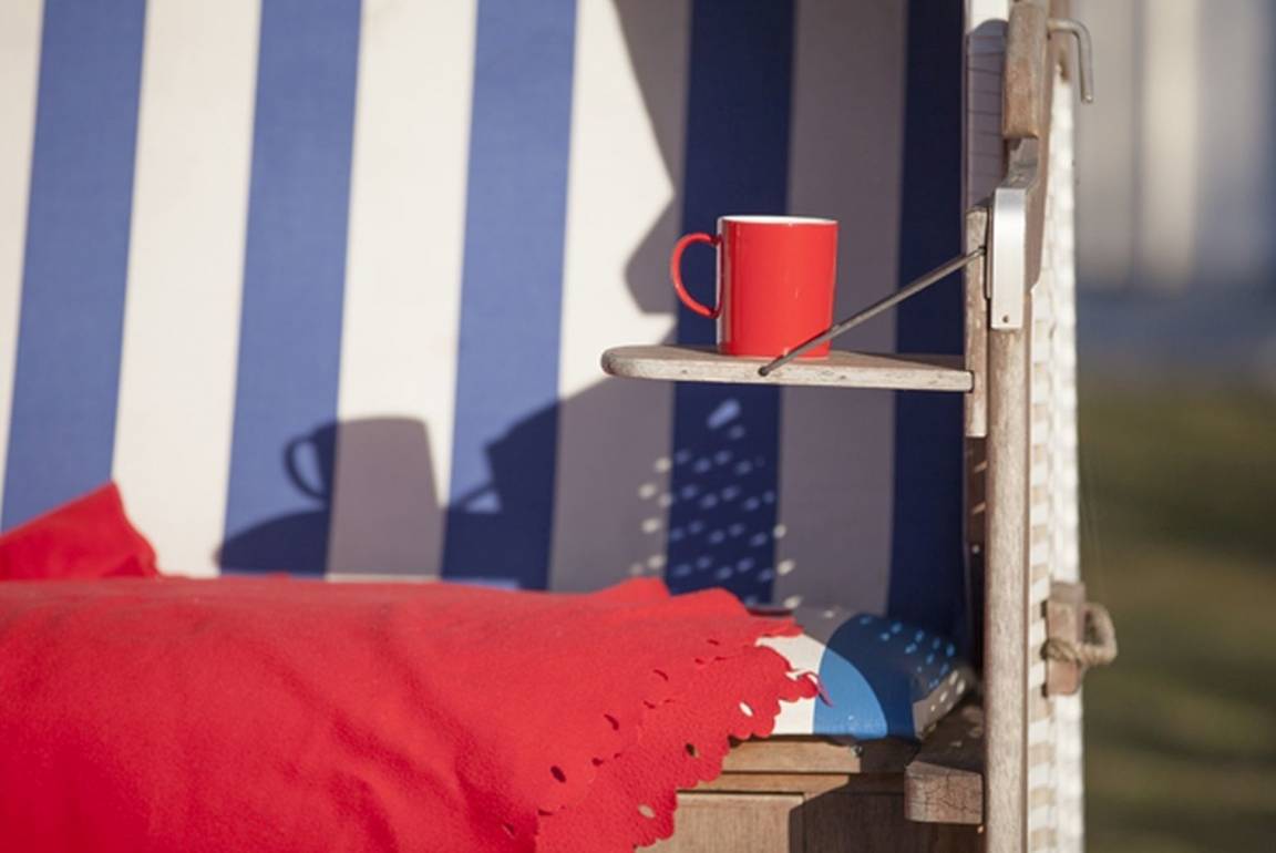 Der Kamin ist auch hier der Mittelpunkt des Wohnbereiches. Das Ambiente des Strandhauses wird durch die Farben rot und weiß kraftvoll und modisch akzentuiert. Der direkte Strandzugang liegt nur wenige Schritte von der Terrasse entfernt. Dieses Haus hat keine eigene Sauna.