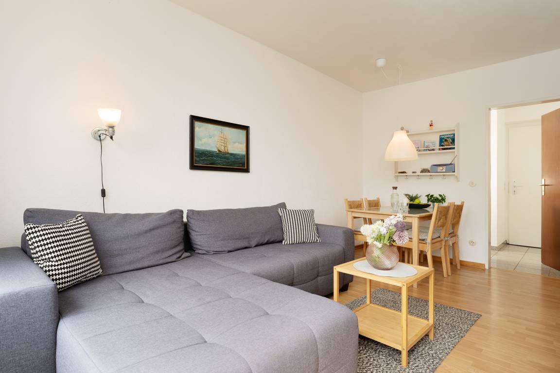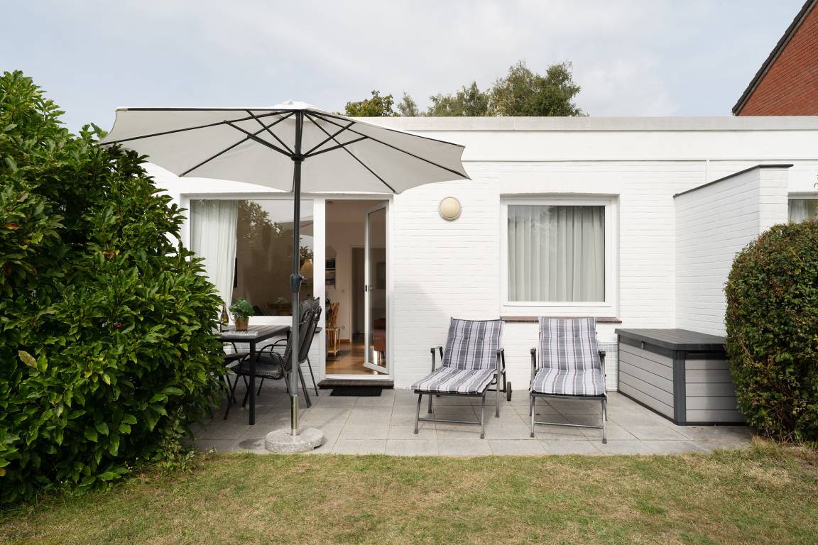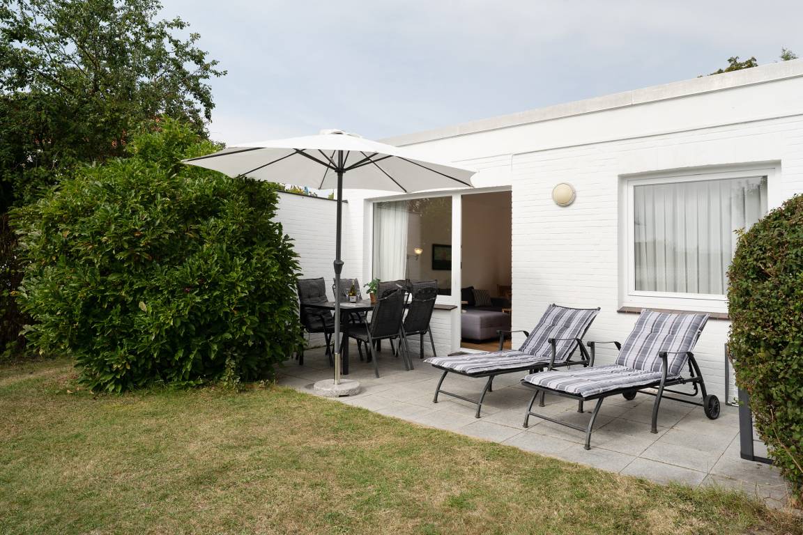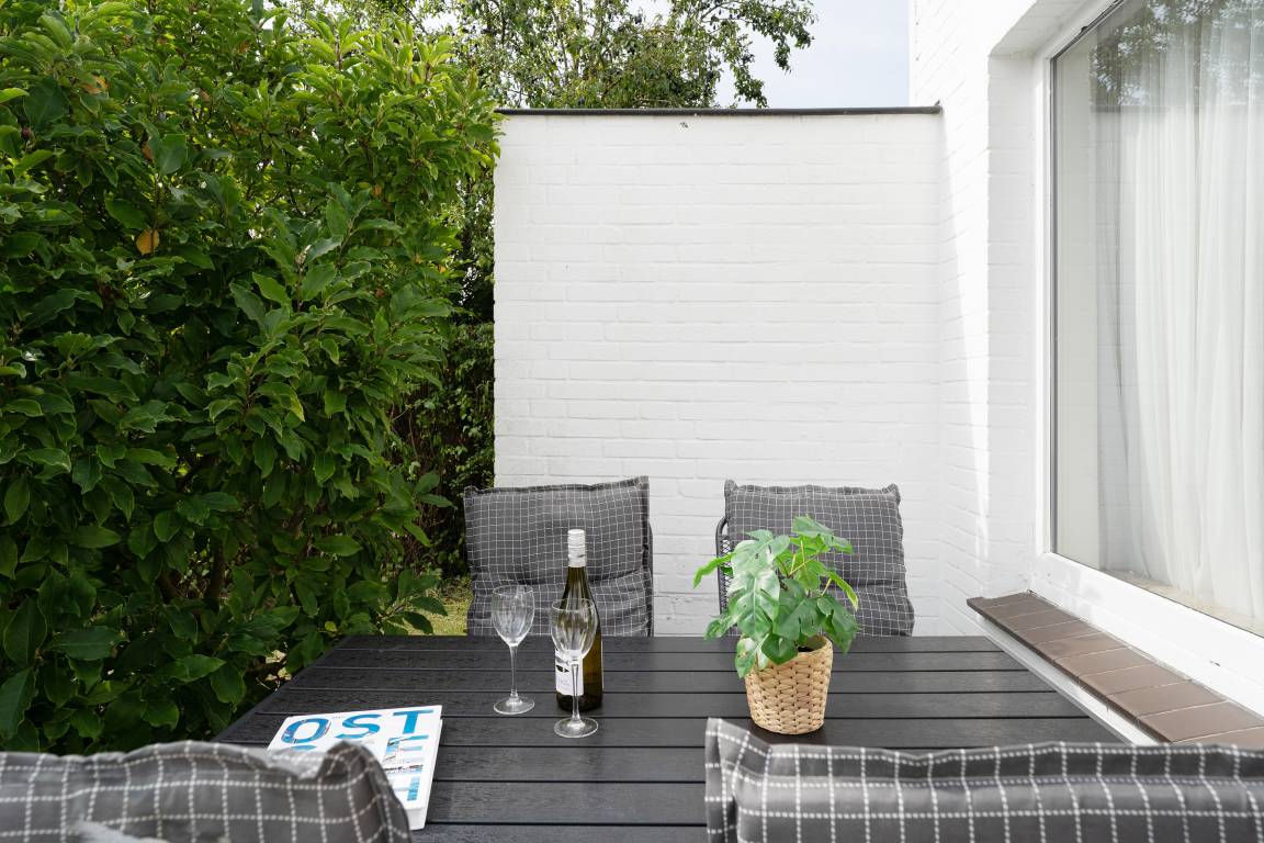 Im gemütlichen Wohnbereich erwartet Sie ein Sofa, ein Flachbildfernseher, für entspannte Stunden in Kreise der Liebsten. Von hier aus gelangen Sie direkt auf die Terrasse, die mit 12 m² Platz zum Entspannen bietet. Dank der Südwest-Ausrichtung genießen Sie hier die Sonne bis in die Abendstunden – ein Holzkohlegrill steht für gesellige Grillabende bereit.