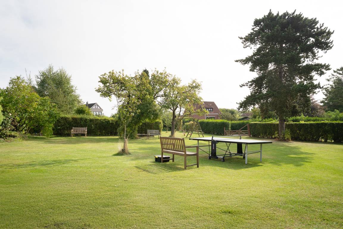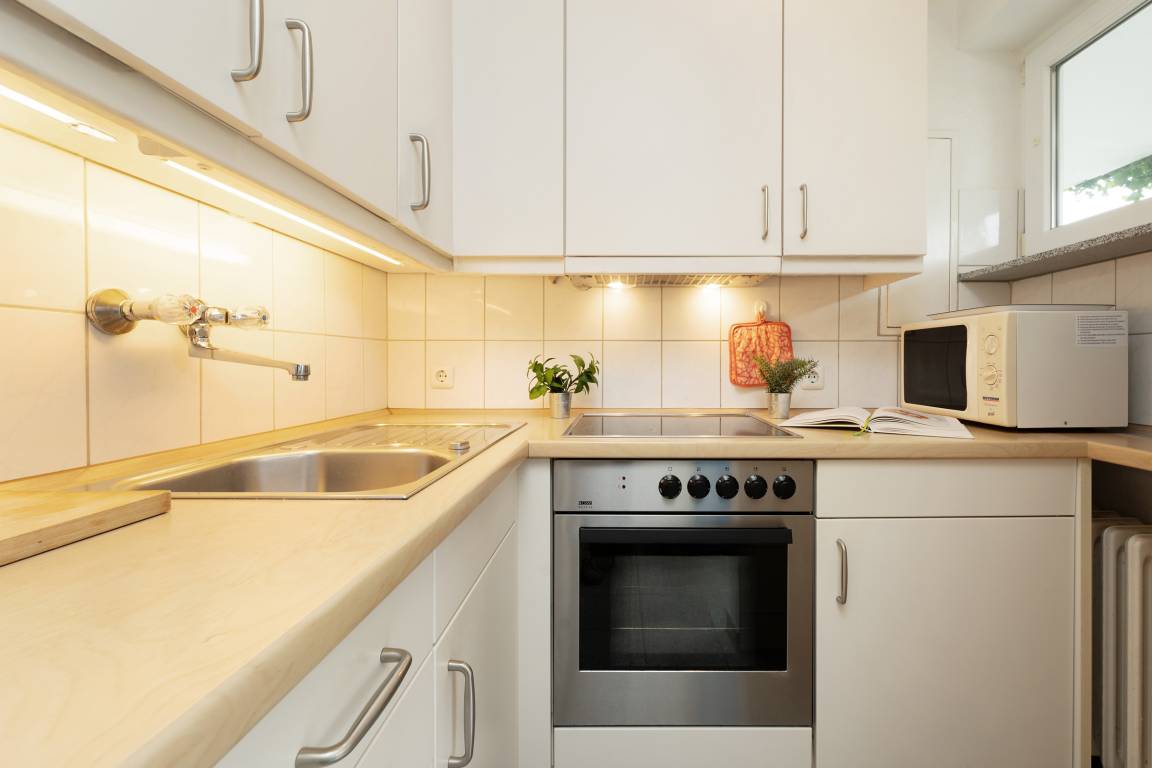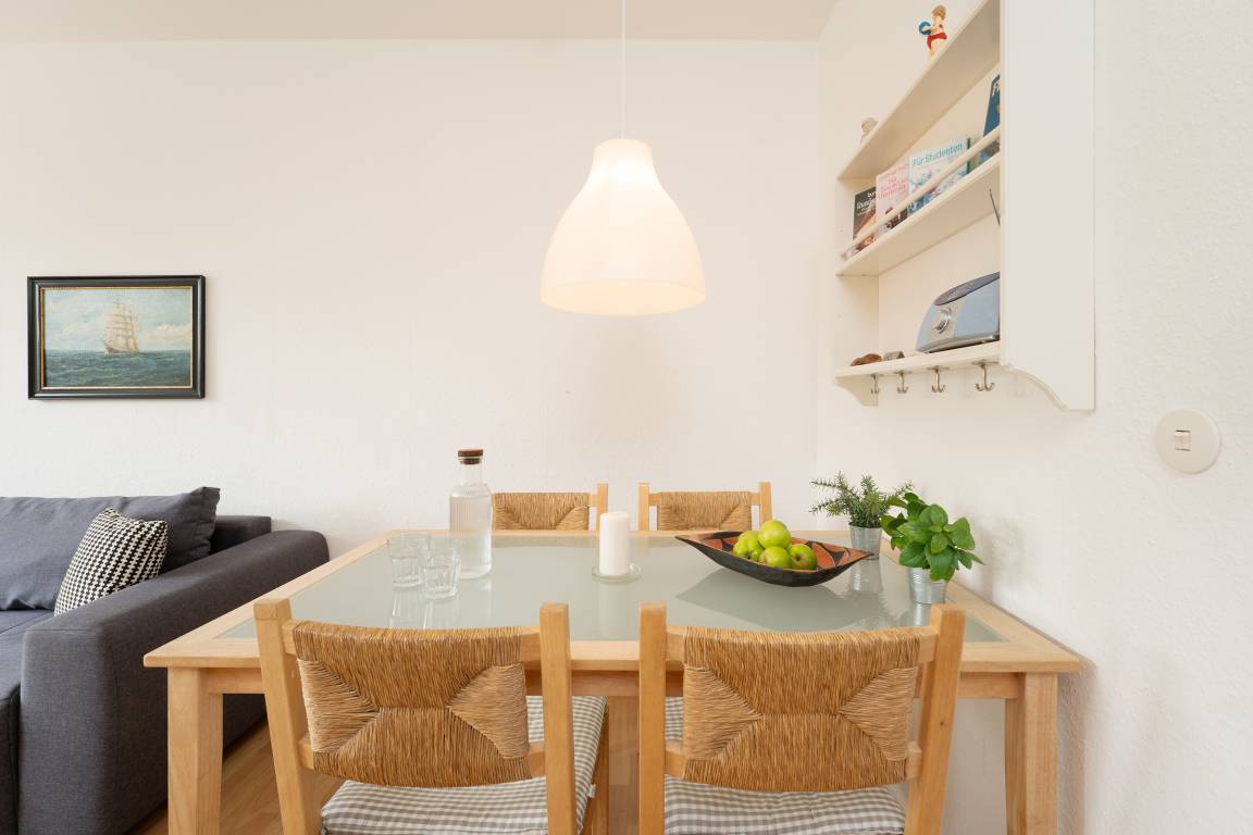 Die separate Küche ist voll ausgestattet und lässt keine Wünsche offen: Neben einem Backofen und Cerankochfeld stehen Ihnen auch eine Mikrowelle, eine Kaffeemaschine, ein Wasserkocher, ein Toaster sowie ein Kühlschrank zur Verfügung. Ein Esstisch lädt zum gemeinsamen Frühstück oder Abendessen ein.