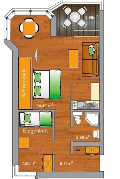 Im separaten Schlafzimmer können es sich Ihre Kinder in einem Etagenbett gemütlich machen, das aber auch für leichtere Erwachsene geeignet ist. In der Küche finden Sie Herd/Abzugshaube, Kühlschrank mit TK-Fach, Geschirrspüler, Mikrowelle mit Backfunktion, Wasserkocher, Toaster und Kaffeemaschine sowie alles Weitere, was Sie zum Wirken in der Küche benötigen. Sofern Sie zwischendurch Wäsche machen möchten, so finden Sie Waschmaschine und Trockner in unseren Gemeinschaftsräumen (gegen Gebühr). Auf Wunsch stellen wir Ihnen auch gerne kostenlos ein Bügelbrett mit Bügeleisen zur Verfügung.
