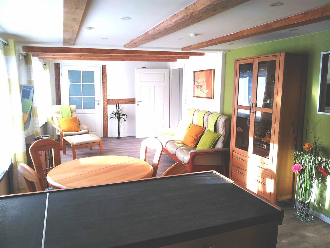Die frisch sanierte Altbauwohnung verfügt unter den schönen Fachwerkbalken über eine Deckenhöhe von ca. 2,00 bis 2,10m .