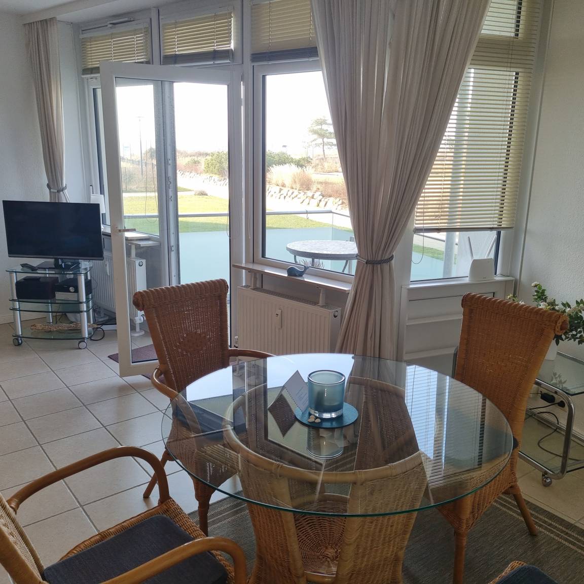 Die 69qm große 2-Zimmerwohnung verfügt über ein Schlafzimmer mit einem Doppelbett (2 Matratzen à 80 cm) und einen großen Wohnraum mit Essbereich für 3 Personen, eine vollausgestattete Küche, ein im Dezember 2025 saniertes Duschbad und 2 Balkons in Süd-West-Ausrichtung mit Blick auf das Meer. Der Strand ist nur 50m entfernt.