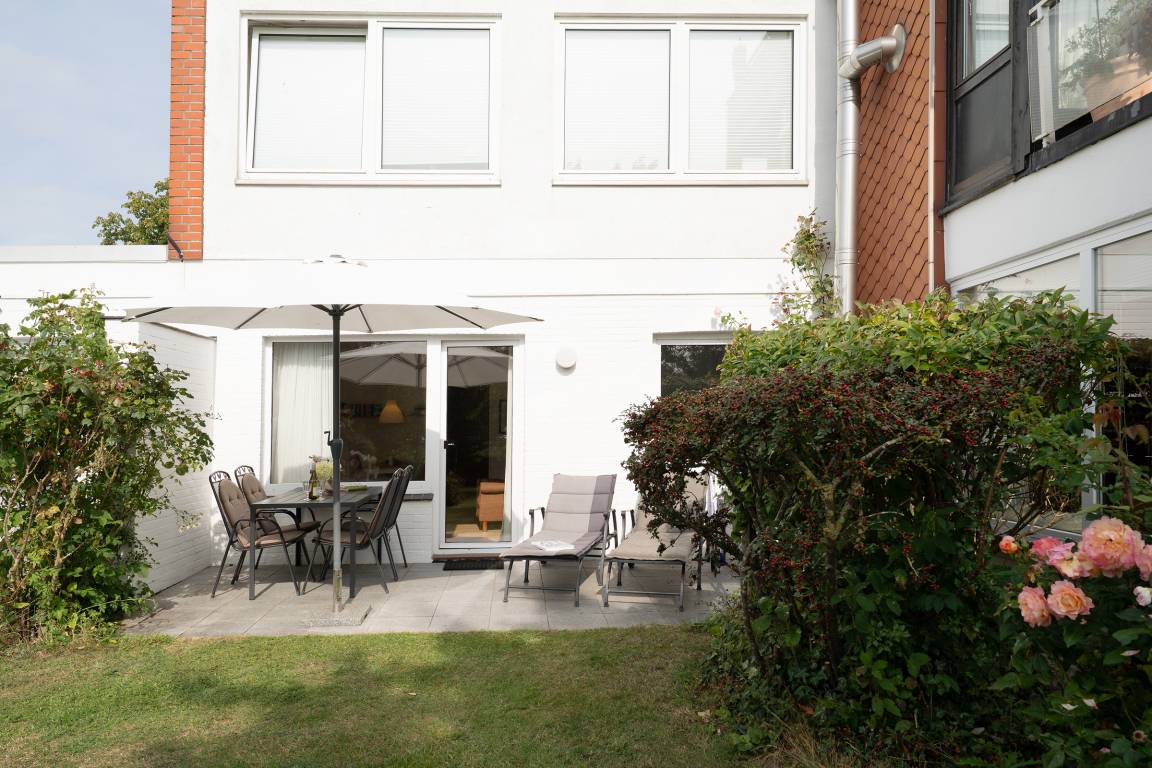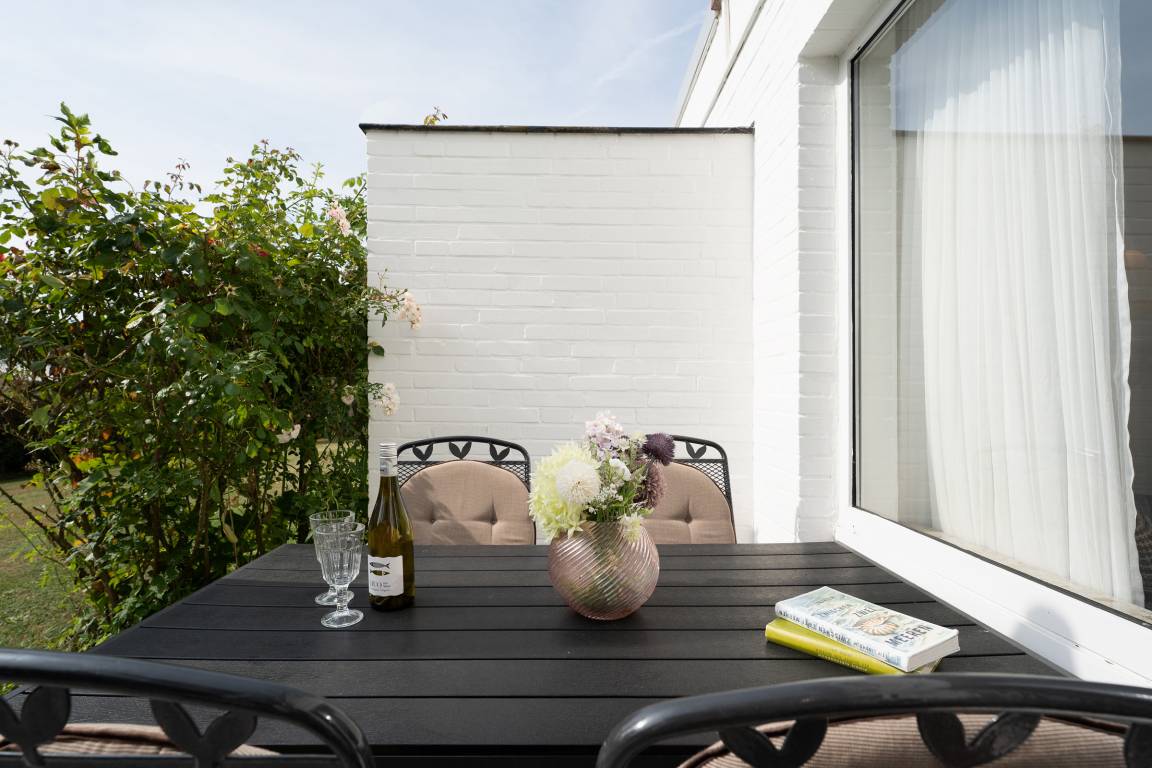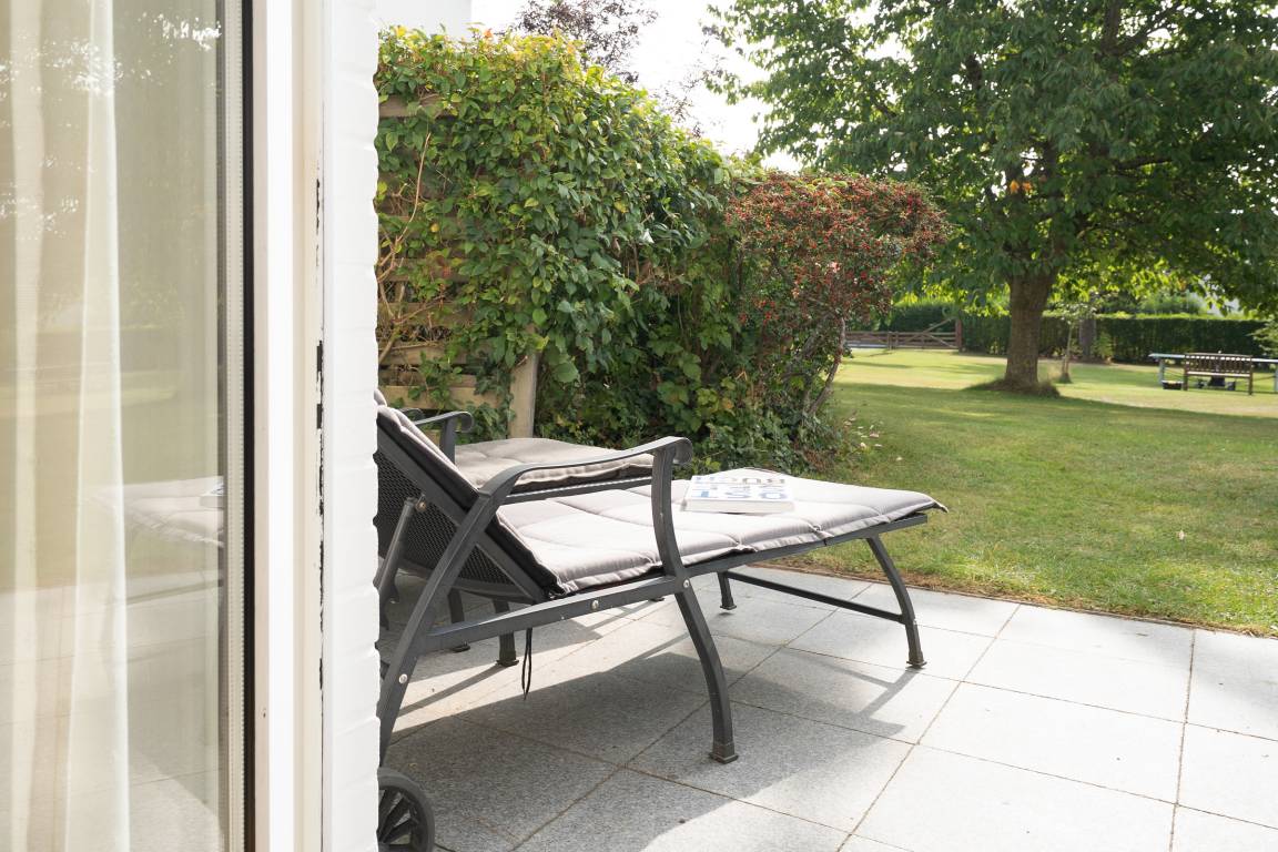 Der lichtdurchflutete Wohnbereich empfängt Sie mit gemütlicher Ausstattung, Fernseher und Radio. Von hier aus gelangen Sie auf die ca. 12 m² große Süd-West-Terrasse, die mit Gartenmöbeln ausgestattet ist und zum Entspannen einlädt. Auch ein Kohlegrill steht Ihnen für gesellige Abende zur Verfügung. Die separate Küche ist vollständig eingerichtet und bietet unter anderem Backofen, Geschirrspülmaschine, Kühlschrank, Mikrowelle und Kaffeemaschine. Zwei Schlafzimmer mit jeweils einem komfortablen Doppelbett versprechen erholsame Nächte. Das moderne Tageslicht-Badezimmer verfügt über eine Dusche (Einstiegshöhe 24 cm), WC, Haartrockner, Kosmetikspiegel sowie einen beheizbaren Handtuchhalter.