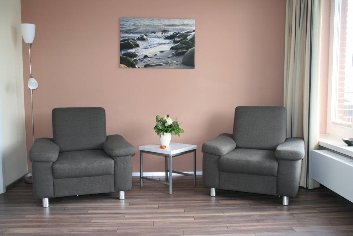 Über 32 m² bieten wir Ihnen in der 2. Etage den Komfort für zwei Personen, den Sie von einem erholsamen und wirklich besonderen Urlaub erwarten. Das Wohnzimmer ist ausgestattet mit zwei gemütlichen Einzelsesseln, einem Essplatz für zwei Personen (Esstisch vergrößerbar) sowie einem elektrisch ausfahrbaren Doppelbett 1,80 x 2,00 m, das auf Wunsch und Knopfdruck unsichtbar wird. In der Küche steht u.a. ein Geschirrspüler zur Verfügung sowie Kühlschrank mit TK-Fach, Mikrowelle mit Backfunktion, Wasserkocher, Toaster und Kaffeemaschine. Sofern Sie zwischendurch Wäsche machen möchten, so finden Sie Waschmaschine und Trockner in unseren Gemeinschaftsräumen (gegen Gebühr). Auf Wunsch stellen wir Ihnen auch gerne kostenlos ein Bügelbrett mit Bügeleisen zur Verfügung.