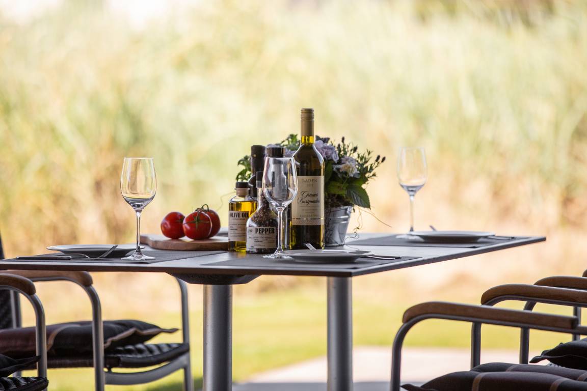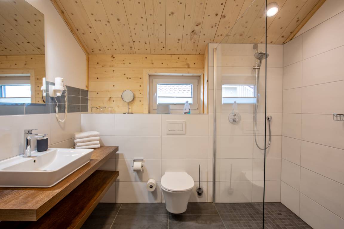 Die Skipperhäuser (Typ A plus) verfügen über zwei separate Schlafzimmer mit Boxspring-Doppelbetten. Der großzügige Wohnraum geht in den offenen Küchen- und Essbereich über. Der Kaminofen bildet das Zentrum des Wohnraumes und lädt zu gemütlichen Abenden ein. Vom Badezimmer mit ebenerdiger Dusche gibt es einen direkten Zugang zur Sauna. Die Terrasse mit Zugängen vom Wohn- und einem der Schlafzimmer rundet den Aufenthalt ab.