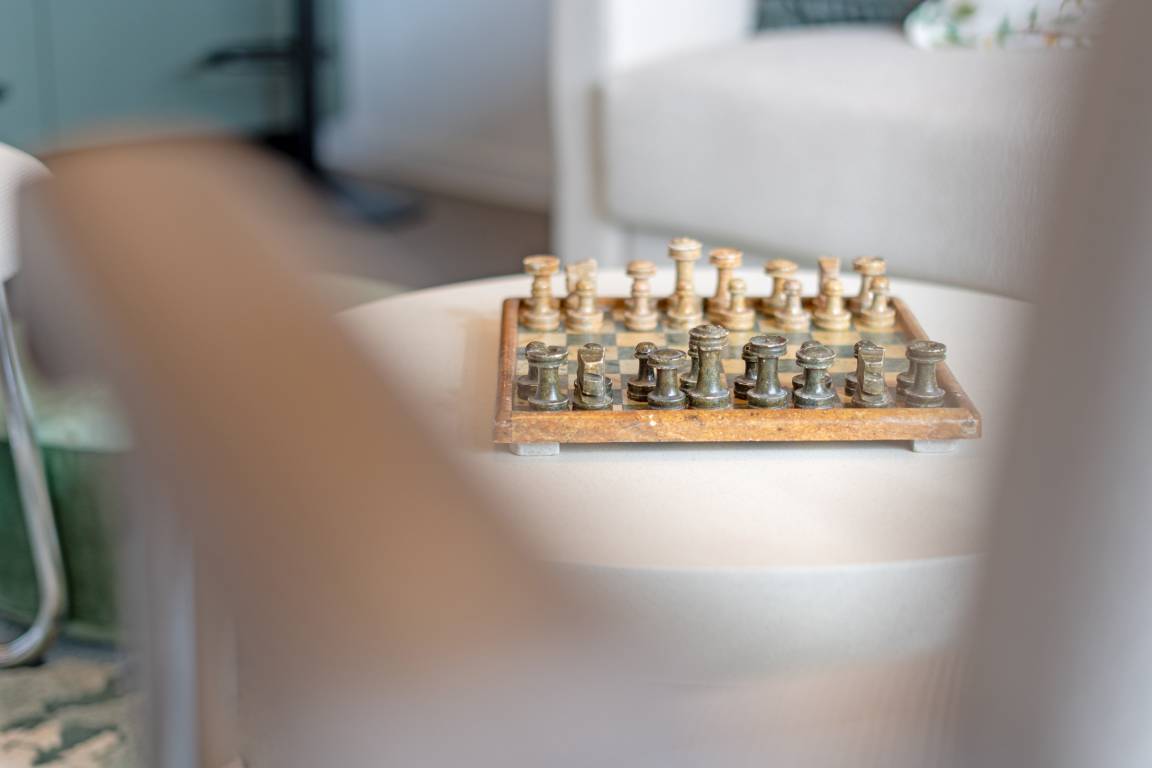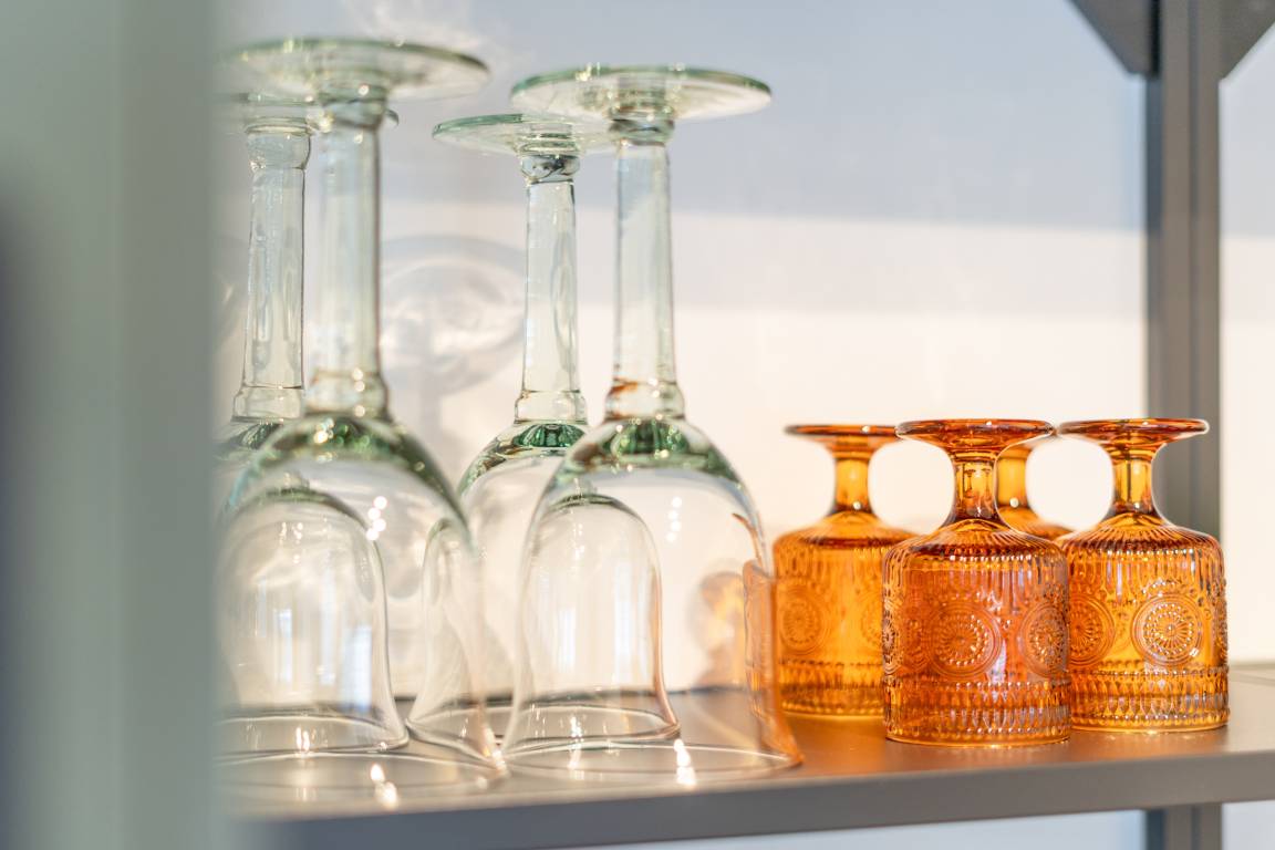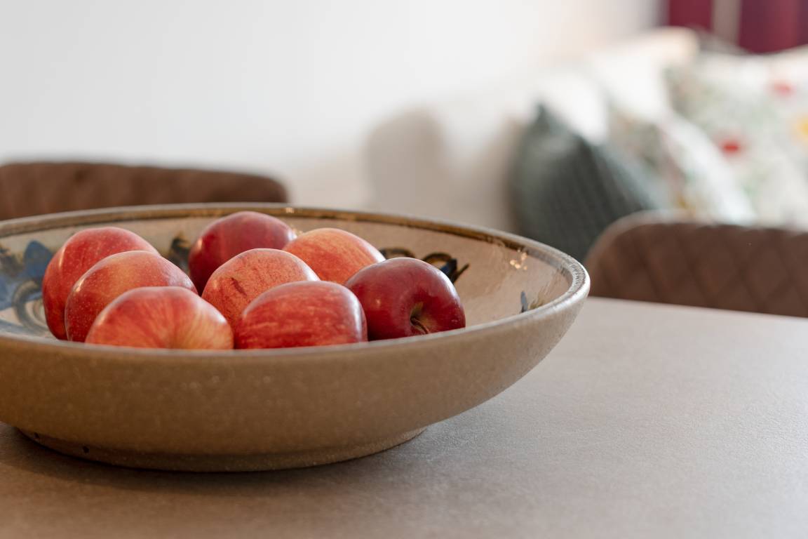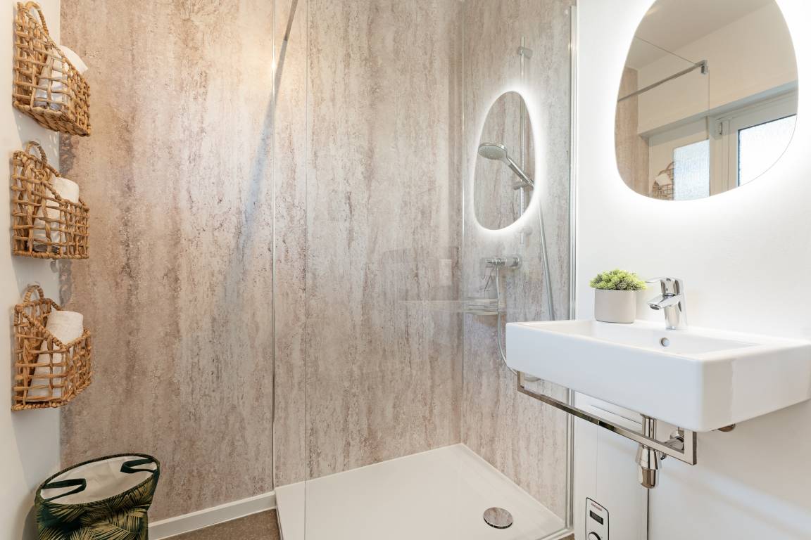 Die integrierte Küche ist gut ausgestattet mit Backofen, Geschirrspüler, Induktionskochfeld, Kühlschrank mit Gefrierfach, Kapselmaschine, Wasserkocher und Toaster. Ein Essbereich ist vorhanden. Das Tageslichtbad verfügt über Dusche/WC.