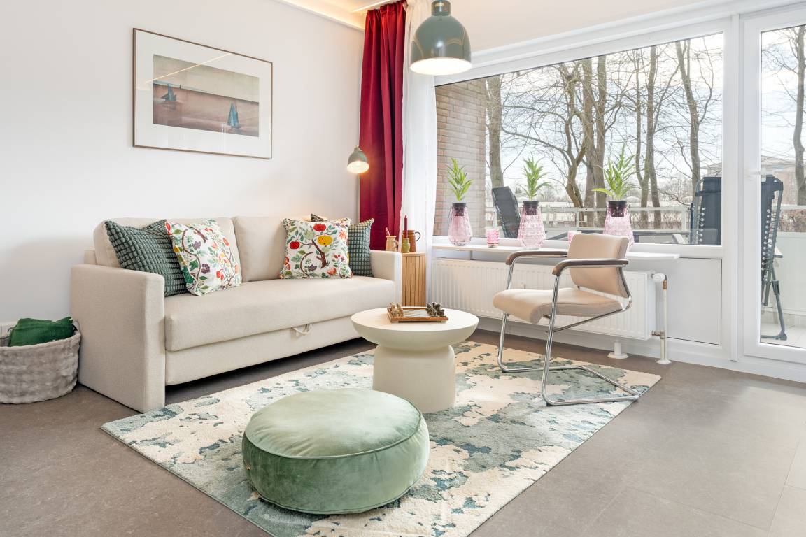 Der helle Wohnbereich vereint Wohnen, Schlafen und Entspannen. Ein komfortables Schlafsofa (160 x 200 cm) und Smart-TV sorgen für gemütliche Stunden. Von hier aus gelangen Sie auf den sonnigen Südbalkon mit Möbeln und Sonnenschirm. Zusätzlich steht ein Gemeinschaftsgarten mit Sandkasten zur Verfügung.