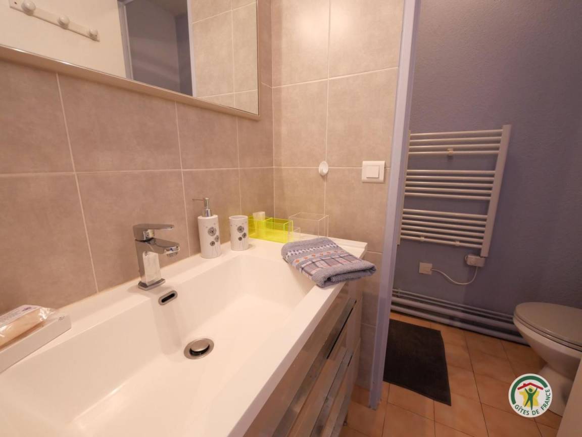 „Gîte agréable. Propre, confortable, bien décoré et bien équipé. Très calme (début octobre) Trois chambres avec porte-fenêtre sur l’extérieur, avec chacune salle d’eau et WC. Une pièce à l’entrée que l’on a apprécié permettant de ranger chaussures, bagages, manteaux etc…“