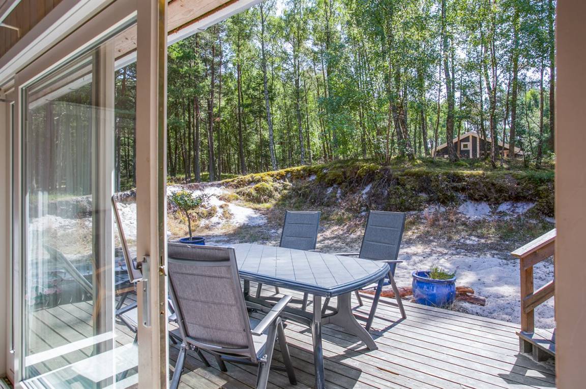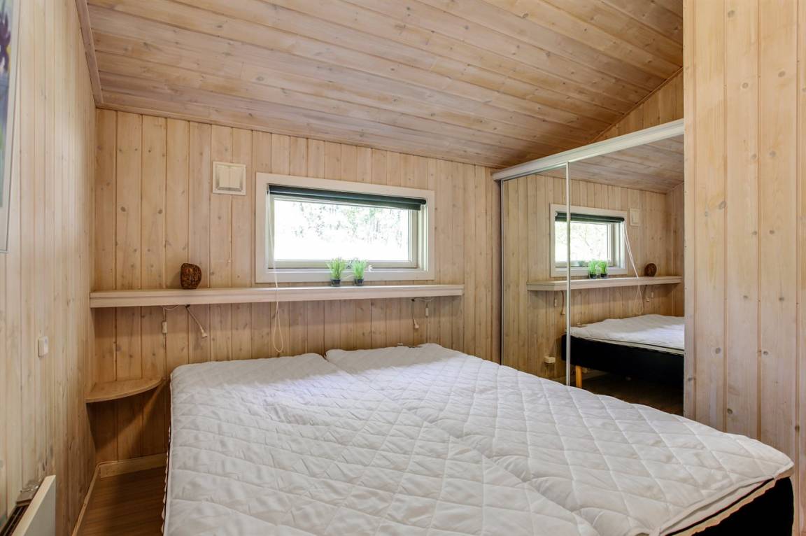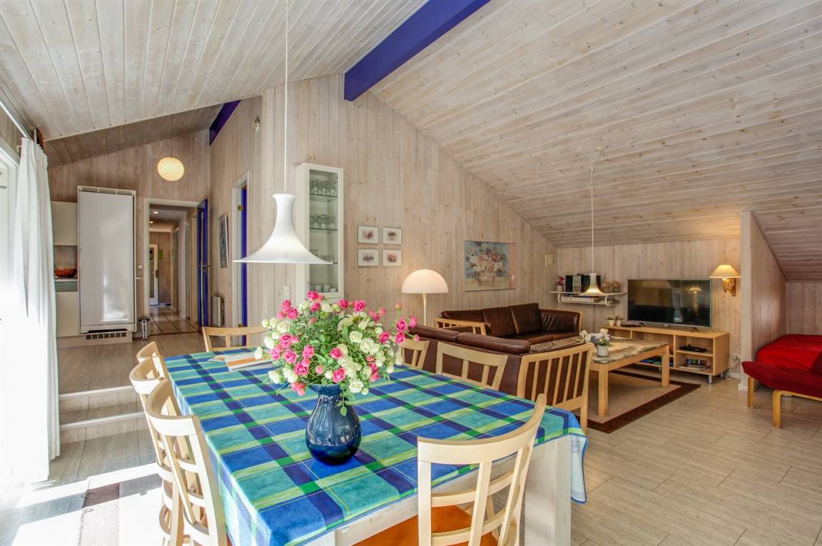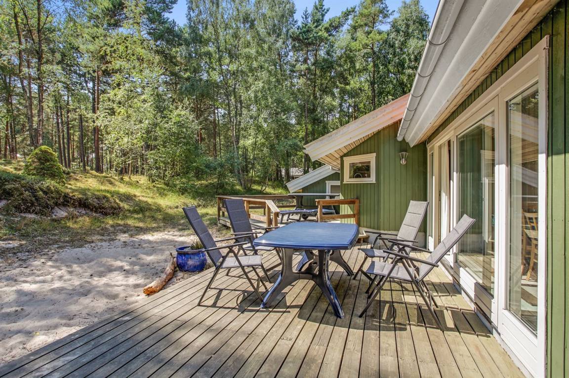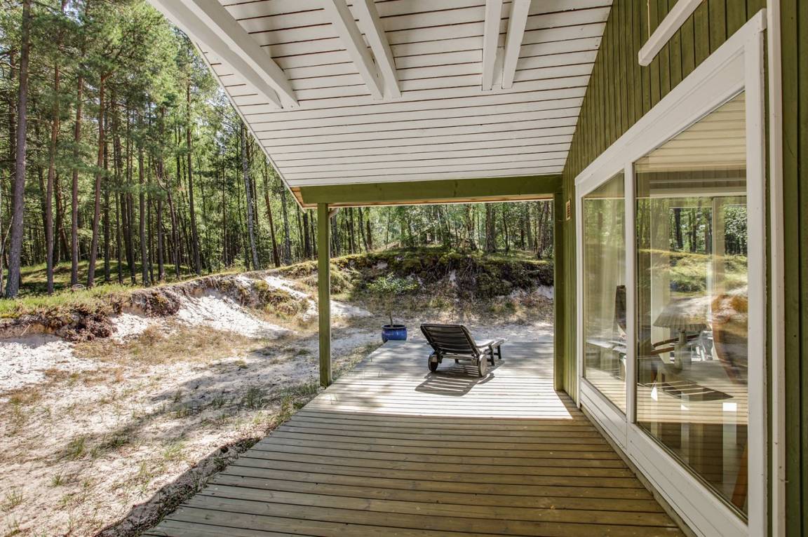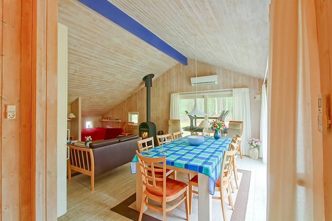Dieses exklusive und geräumige Ferienhaus aus Holz von 1998 liegt auf einem herrlichen, leicht bepflanzten Naturgrundstück mit Kiefern und Birken, nur 900 m vom weißen Badestrand Dueoddes entfernt.