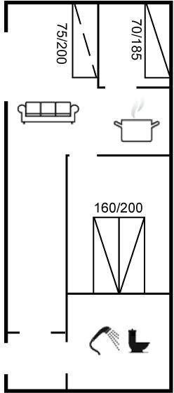 Badezimmer mit Fußbodenheizung und Duschnische. Die Küche ist mit dem Wohnzimmer kombiniert und enthält u. a. Herd mit Ceran-Feld und Umluftofen. Im Wohnzimmer finden Sie Kaminofen, Stereoanlage mit CD-Spieler sowie TV mit digitalem Satellitenanschluss. Ferner kostenlose, kabellose Internetverbindung (100/100 Mbit). Die Schlafplätze des Hauses verteilen sich auf 1 Zimmer mit Doppelbett, 1 Zimmer mit Einzelbett und 1 Schlafplatz auf einer Schlafcouch im Wohnzimmer.