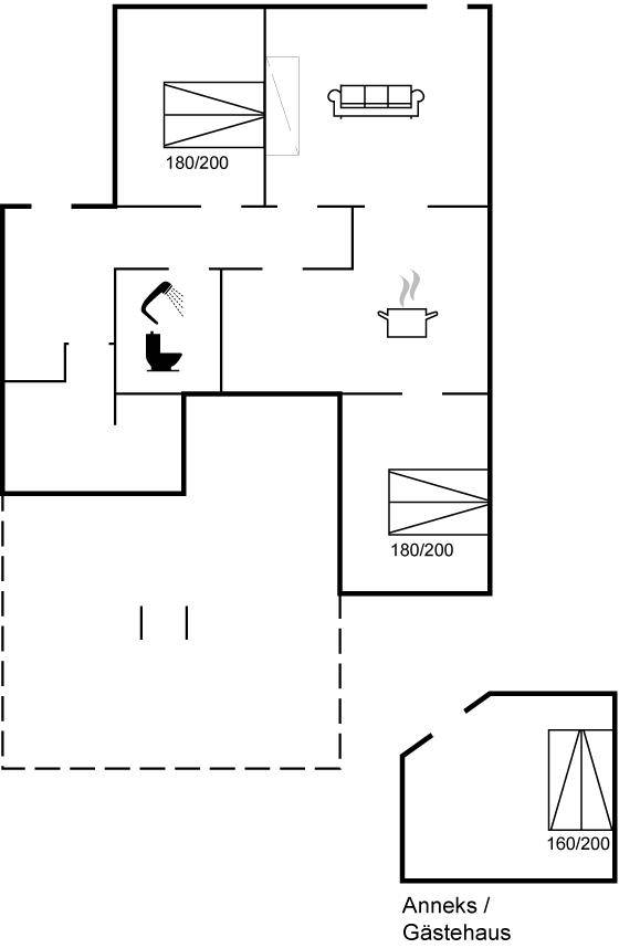 SchlafverhältnisseDie Schlafplätze verteilen sich auf 3 Schlafräume. 6 Schlafplätze in Doppelbetten. Ein Schlafplatz auf einer Schlafcouch. 2 von diesen Schlafplätzen befinden sich im Gästehaus, und 1 befindet sich im Wohnzimmer des Ferienhauses.