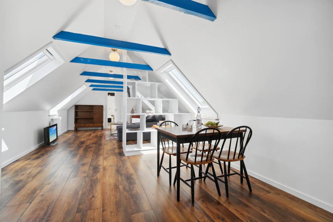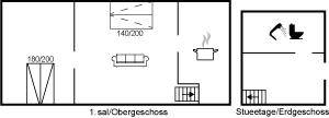 Die Wohnfläche verteilt sich auf 2 Etagen wo das Badezimmer sowie der Eingangsbereich im Erdgeschoss liegen und die restlichen Räume im Obergeschoss liegen.