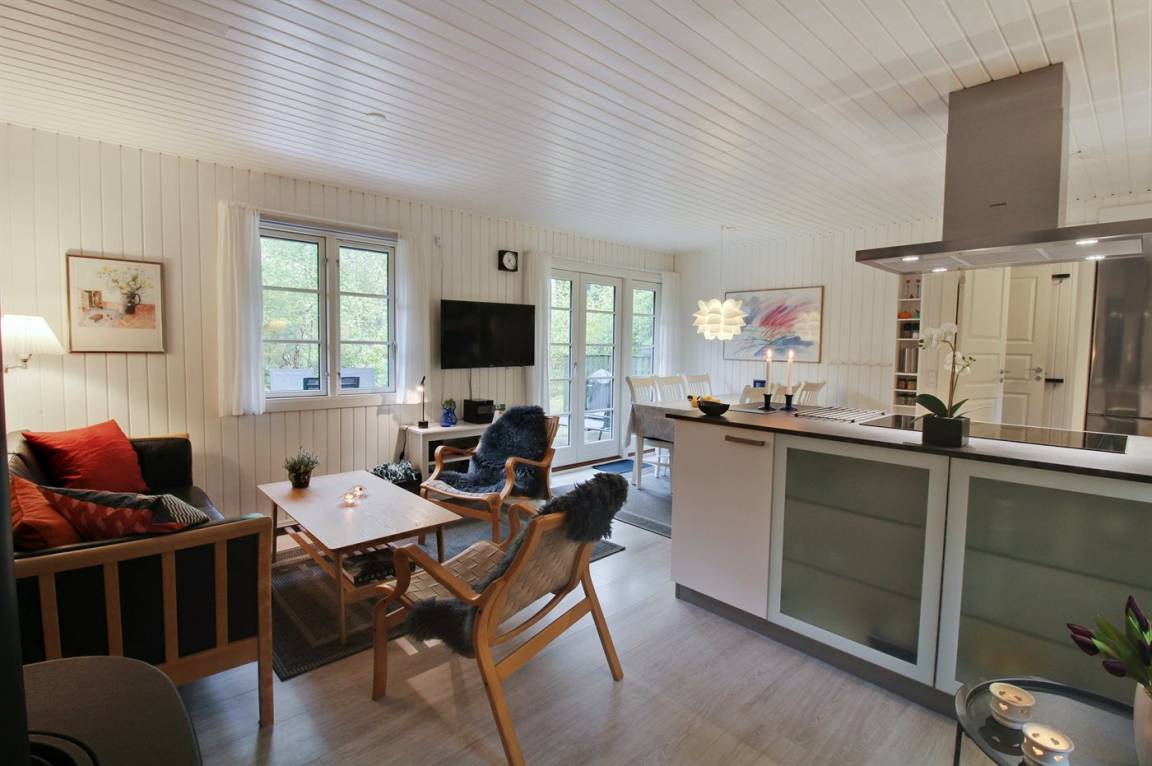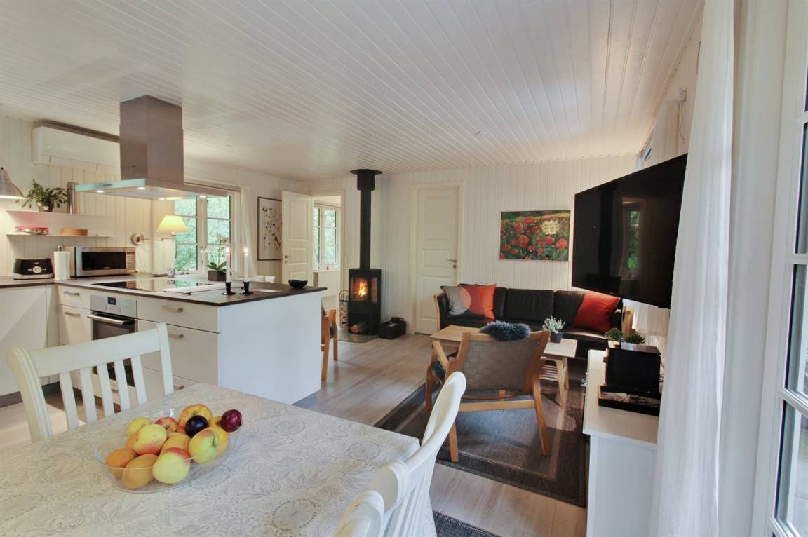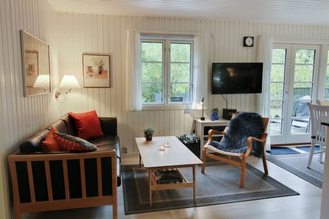 Im gemütlichen Wohnzimmer, mit heller Möblierung im skandinavischen Stil, gibt es einen Kaminofen und Ferneseher mit mehr als 3 deutsche Fernsehsender. Vom Wohnzimmer haben Sie ferner Zutritt zu einer Terrasse mit Gartenmöbeln und Weber-Grill.