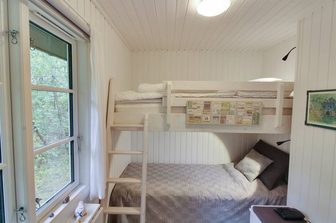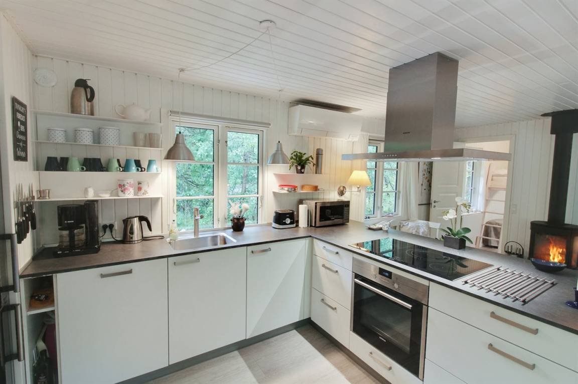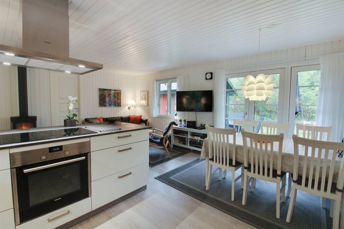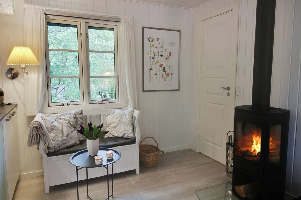 Im gemütlichen Wohnzimmer, mit heller Möblierung im skandinavischen Stil, gibt es einen Kaminofen und Ferneseher mit mehr als 3 deutsche Fernsehsender. Vom Wohnzimmer haben Sie ferner Zutritt zu einer Terrasse mit Gartenmöbeln und Weber-Grill.