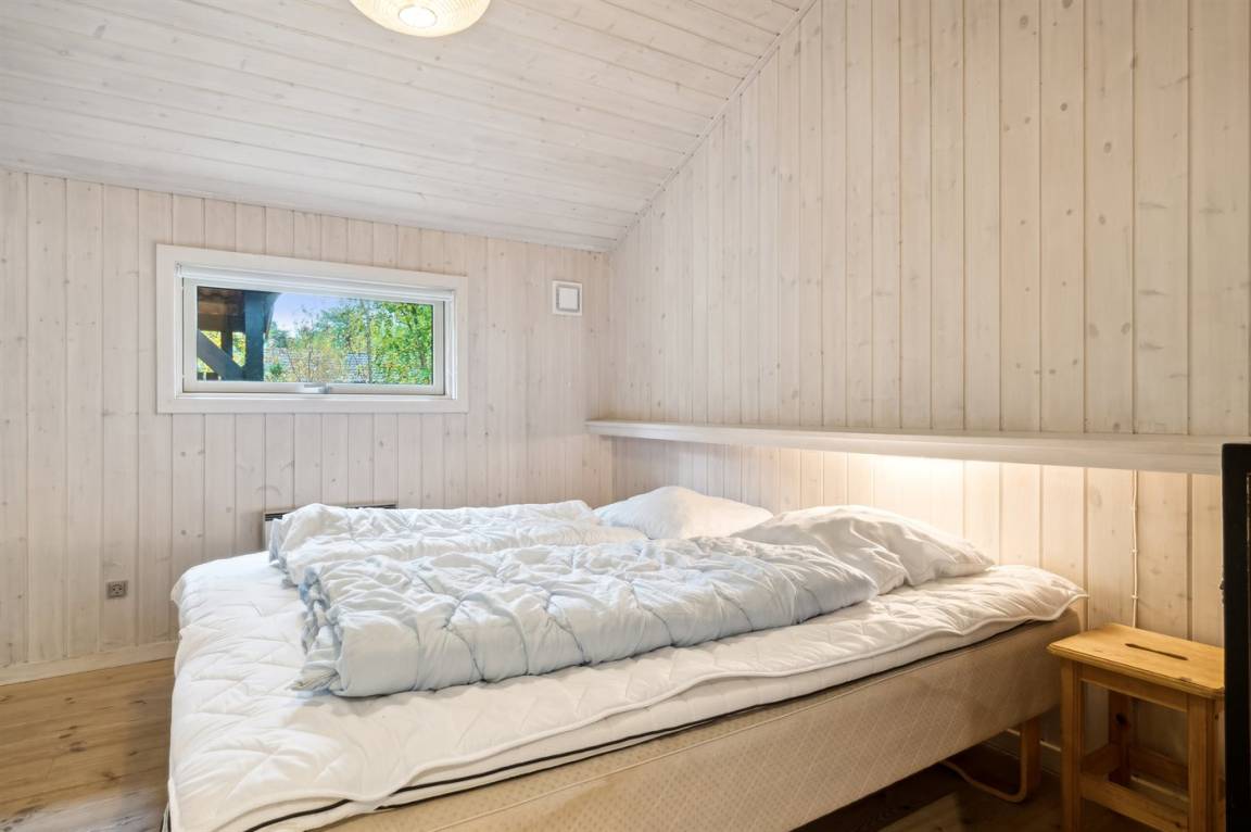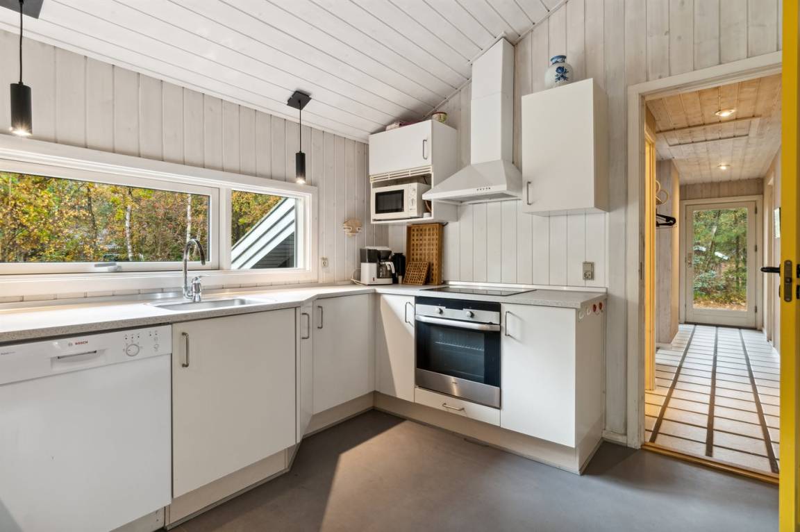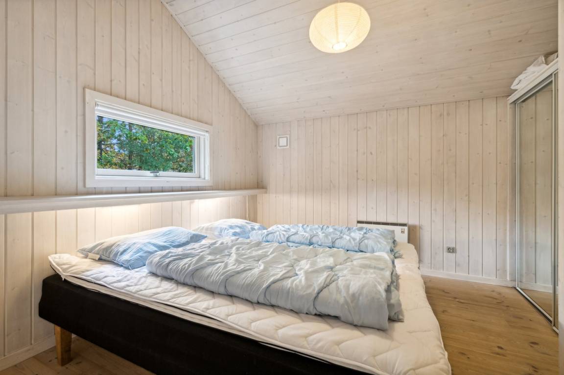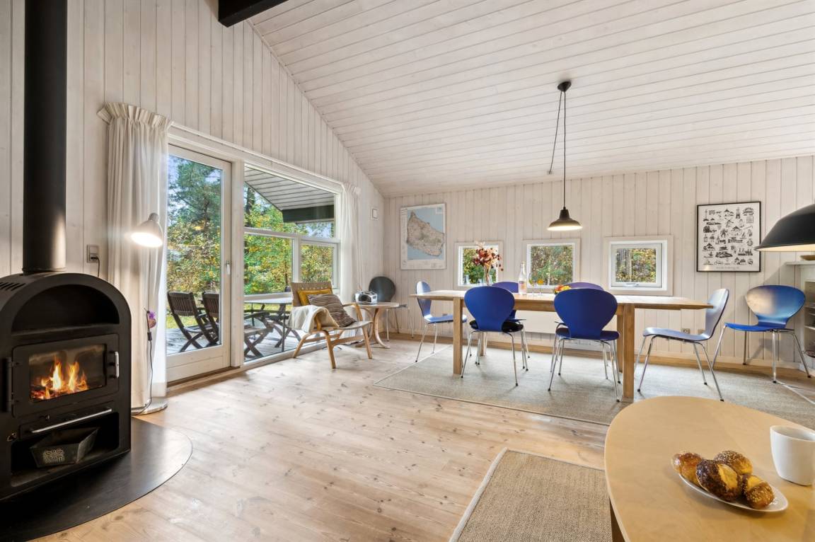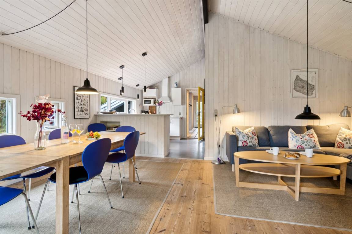 Das Haus ist mit einem großen Wohnzimmer mit offener Küche eingerichtet und bietet direkten Zugang vom Wohnzimmer auf die große Holzterrasse, wo man ungestört die Sonne genießen kann. Die Familie kann sich hier zu einem schnellen Sommermittagessen in der ruhigen Umgebung versammeln. Helle Holzwände und -decken sowie weiß laminiertes Kiefernholzboden verstärken das luftige Raumgefühl. Mit drei Schlafzimmern und zwei Badezimmern, von denen eines mit Whirlpool und Sauna ausgestattet ist, gibt es ausreichend Platz für alle.