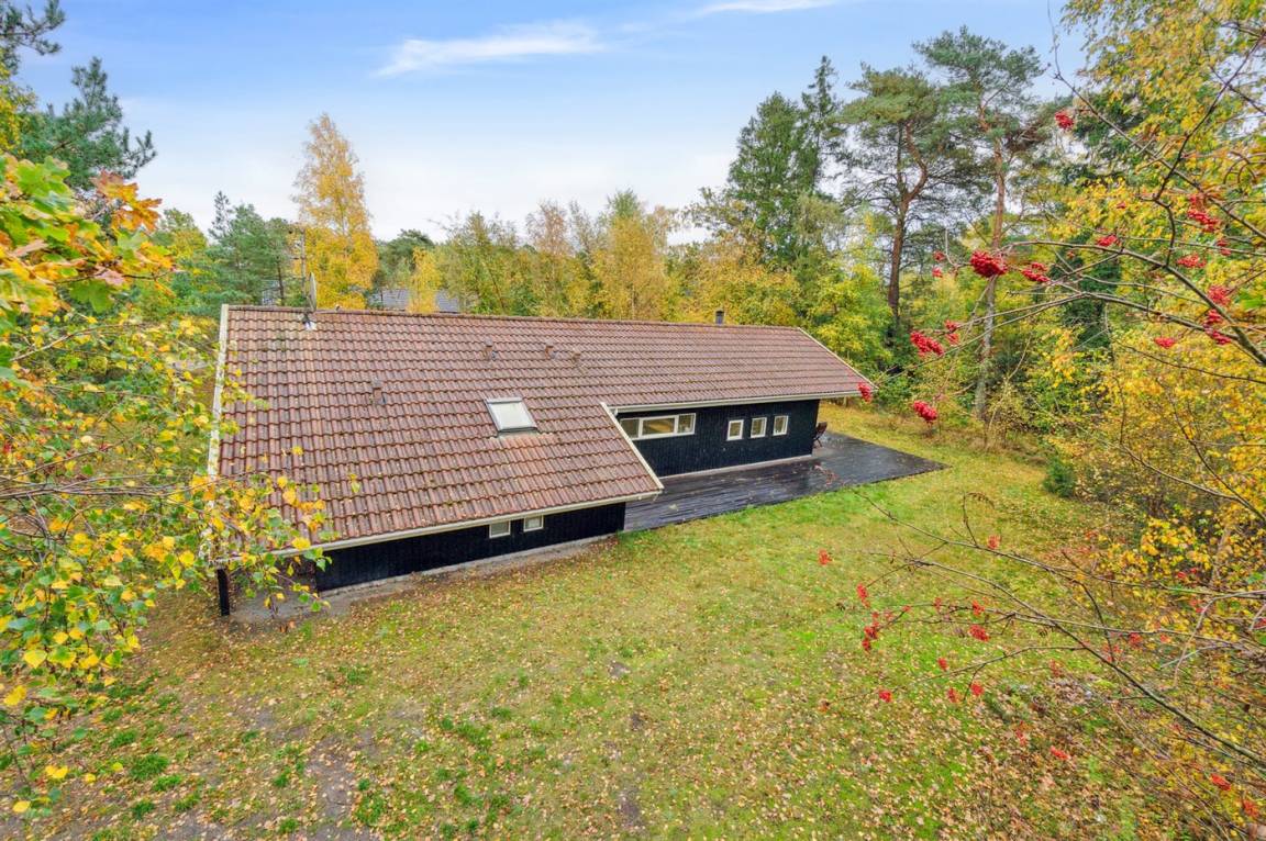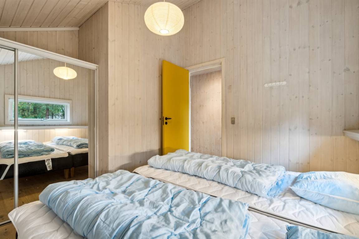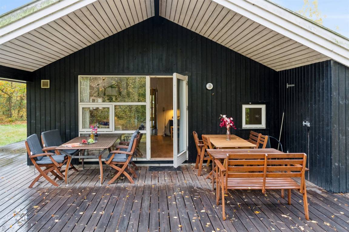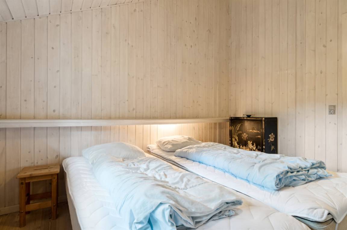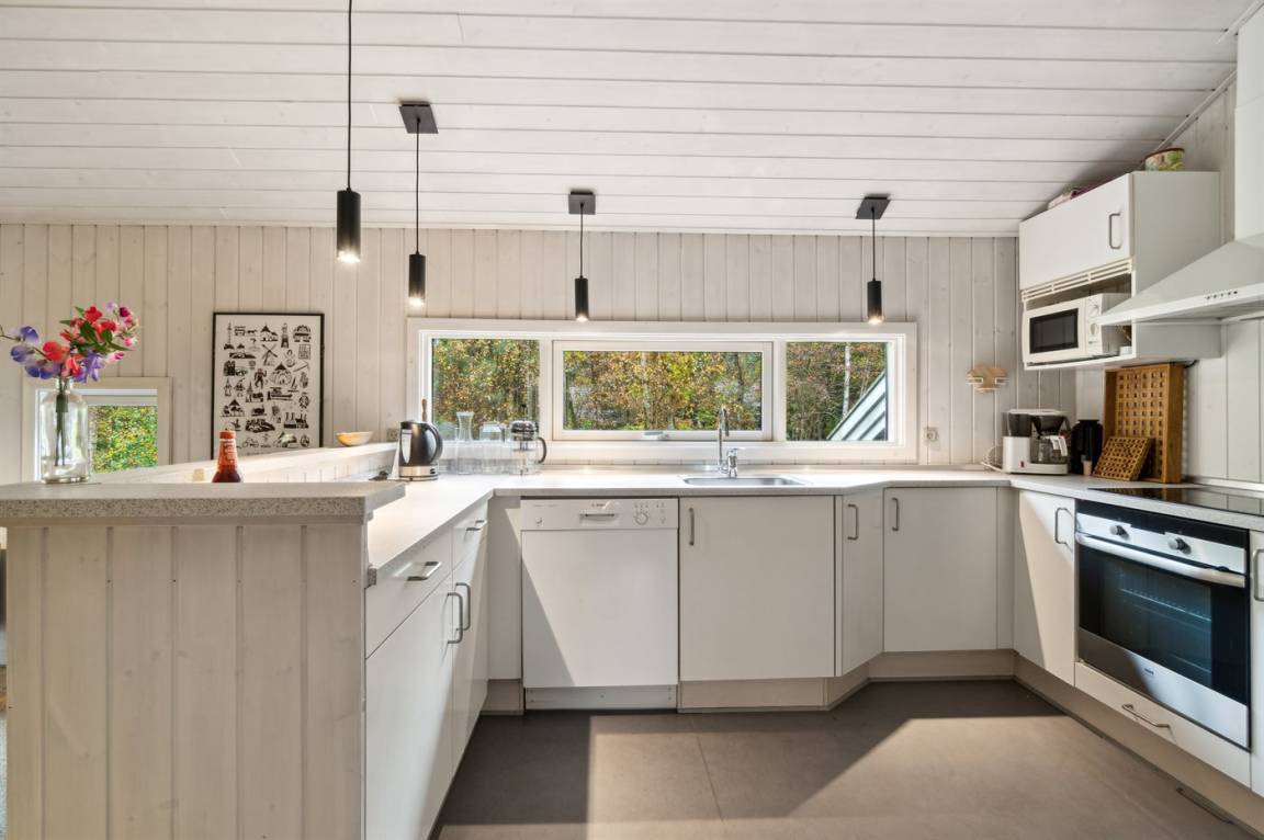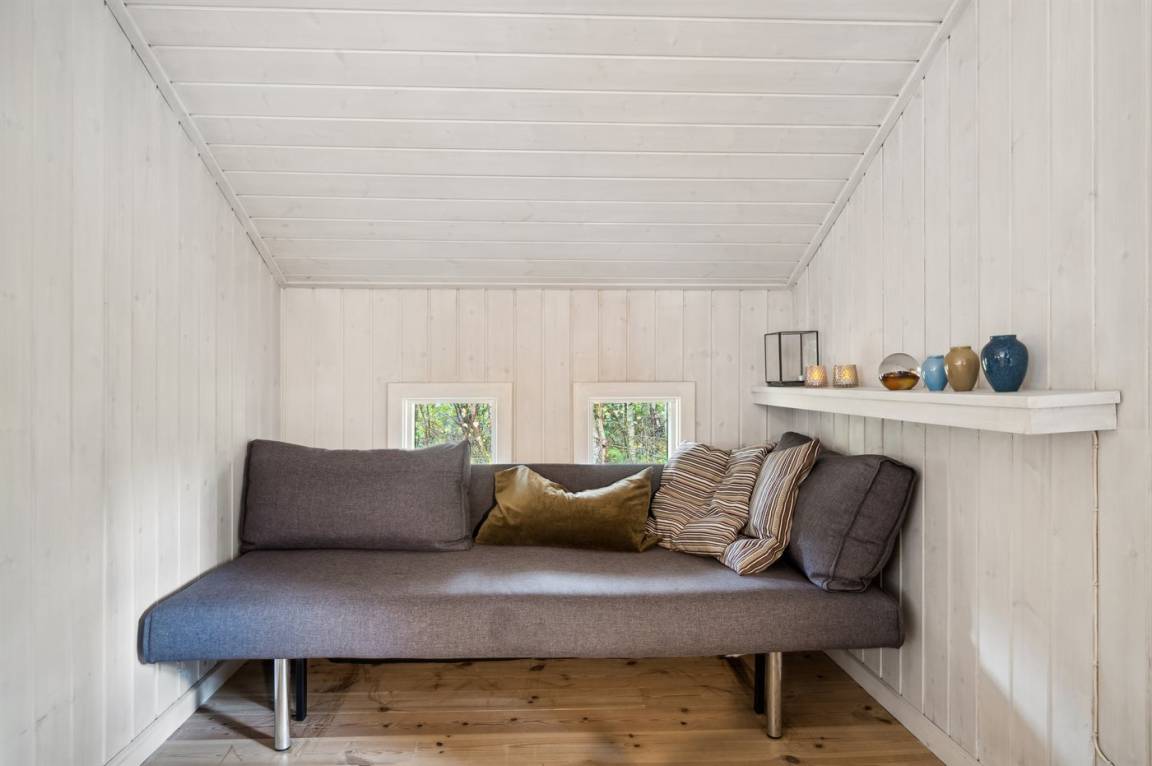 Das Haus ist mit einem großen Wohnzimmer mit offener Küche eingerichtet und bietet direkten Zugang vom Wohnzimmer auf die große Holzterrasse, wo man ungestört die Sonne genießen kann. Die Familie kann sich hier zu einem schnellen Sommermittagessen in der ruhigen Umgebung versammeln. Helle Holzwände und -decken sowie weiß laminiertes Kiefernholzboden verstärken das luftige Raumgefühl. Mit drei Schlafzimmern und zwei Badezimmern, von denen eines mit Whirlpool und Sauna ausgestattet ist, gibt es ausreichend Platz für alle.