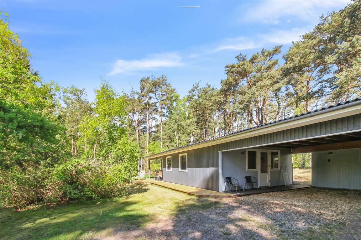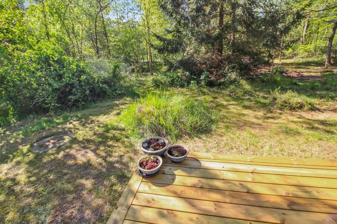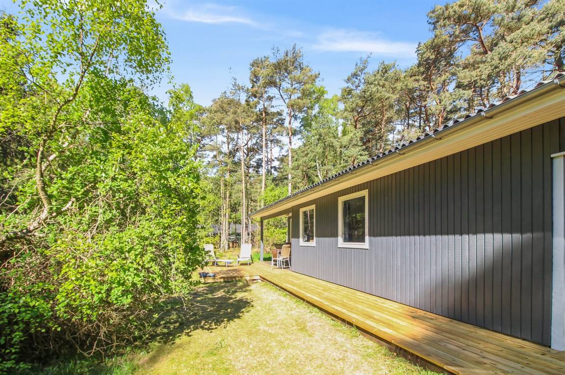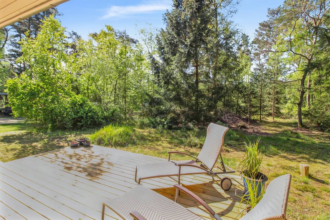 Gepflegtes und hübsch eingerichtetes Ferienhaus auf einem sehr großen Grundstück in einem attraktiven Ferienhausgebiet. Ein 18-Loch-Golfplatz und ein schöner Sandstrand befinden sich ganz in der Nähe. Vom Haus aus hat man Blick auf die dicht bewachsene grüne Umgebung mit hohen Fichten.