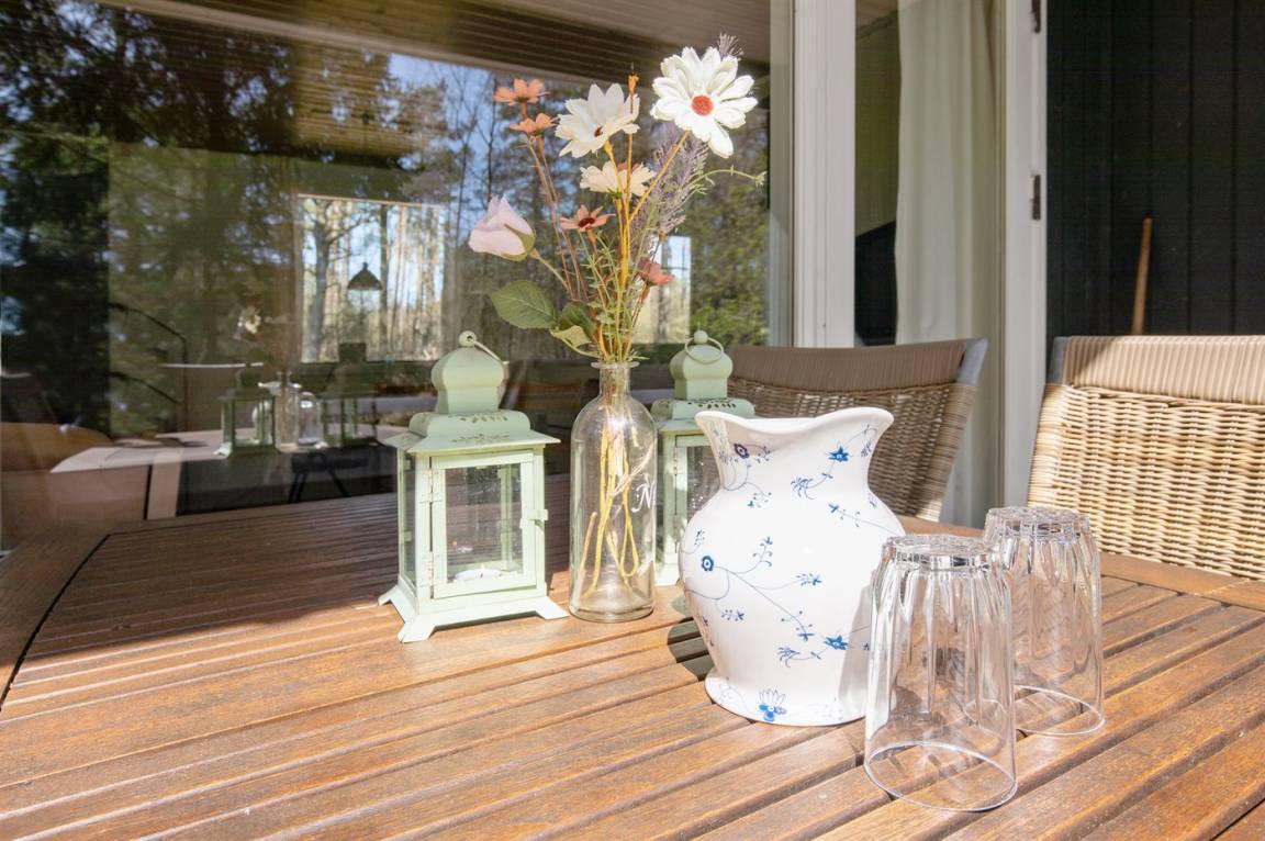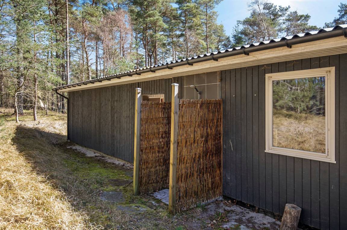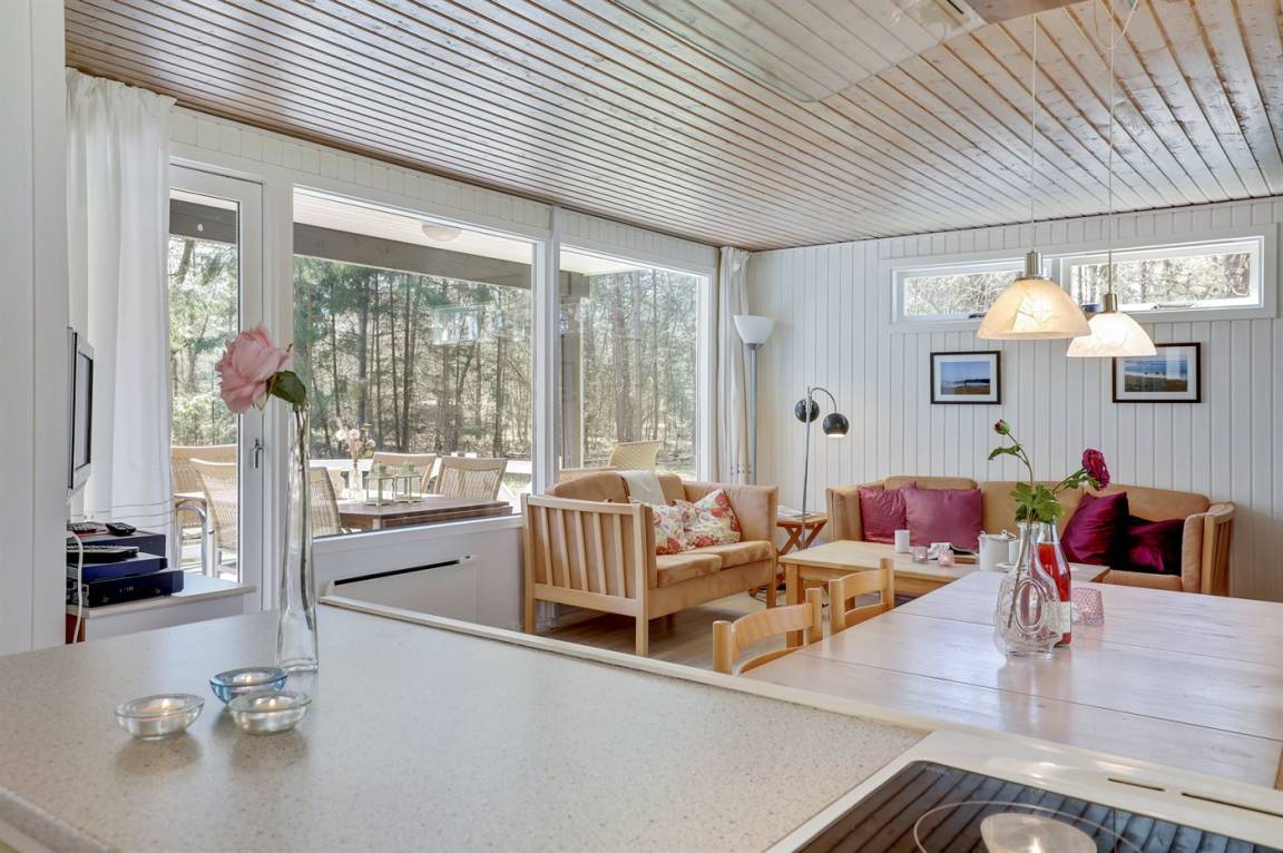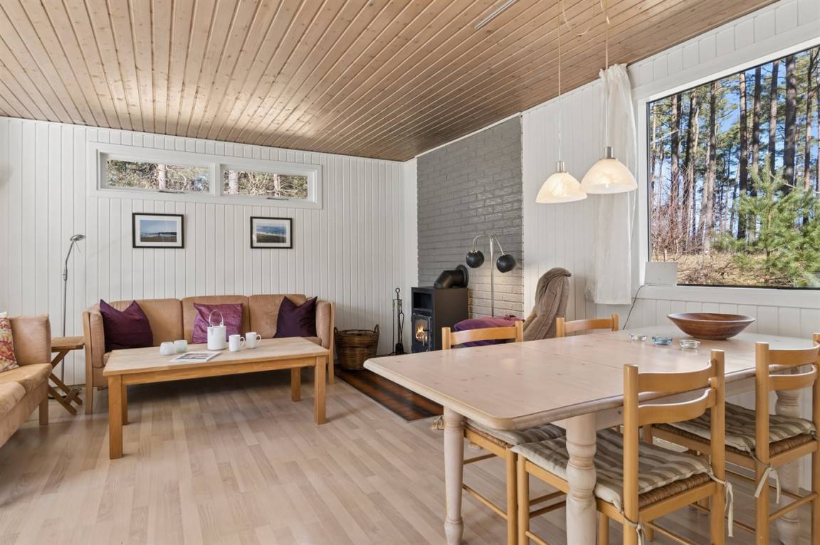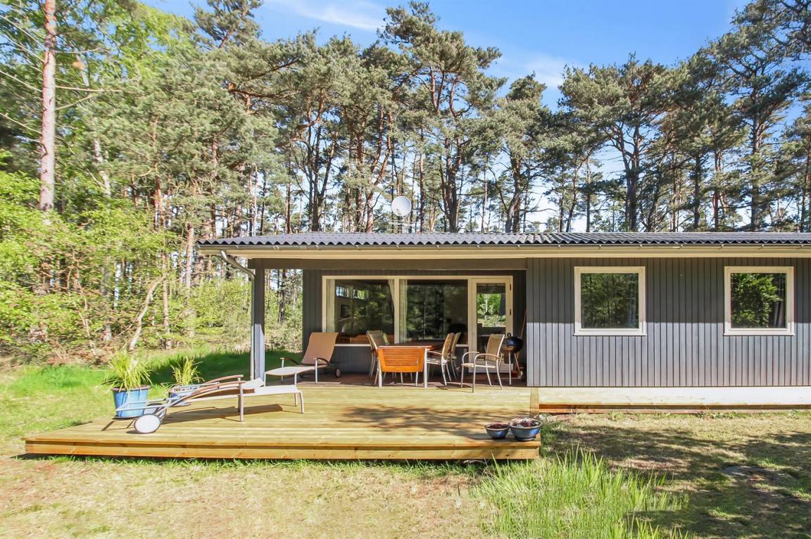 Gepflegtes und hübsch eingerichtetes Ferienhaus auf einem sehr großen Grundstück in einem attraktiven Ferienhausgebiet. Ein 18-Loch-Golfplatz und ein schöner Sandstrand befinden sich ganz in der Nähe. Vom Haus aus hat man Blick auf die dicht bewachsene grüne Umgebung mit hohen Fichten.