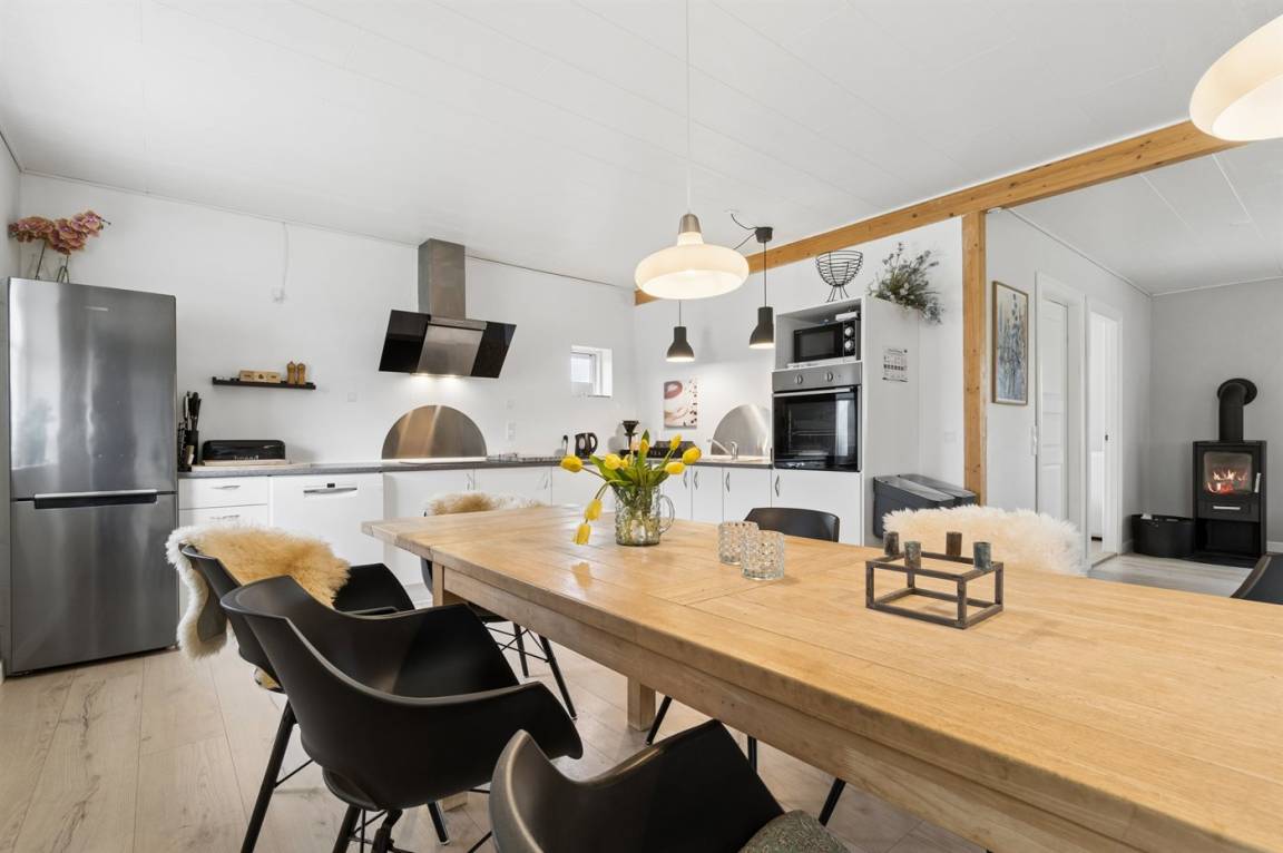 Das Ferienhaus ist über 2 Etagen gut eingerichtet und nach der Modernisierung 2016 präsentiert sich das Interieur einladend, hell und modern, mit einem größeren Küchenbereich. Helles Badezimmer und Gäste-Toilette. Großes, gemütliches Wohnzimmer mit Panoramafenstern und direktem Zugang zur teilweisen überdachten Terrasse, auf der man die Sonne, die Natur genießen und insgesamt gemeinsam Zeit verbringen kann – für Groß und Klein.