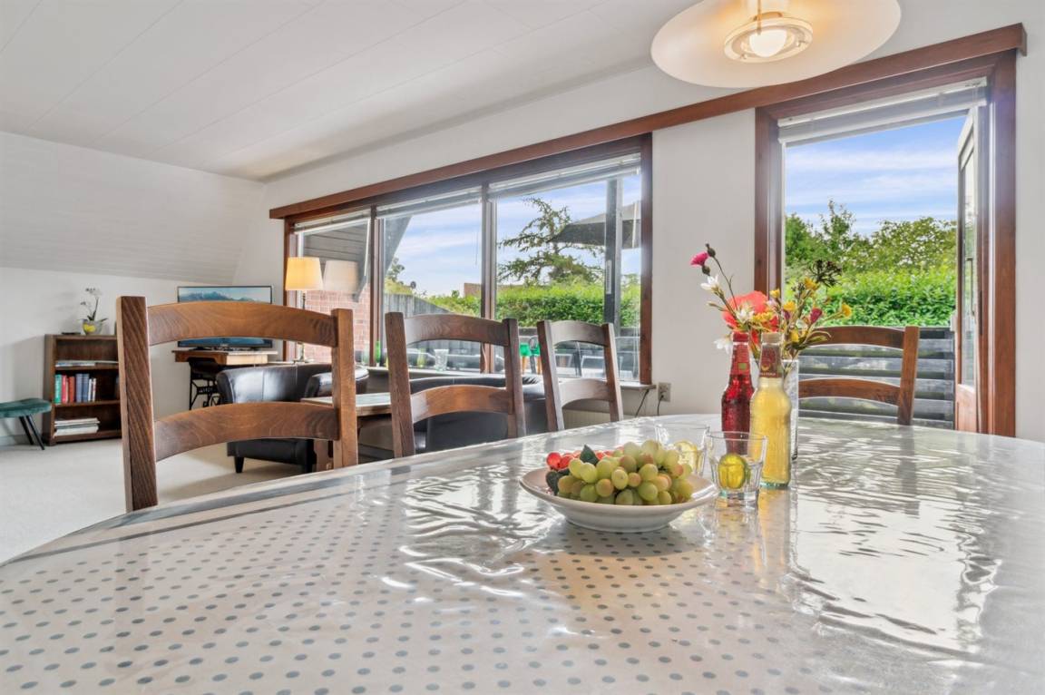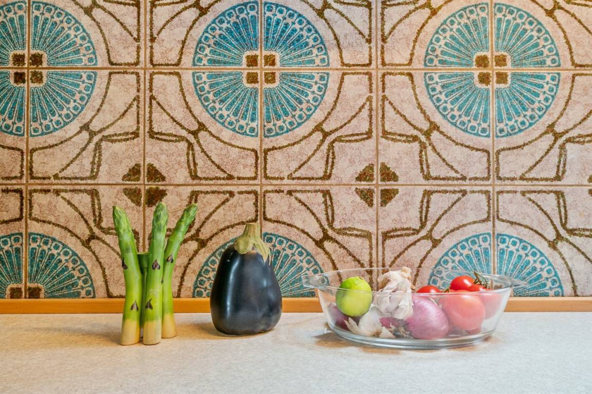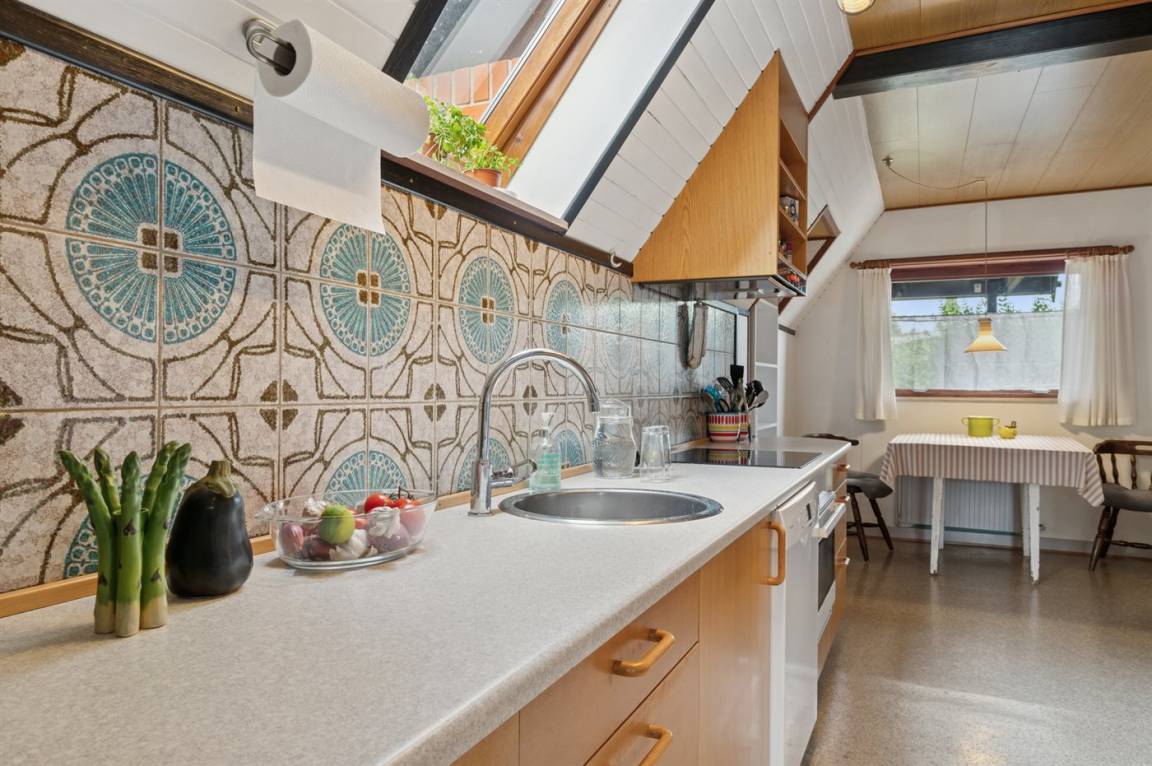 Trotz der großen Dachschräge eines A-Hauses wirken die Räume hell und einladend. Die Küche ist älteren Datums, verfügt jedoch u. a. über einen neuen Geschirrspüler und eine Mikrowelle. Hier findest du alles, was du zur Zubereitung leckerer Urlaubsmahlzeiten benötigst.