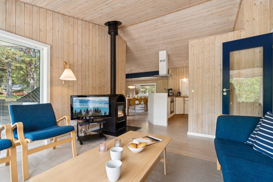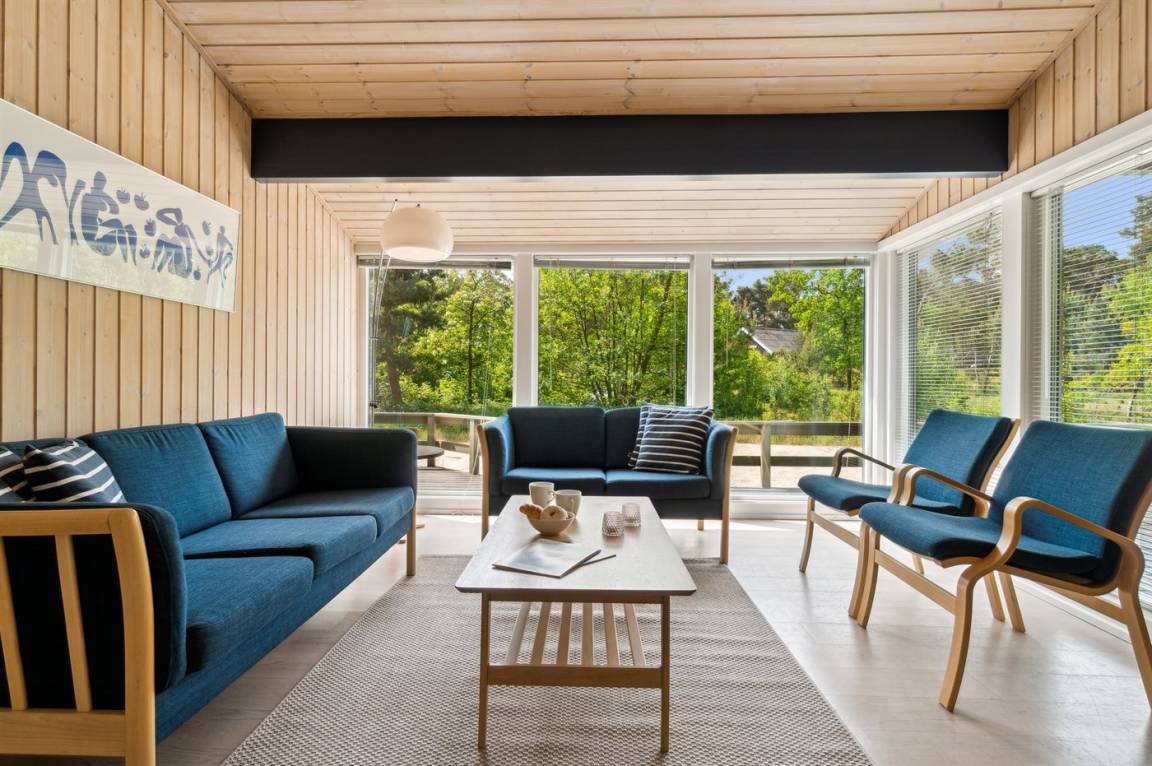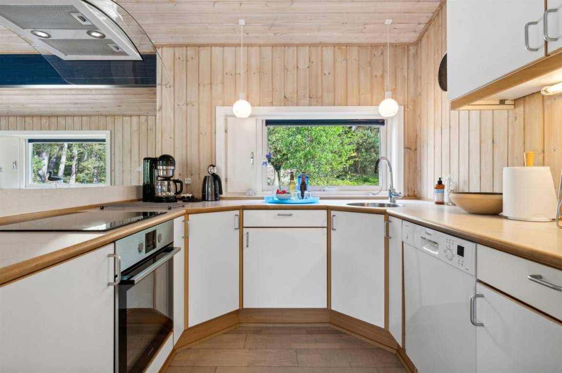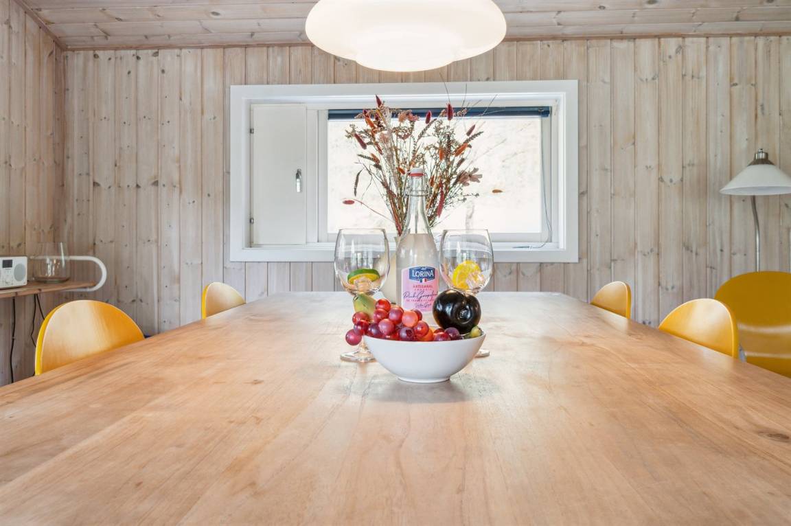 Das Herz des Hauses ist das Wohnzimmer, das gut möbliert ist mit Qualitätsmöbeln - helle Böden, Wände und Decken verleihen der Innenumgebung ein angenehmes Gefühl. Gut ausgestattete Küche mit dem Essbereich in der Nähe, damit das Servieren leicht vonstatten gehen kann, wenn die Familie zusammenkommt. Alles in allem bietet das Ferienhaus ein gutes und sorgloses Urlaubserlebnis - sowohl drinnen als auch auf den großen Holzterrassen, die teilweise überdacht sind. Der herrliche Sandstrand bei Jomfrugård lädt zu einem Bad oder einfach nur zum Genießen der Sonne in der schönen Umgebung ein.