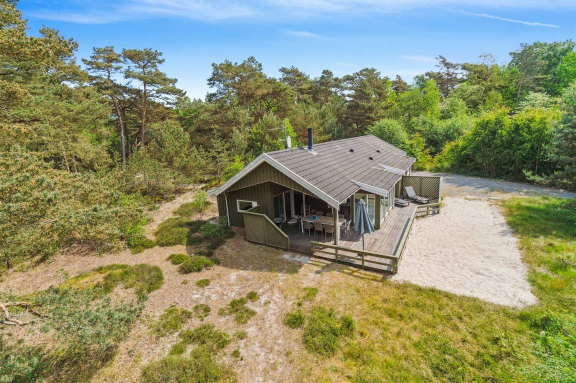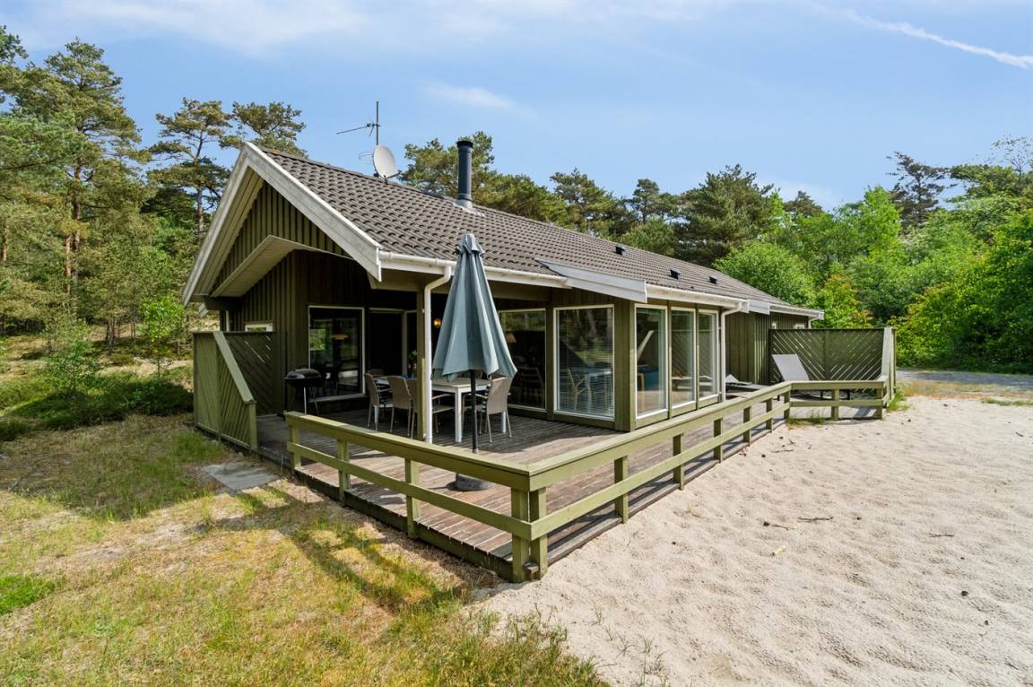 Modernes Ferienhaus, eingerichtet mit sowohl Spa als auch Sauna, damit Platz für Wellness im Urlaub ist. Das Ferienhaus liegt auf einem größeren Naturgrundstück, wo man die Form der Dünen im leicht hügeligen Gelände erahnen kann, wo sowohl Sand, Heidekraut als auch leichter Kiefernwald wachsen.