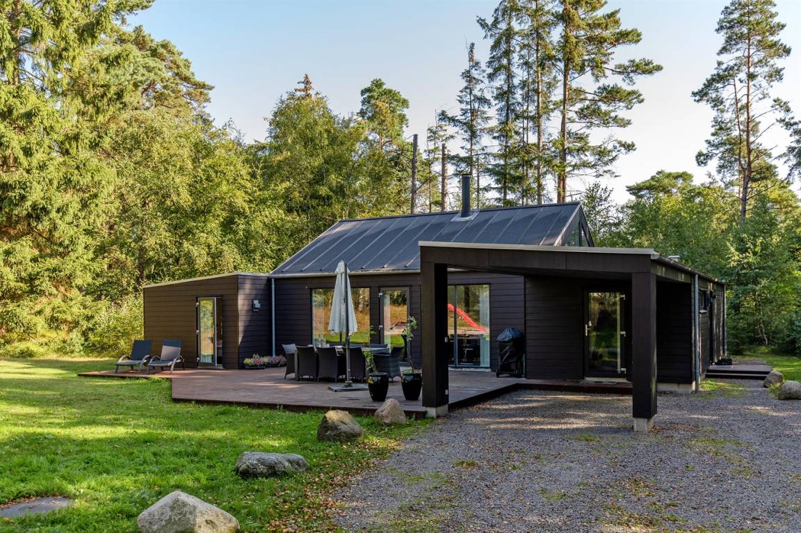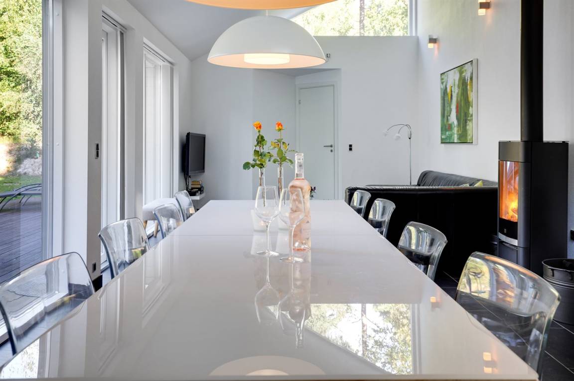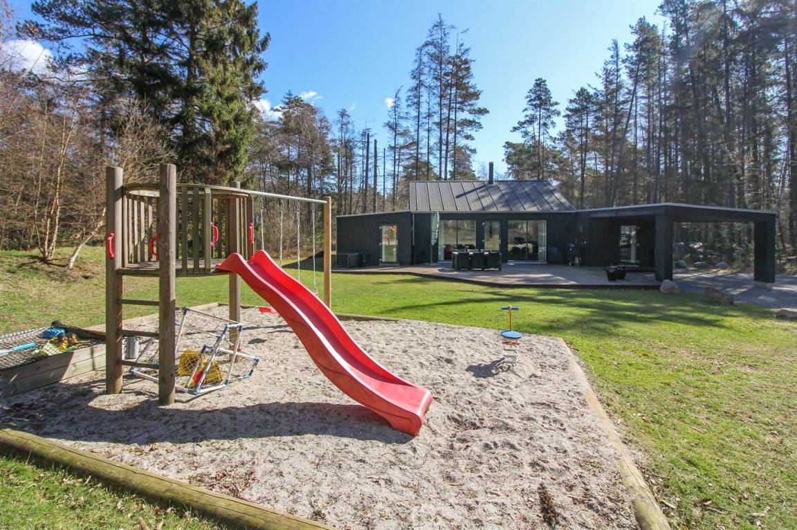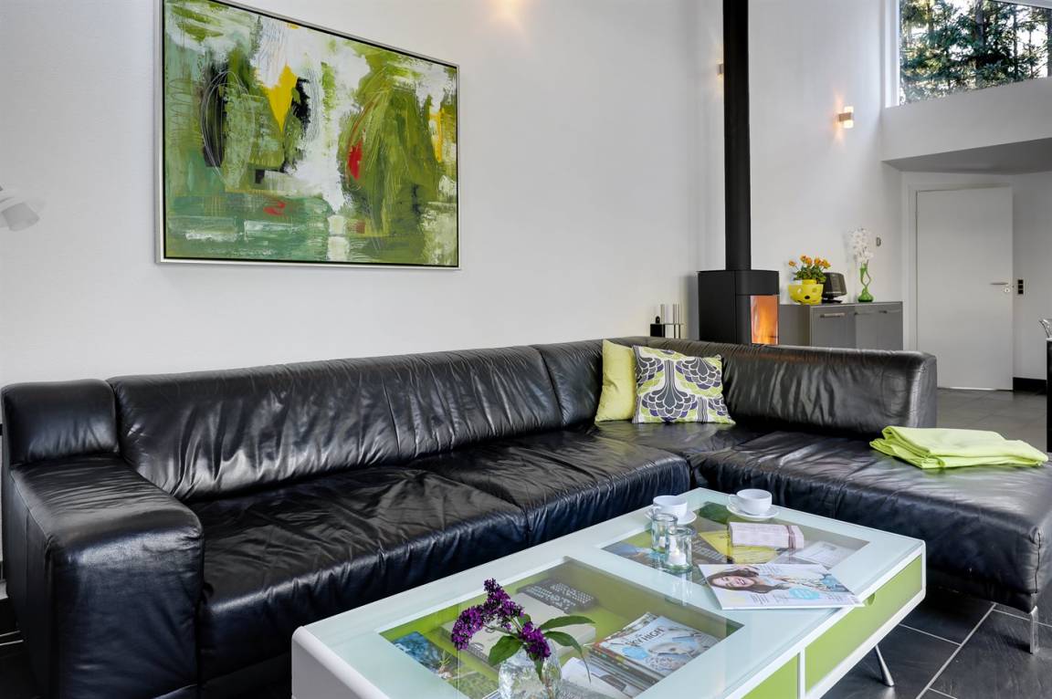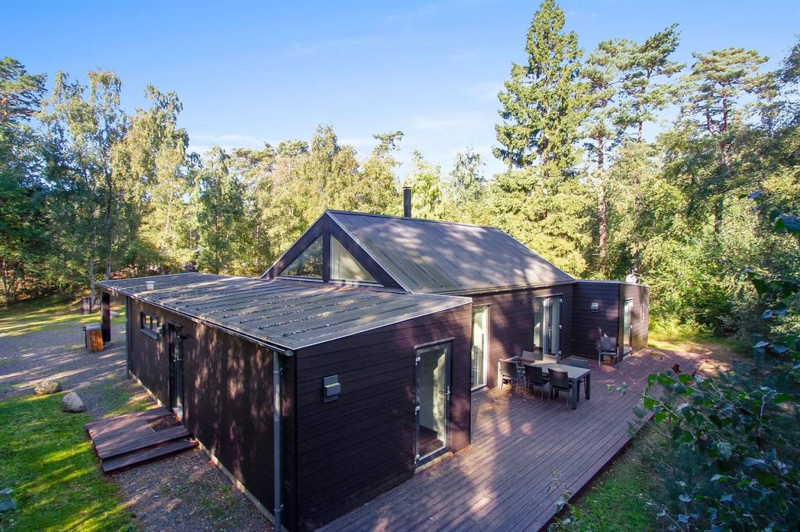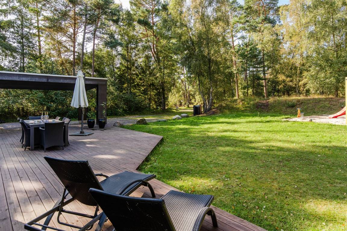 Tolles, einzigartiges Ferienhaus, bei dem hohe Qualität, eine interessante Architektur und eine gut durchdachte, gediegene Einrichtung großgeschrieben werden. Die Panoramafenster sorgen für einen wunderschönen Lichteinfall und dank einer besonderen Türkonstruktion kann man sich die Natur an warmen Sommerabenden direkt ins Haus holen. Zum Haus gehört eine große Holzterrasse und ein großes Grundstück, das Kindern viel Platz zum Spielen bietet.