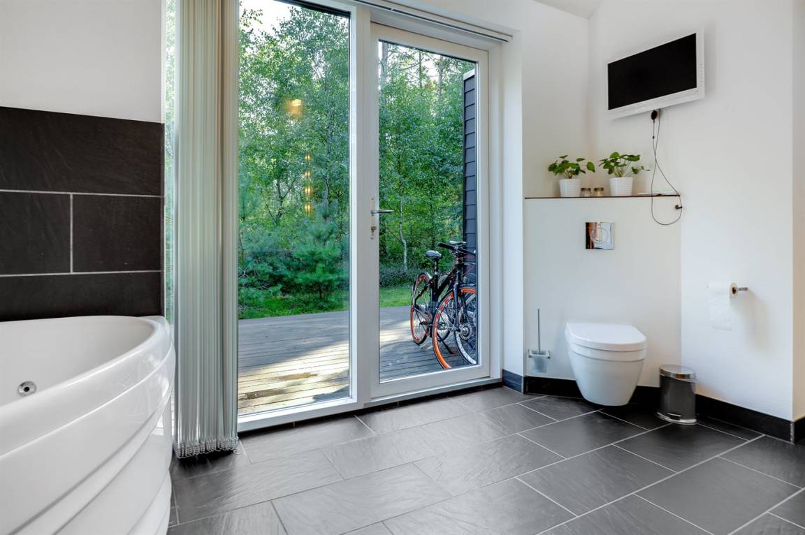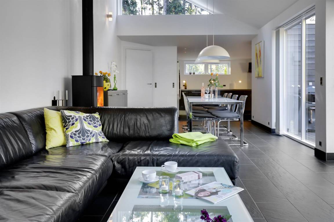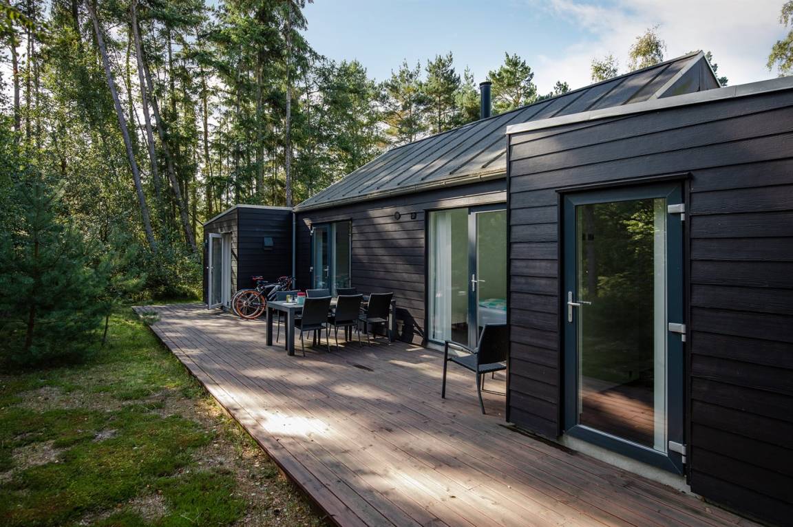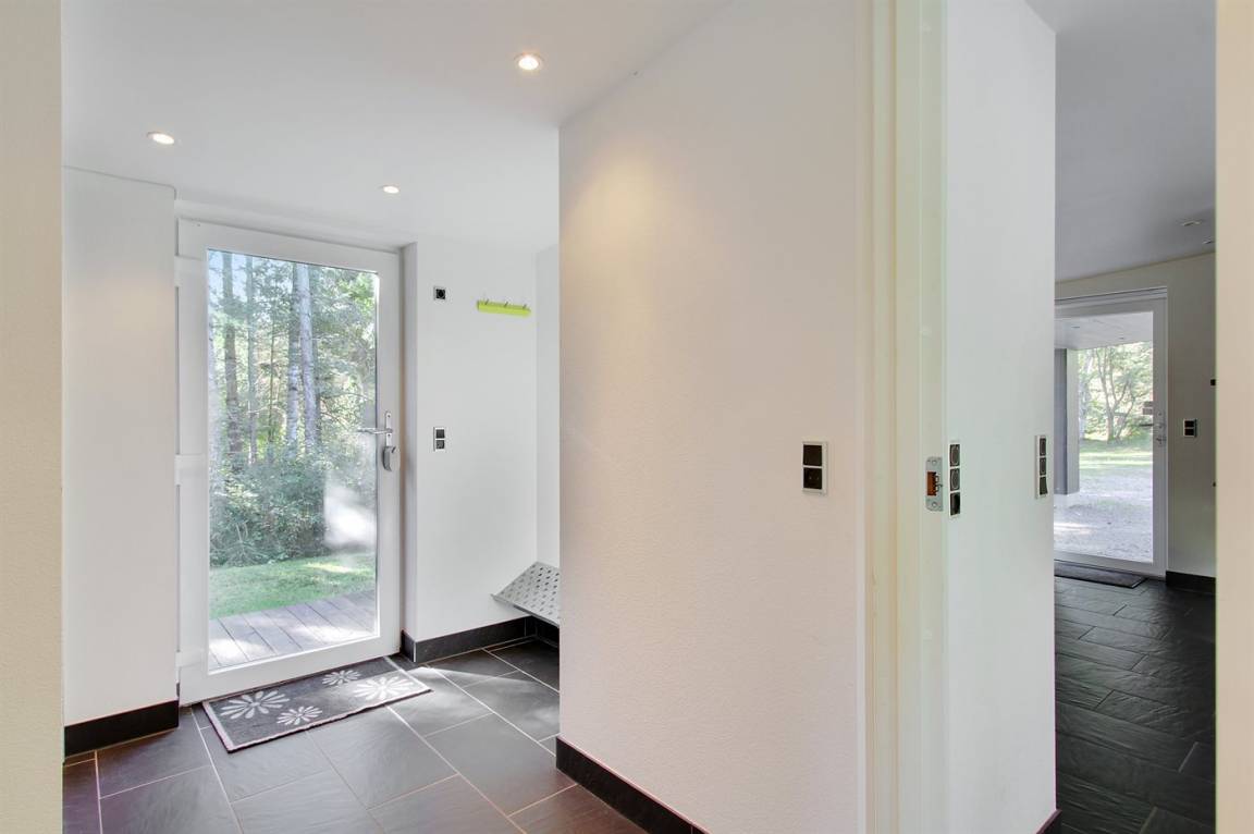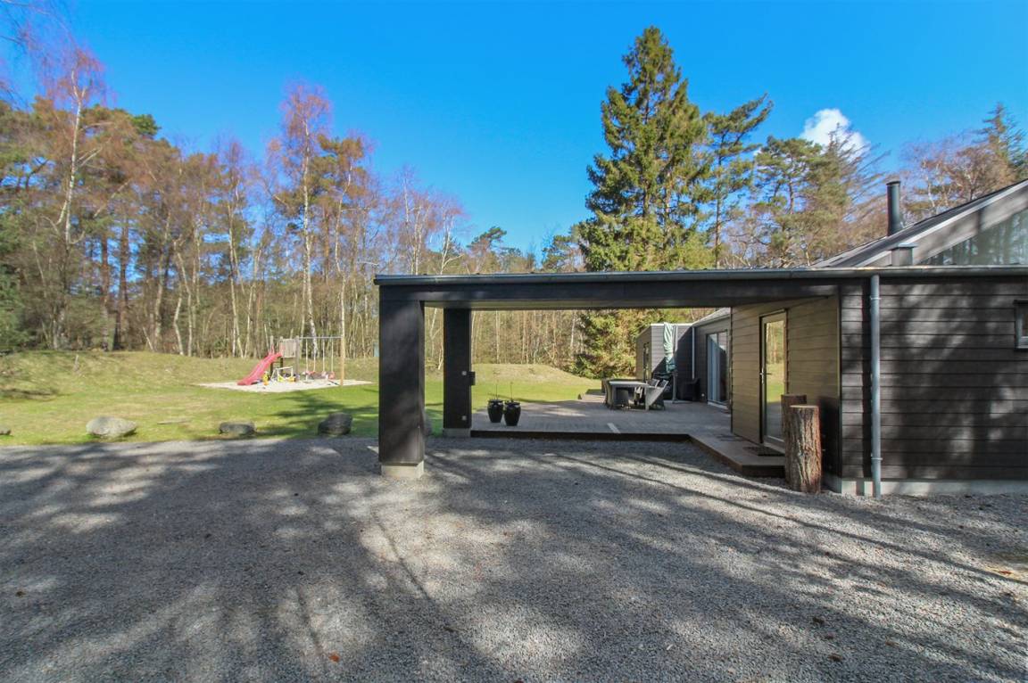 Tolles, einzigartiges Ferienhaus, bei dem hohe Qualität, eine interessante Architektur und eine gut durchdachte, gediegene Einrichtung großgeschrieben werden. Die Panoramafenster sorgen für einen wunderschönen Lichteinfall und dank einer besonderen Türkonstruktion kann man sich die Natur an warmen Sommerabenden direkt ins Haus holen. Zum Haus gehört eine große Holzterrasse und ein großes Grundstück, das Kindern viel Platz zum Spielen bietet.