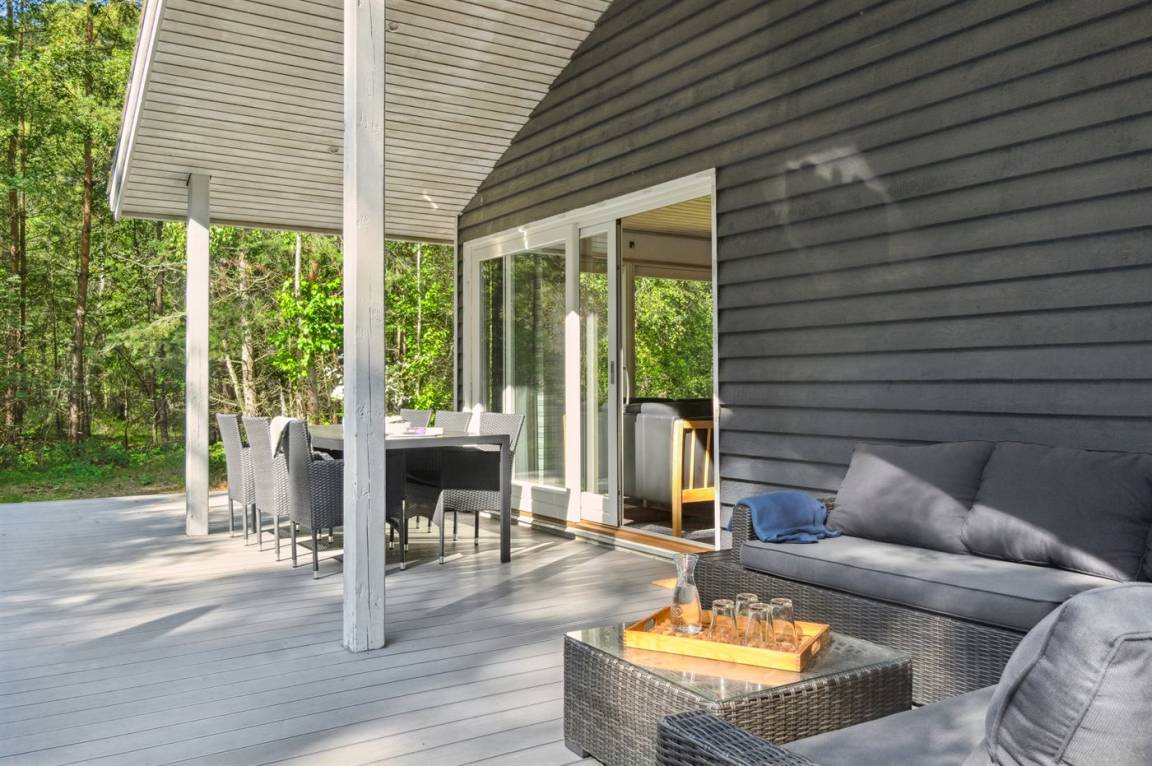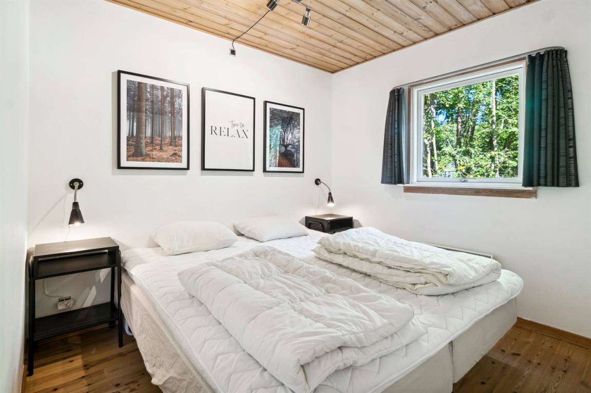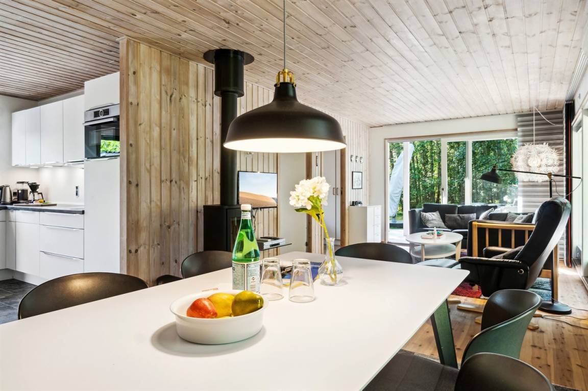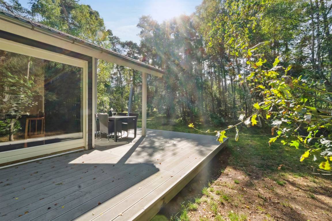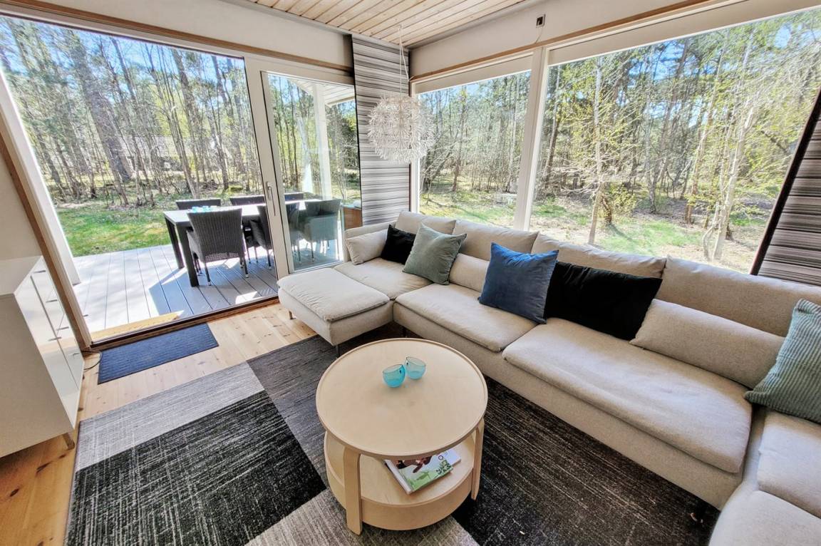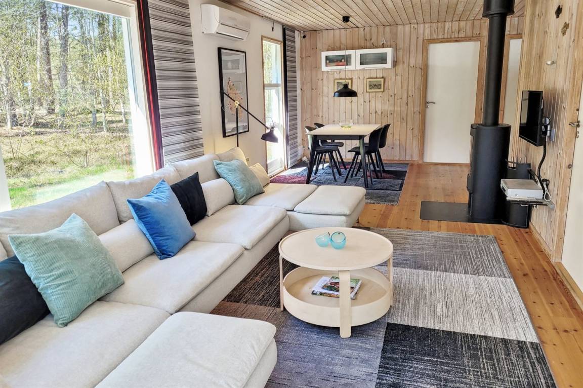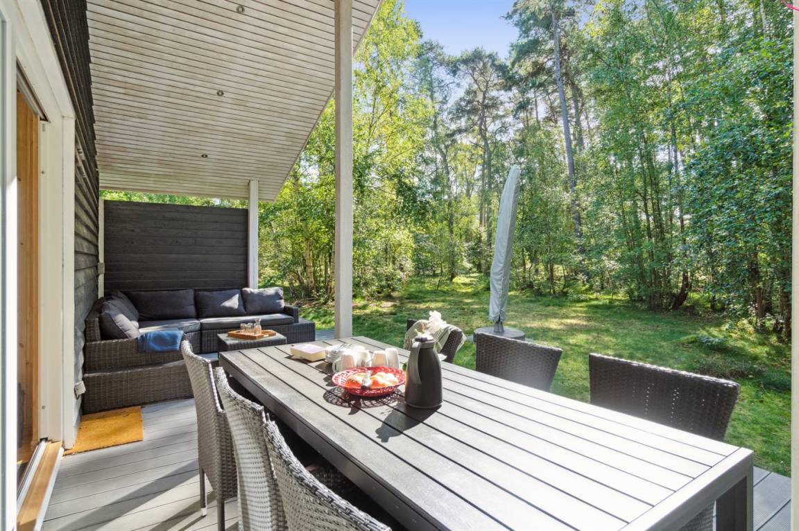 Das Ferienhaus liegt auf einem ungestörten Naturgrundstück mit teilweiseem Baumbestand, bestehend aus einer Mischung aus Birke und Kiefer, sowie einem offenen Bereich mit Naturgras. Das Haus bietet eine gute Qualität in der Möblierung, ein helles Interieur und ist komfortabel eingerichtet.