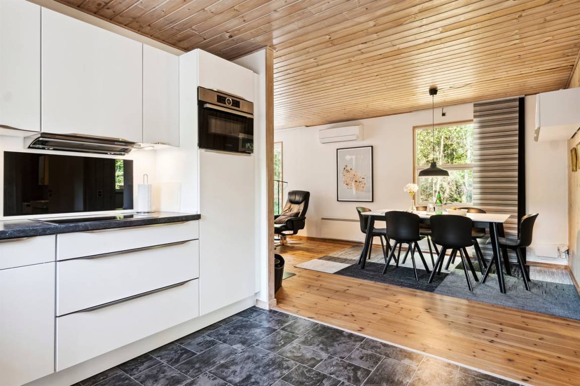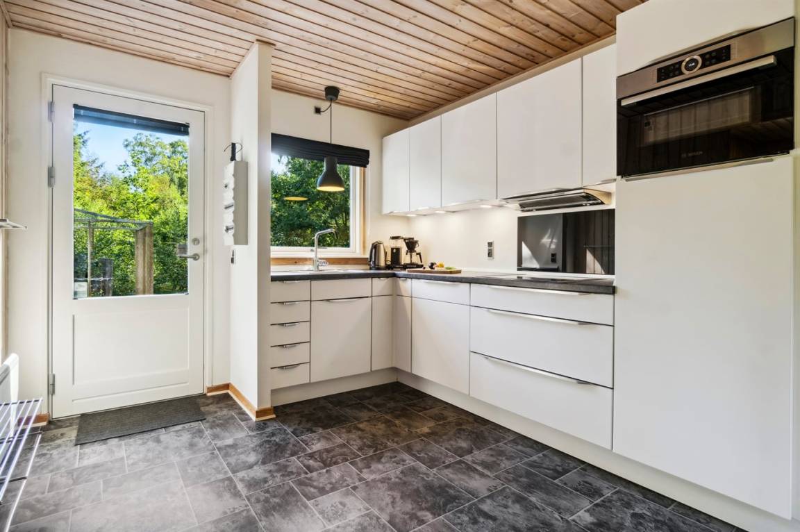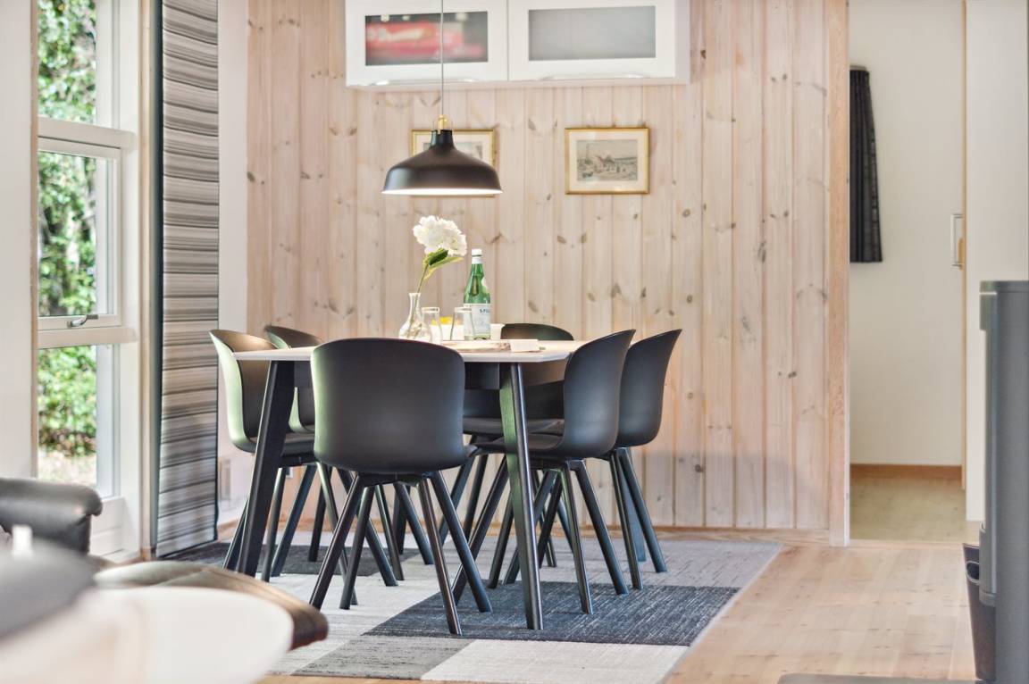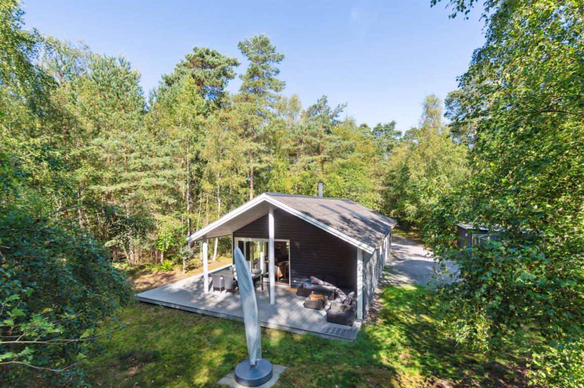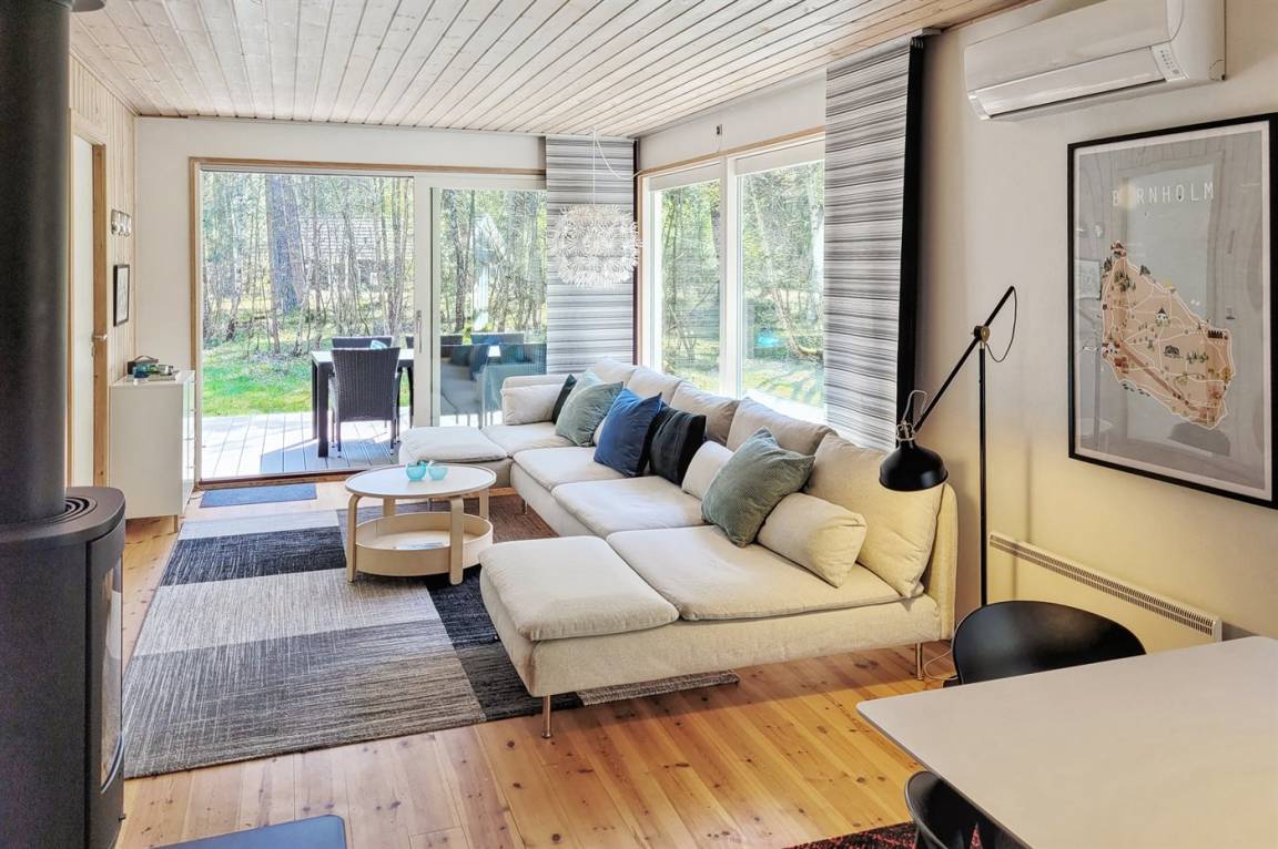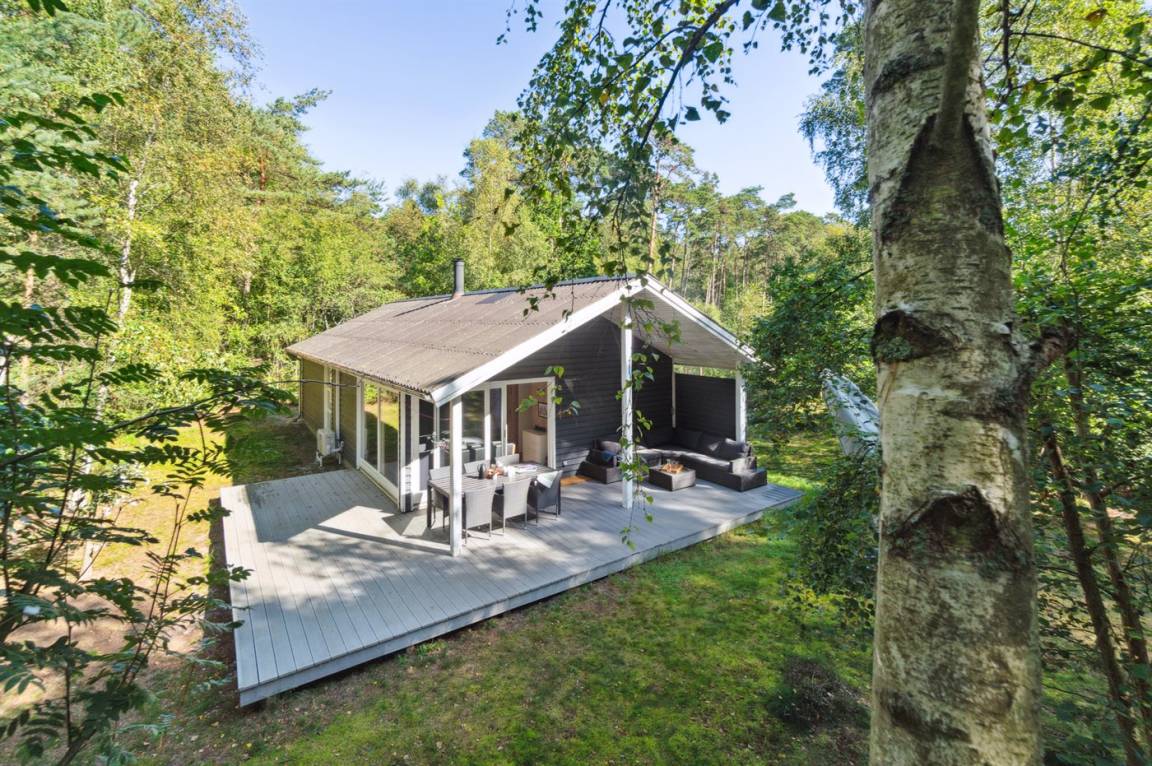 Das Ferienhaus liegt auf einem ungestörten Naturgrundstück mit teilweiseem Baumbestand, bestehend aus einer Mischung aus Birke und Kiefer, sowie einem offenen Bereich mit Naturgras. Das Haus bietet eine gute Qualität in der Möblierung, ein helles Interieur und ist komfortabel eingerichtet.