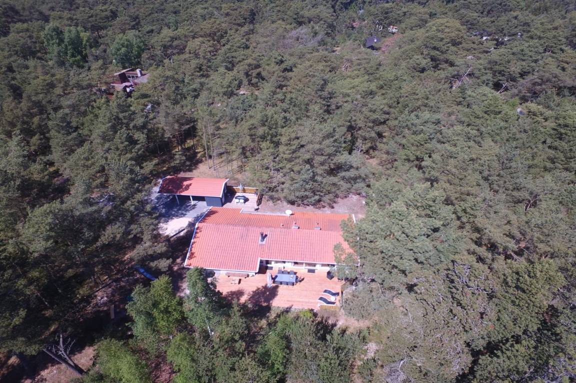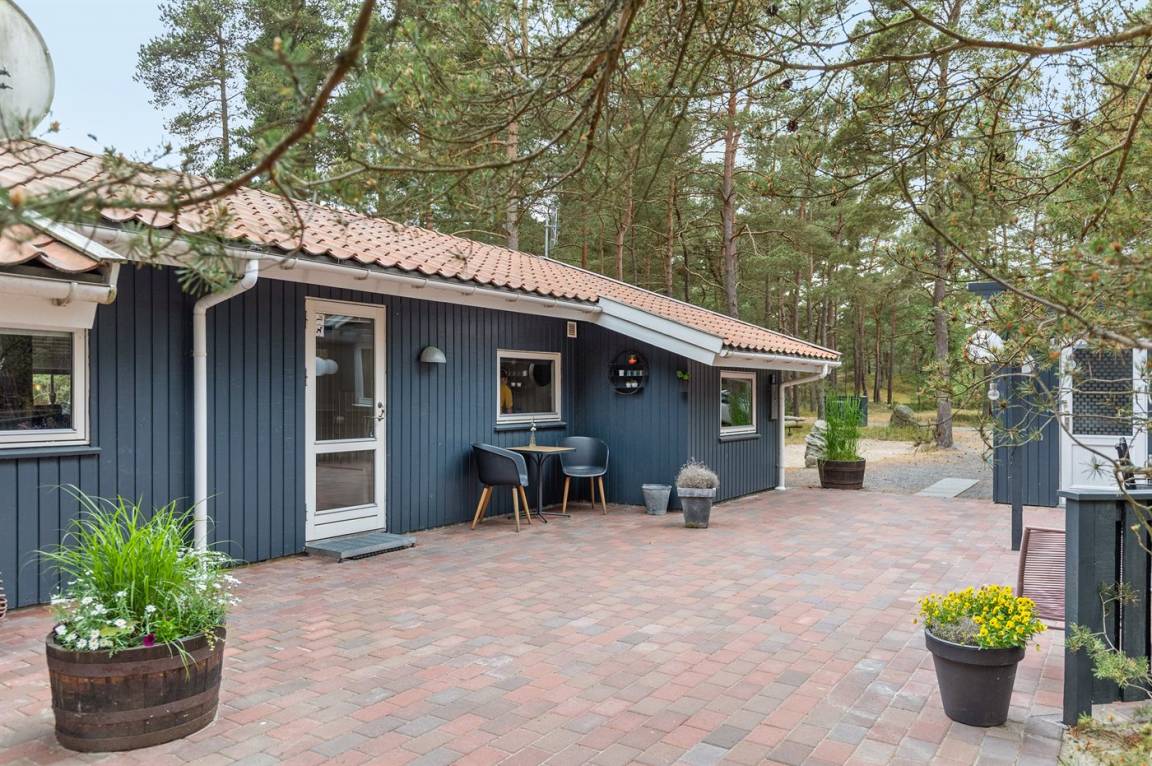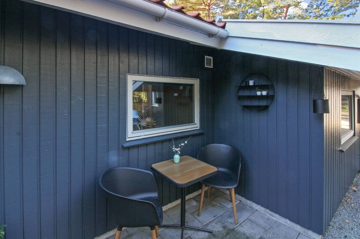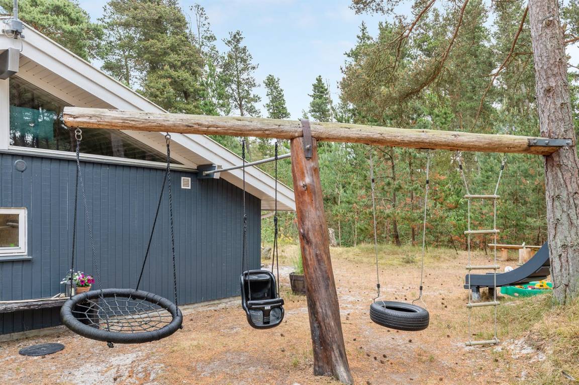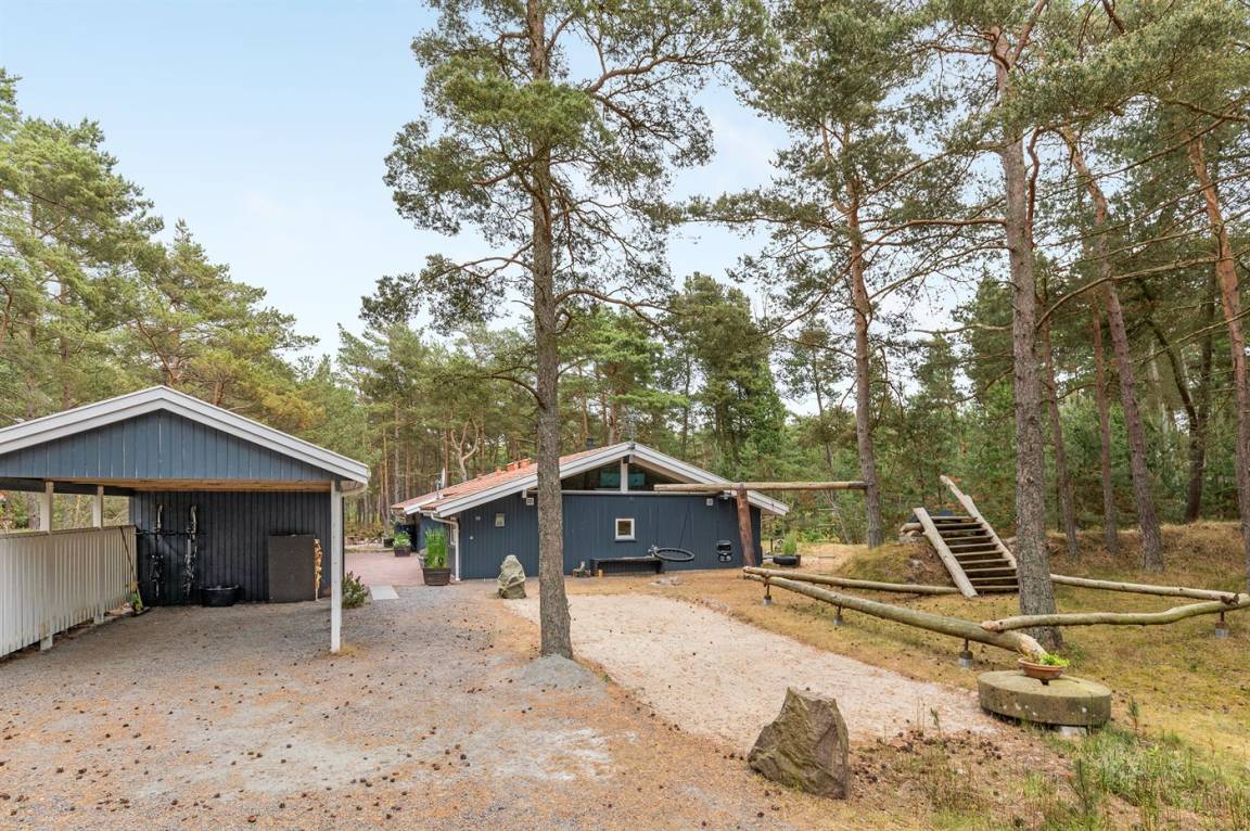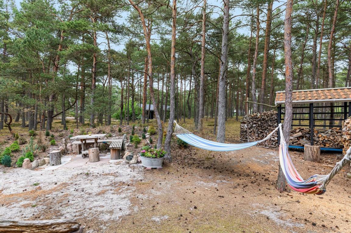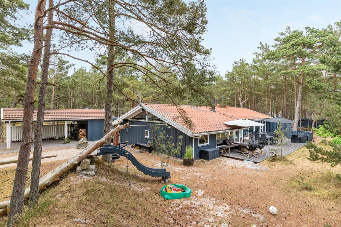 Dieses schöne Ferienhaus liegt ungestört auf einem großen Naturgrundstück mit Kiefern und Heidekraut – hier gibt es gute Spielmöglichkeiten für die Kinder. Das Haus verfügt über schöne, abgeschirmte und vor dem Wind geschützte Terrassenbereiche. Das Haus ist nett und anspruchsvoll möbliert, und alles tritt nett und einladend vor. 2 Schlafplätze befinden sich im offenen Obergeschoss.