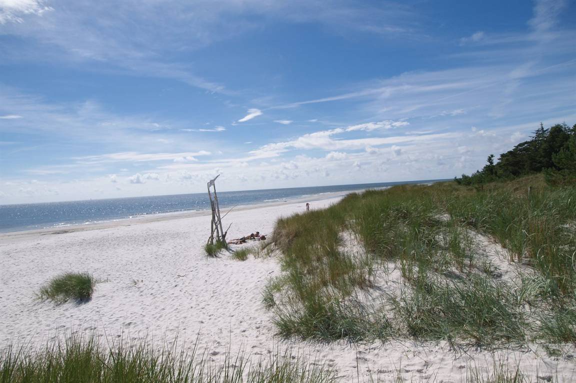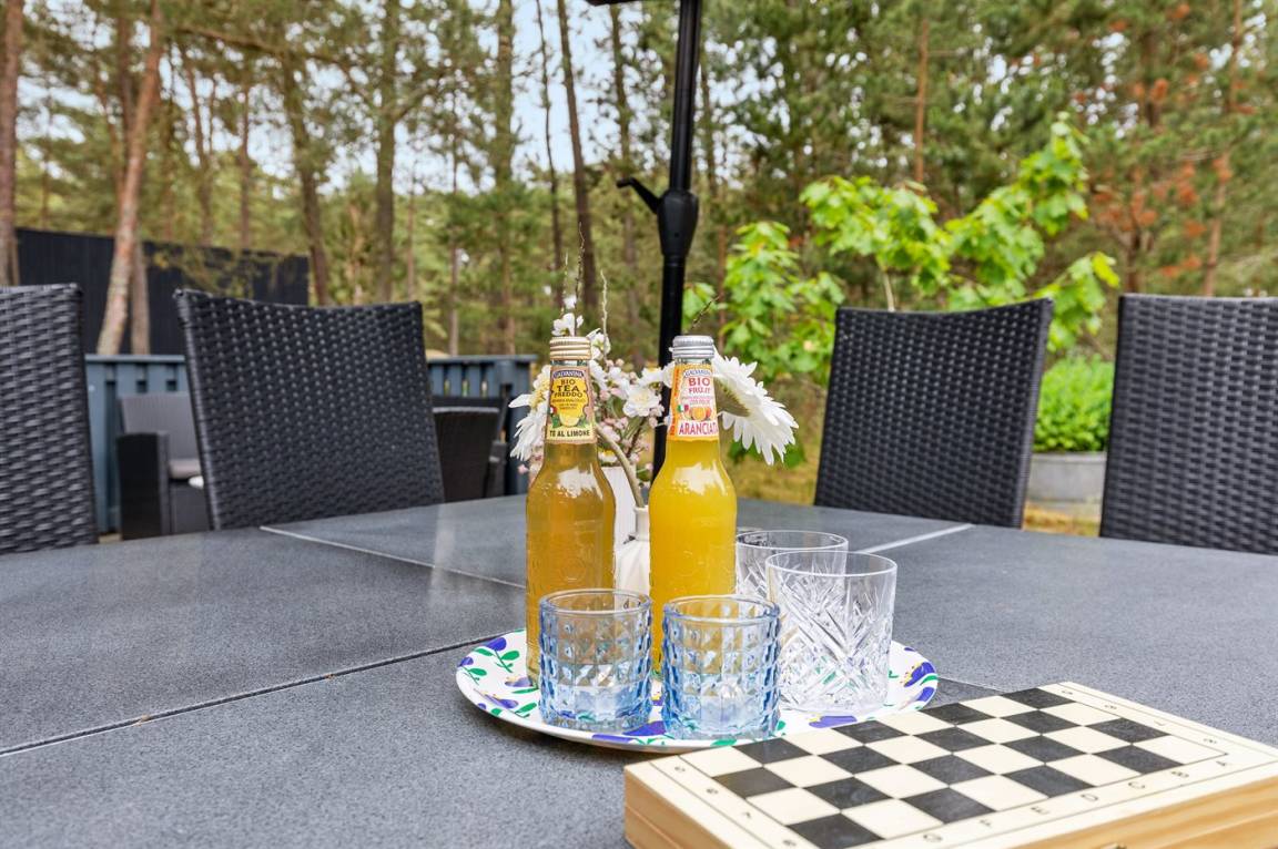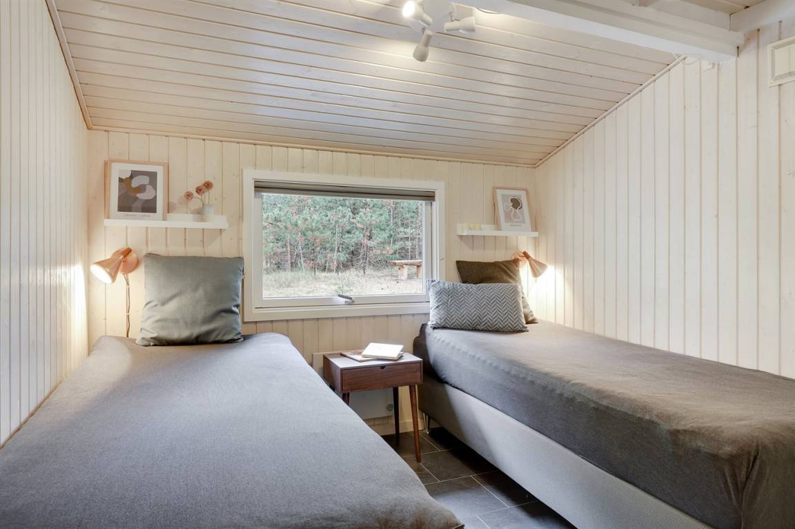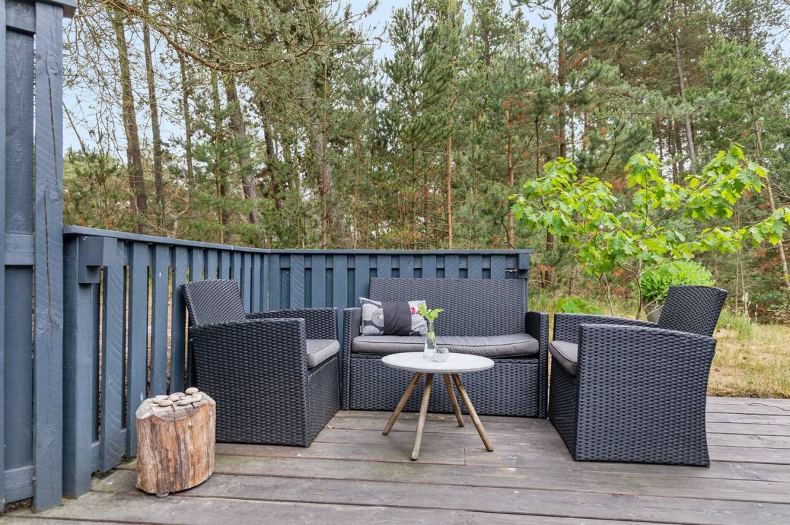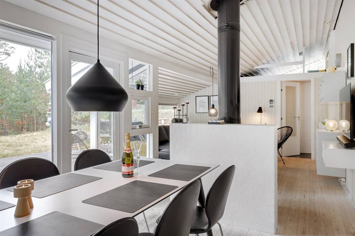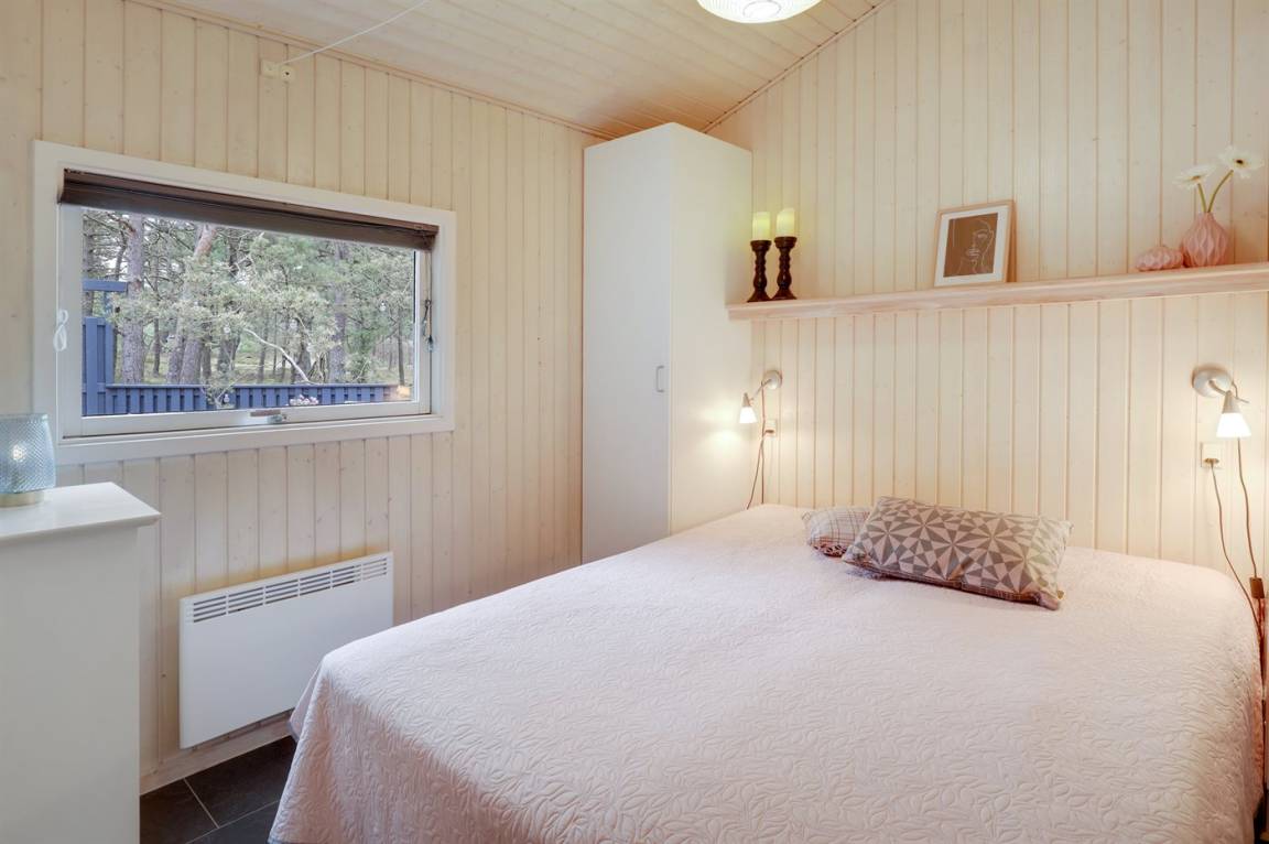 Dieses schöne Ferienhaus liegt ungestört auf einem großen Naturgrundstück mit Kiefern und Heidekraut – hier gibt es gute Spielmöglichkeiten für die Kinder. Das Haus verfügt über schöne, abgeschirmte und vor dem Wind geschützte Terrassenbereiche. Das Haus ist nett und anspruchsvoll möbliert, und alles tritt nett und einladend vor. 2 Schlafplätze befinden sich im offenen Obergeschoss.