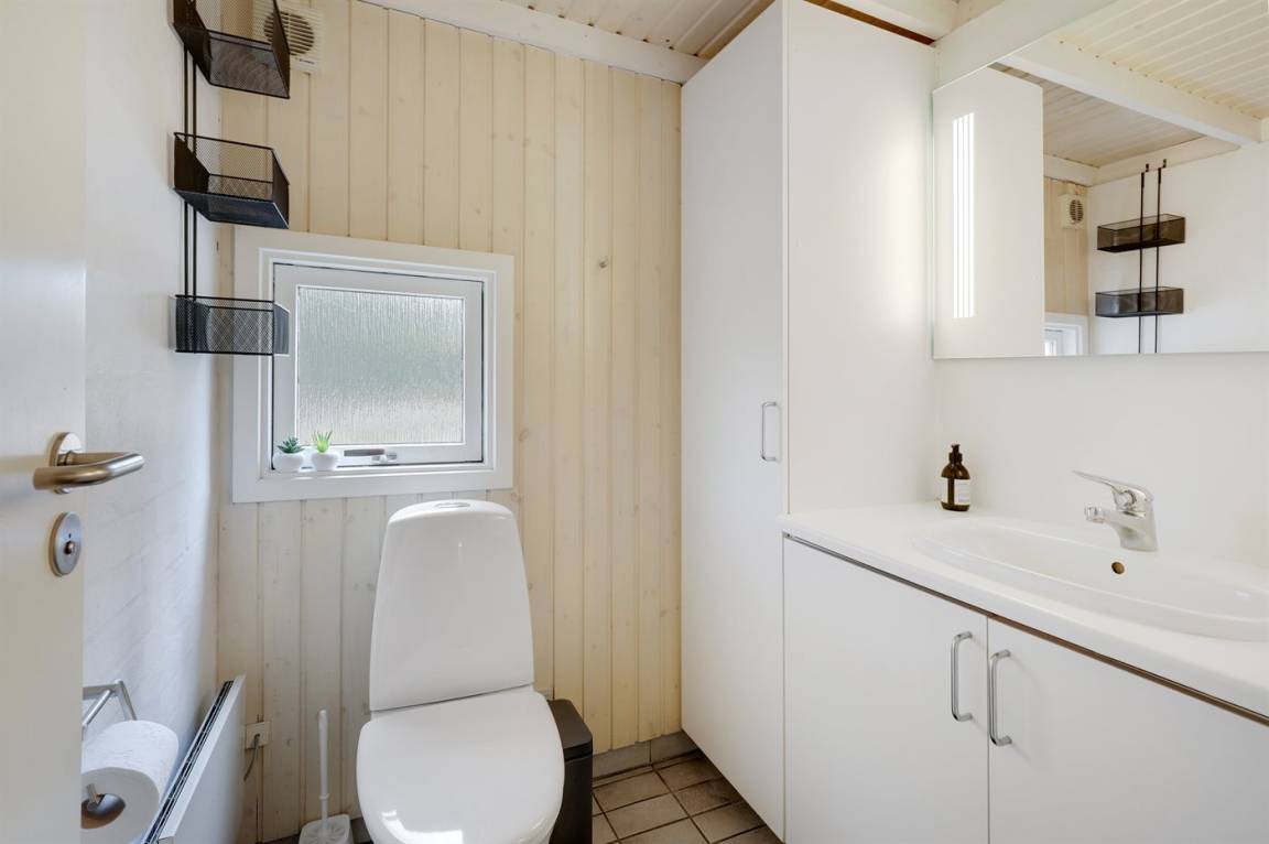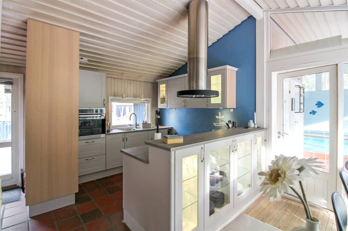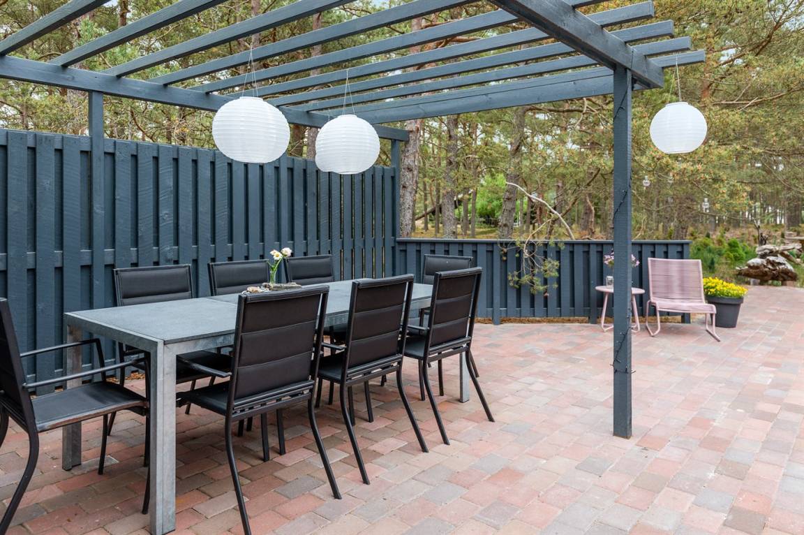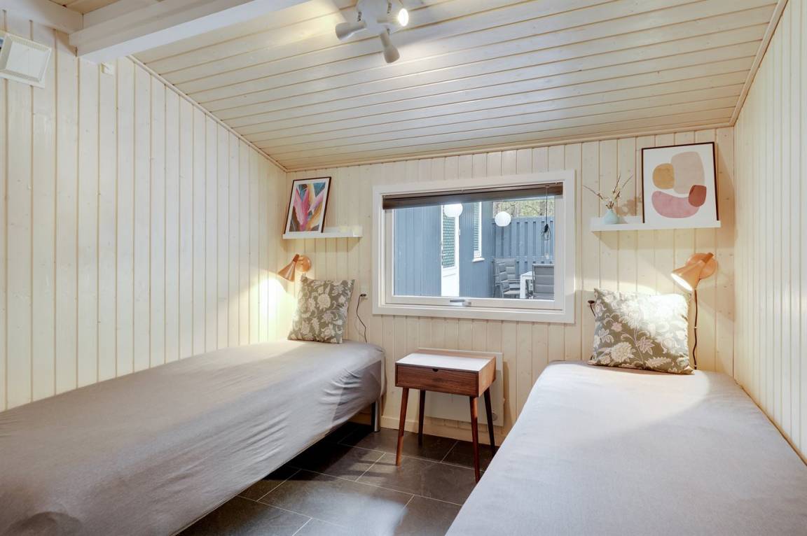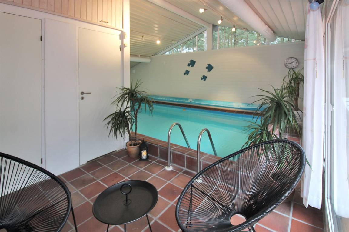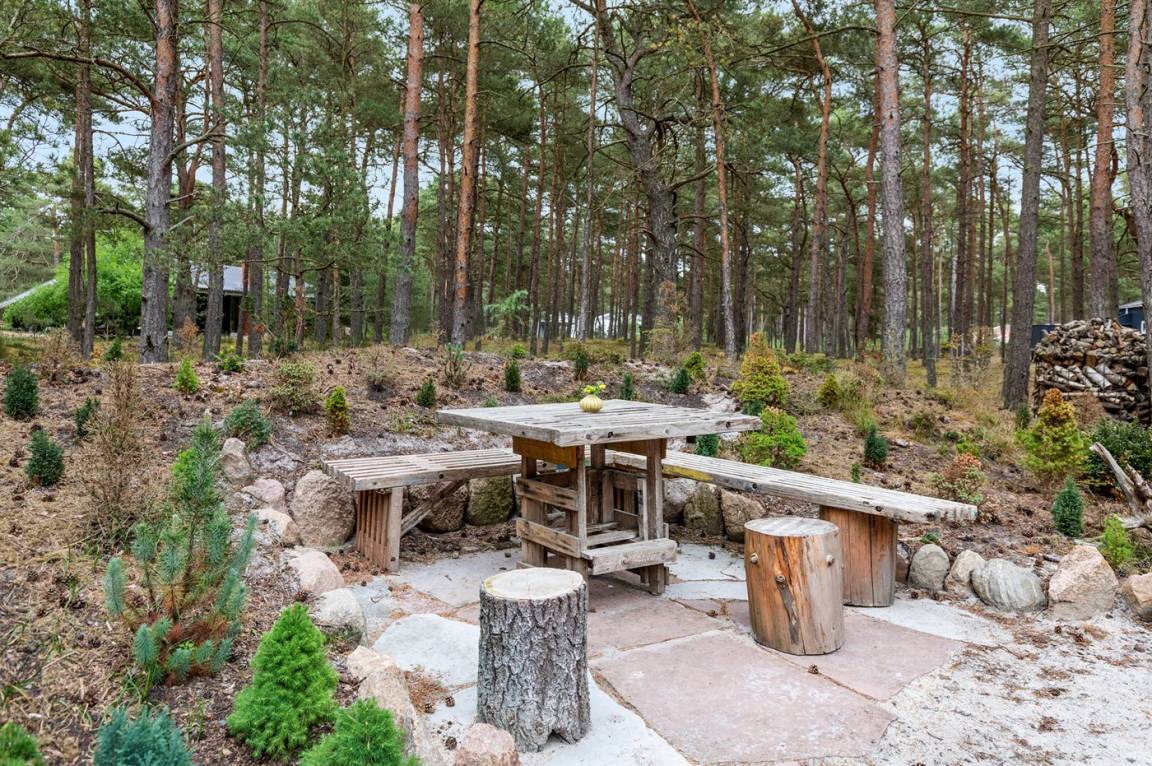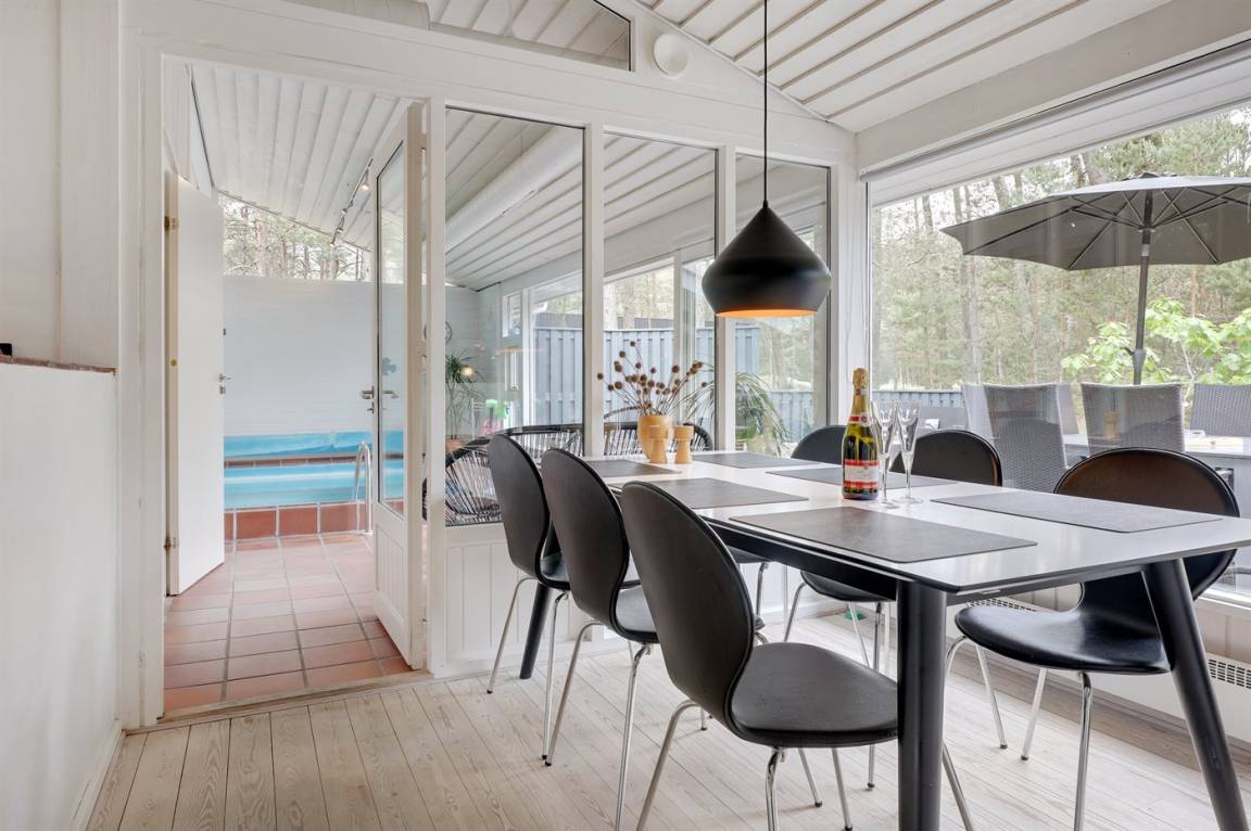Dieses schöne Ferienhaus liegt ungestört auf einem großen Naturgrundstück mit Kiefern und Heidekraut – hier gibt es gute Spielmöglichkeiten für die Kinder. Das Haus verfügt über schöne, abgeschirmte und vor dem Wind geschützte Terrassenbereiche. Das Haus ist nett und anspruchsvoll möbliert, und alles tritt nett und einladend vor. 2 Schlafplätze befinden sich im offenen Obergeschoss.