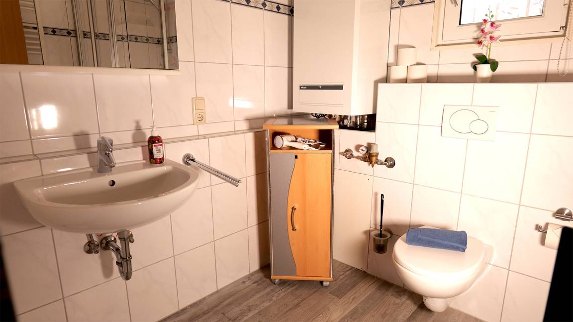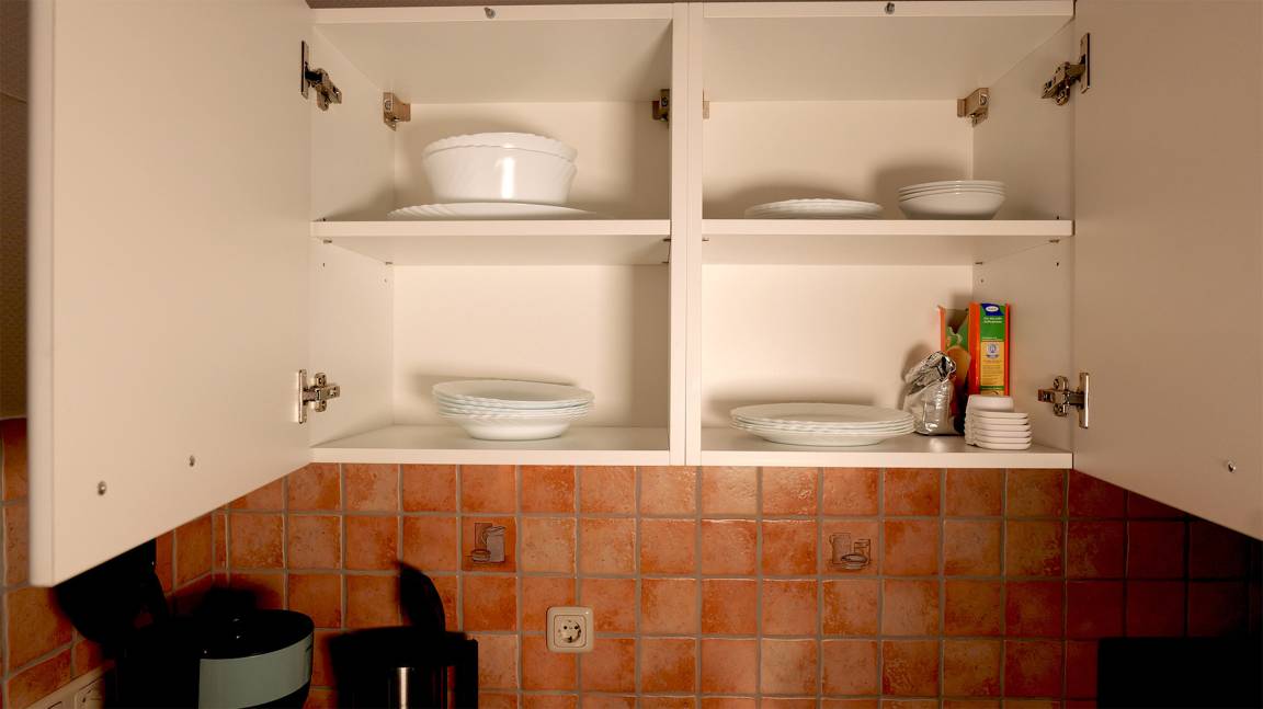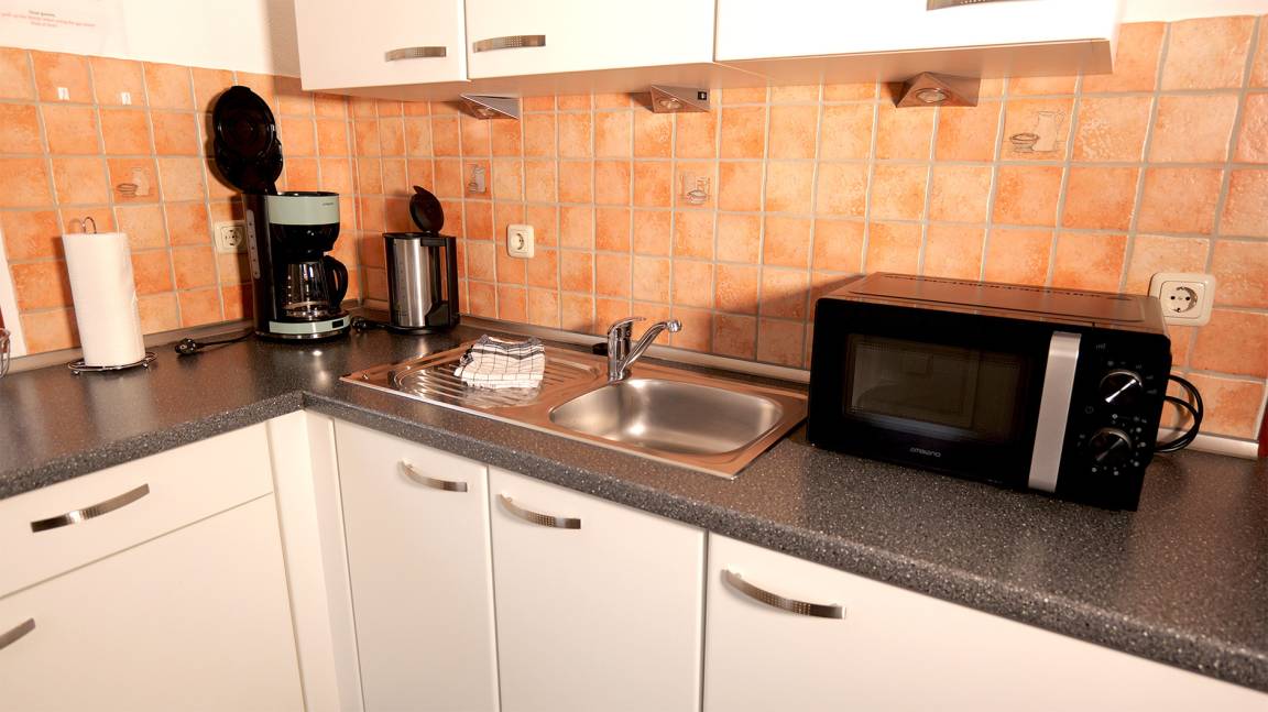 Im Wohnzimmer erwartet dich eine große, gemütliche Rund-Couch im Kolonial-Style. Ein kurzer Fußweg führt die Treppe hoch zum SB & Café Hetzingen. Dort kannst du über unsere Gäste-App bis 20 Uhr Brötchen vorbestellen oder nach Absprache frühstücken.