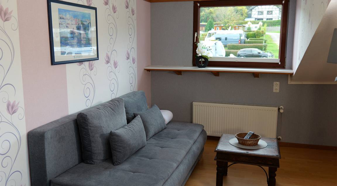 Die kleine Wohnung befindet sich im ersten Stock und ist über eine Treppe erreichbar. Im Abstellraum können z.B. Gepäckstücke abgestellt werden. Die Wohnung befindet sich oberhalb der Sanitäranlage. Gegenüber sind die Rezeption und das SB & Café Hetzingen. Die Wohnung liegt "mitten im Geschehen". Dein Fahrzeug parkst du in der Nähe des Objektes. An der Treppe kannst Du für kurze Zeit halten, um das Gepäck auszuladen.