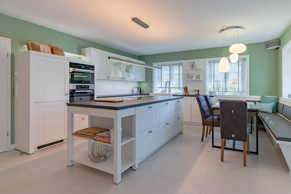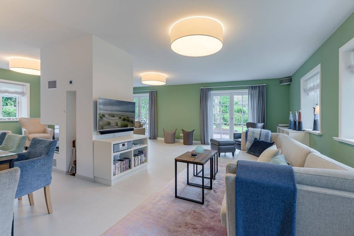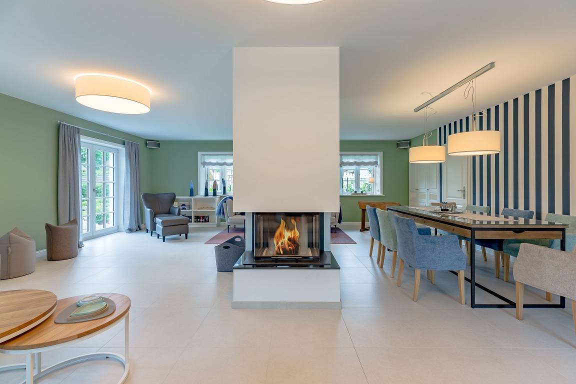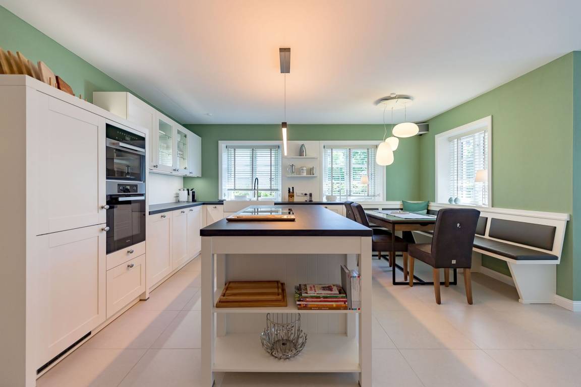 Auch im Haus wurde an alles gedacht, was den Aufenthalt angenehm und zum Erlebnis macht. Schon beim Betreten wirkt es beruhigend und einladend. Im Erdgeschoss befinden sich nicht nur ein Gäste-WC und ein Hauswirtschaftsraum mit Waschmaschine und Trockner, sondern auch ein Schlafzimmer mit en suite Bad, das keine Wünsche offen lässt. Die große, offene Wohnraumküche mit gemütlicher Übereckbank und Kochinsel bietet genügend Möglichkeiten, der Kreativität beim gemeinsamen Kochen freien Raum zu lassen. Sie ist mit den modernsten Küchenutensilien voll ausgestattet und hält ein Kochfeld mit Bora Abzugssystem bereit. Der dreiseitig offene Kamin bildet das Herzstück des Wohnzimmers. Hier kann man gemütlich mit seinen Liebsten an einem großen Esstisch speisen, oder auf einem großen Überecksofa mit zwei Sesseln das Kaminfeuer genießen. Ein Fernseher mit Soundanlage sowie eine Musikanlage runden das Angebot ab. Das lange und gemütliche Fernsehsofa lädt zu unterhaltsamen oder aber spannenden Abenden ein. Auch bei sportlichen Großereignissen finden hier alle ihren Platz.