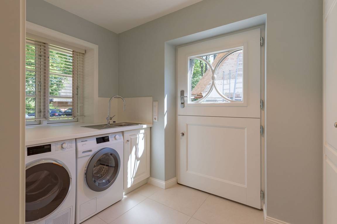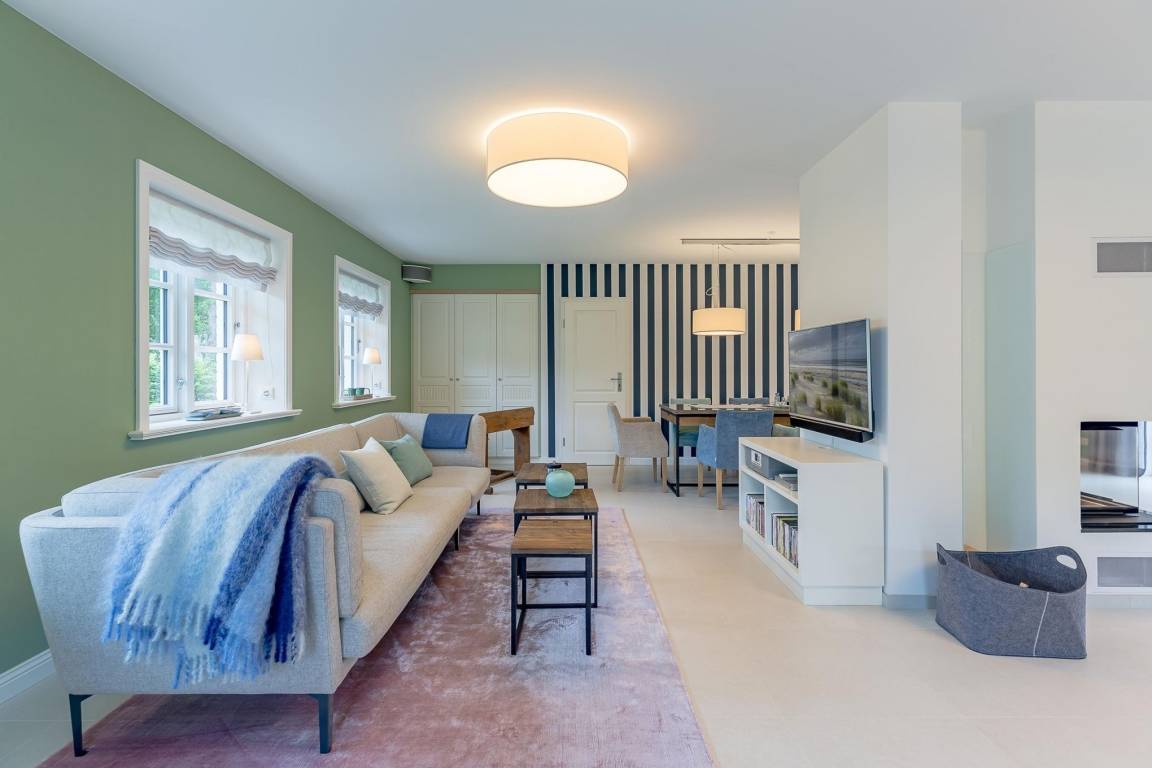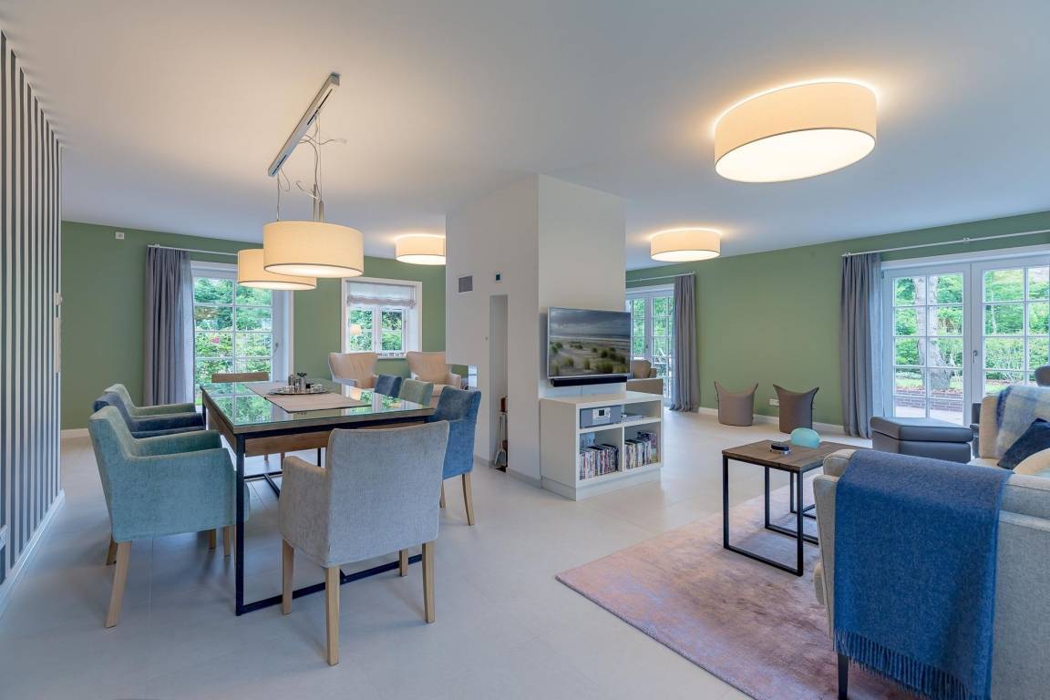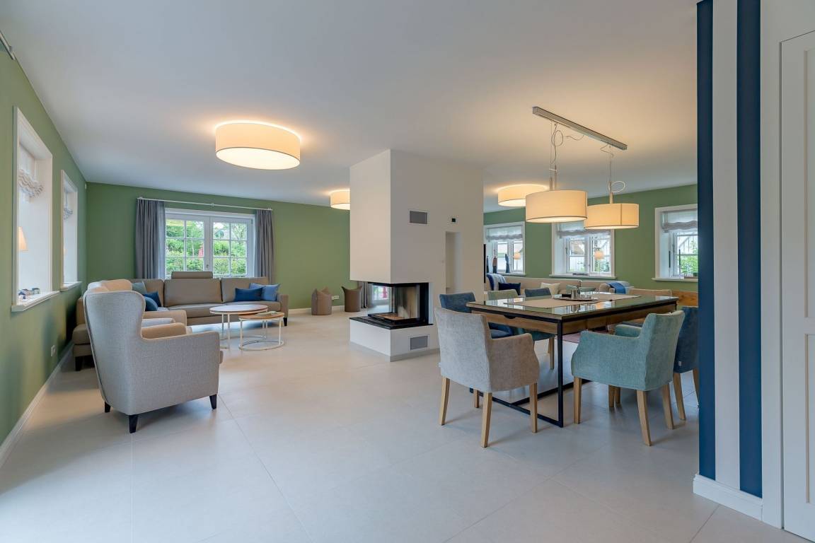 Auch im Haus wurde an alles gedacht, was den Aufenthalt angenehm und zum Erlebnis macht. Schon beim Betreten wirkt es beruhigend und einladend. Im Erdgeschoss befinden sich nicht nur ein Gäste-WC und ein Hauswirtschaftsraum mit Waschmaschine und Trockner, sondern auch ein Schlafzimmer mit en suite Bad, das keine Wünsche offen lässt. Die große, offene Wohnraumküche mit gemütlicher Übereckbank und Kochinsel bietet genügend Möglichkeiten, der Kreativität beim gemeinsamen Kochen freien Raum zu lassen. Sie ist mit den modernsten Küchenutensilien voll ausgestattet und hält ein Kochfeld mit Bora Abzugssystem bereit. Der dreiseitig offene Kamin bildet das Herzstück des Wohnzimmers. Hier kann man gemütlich mit seinen Liebsten an einem großen Esstisch speisen, oder auf einem großen Überecksofa mit zwei Sesseln das Kaminfeuer genießen. Ein Fernseher mit Soundanlage sowie eine Musikanlage runden das Angebot ab. Das lange und gemütliche Fernsehsofa lädt zu unterhaltsamen oder aber spannenden Abenden ein. Auch bei sportlichen Großereignissen finden hier alle ihren Platz.