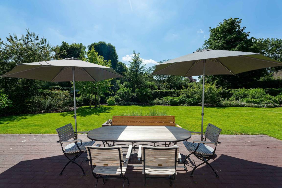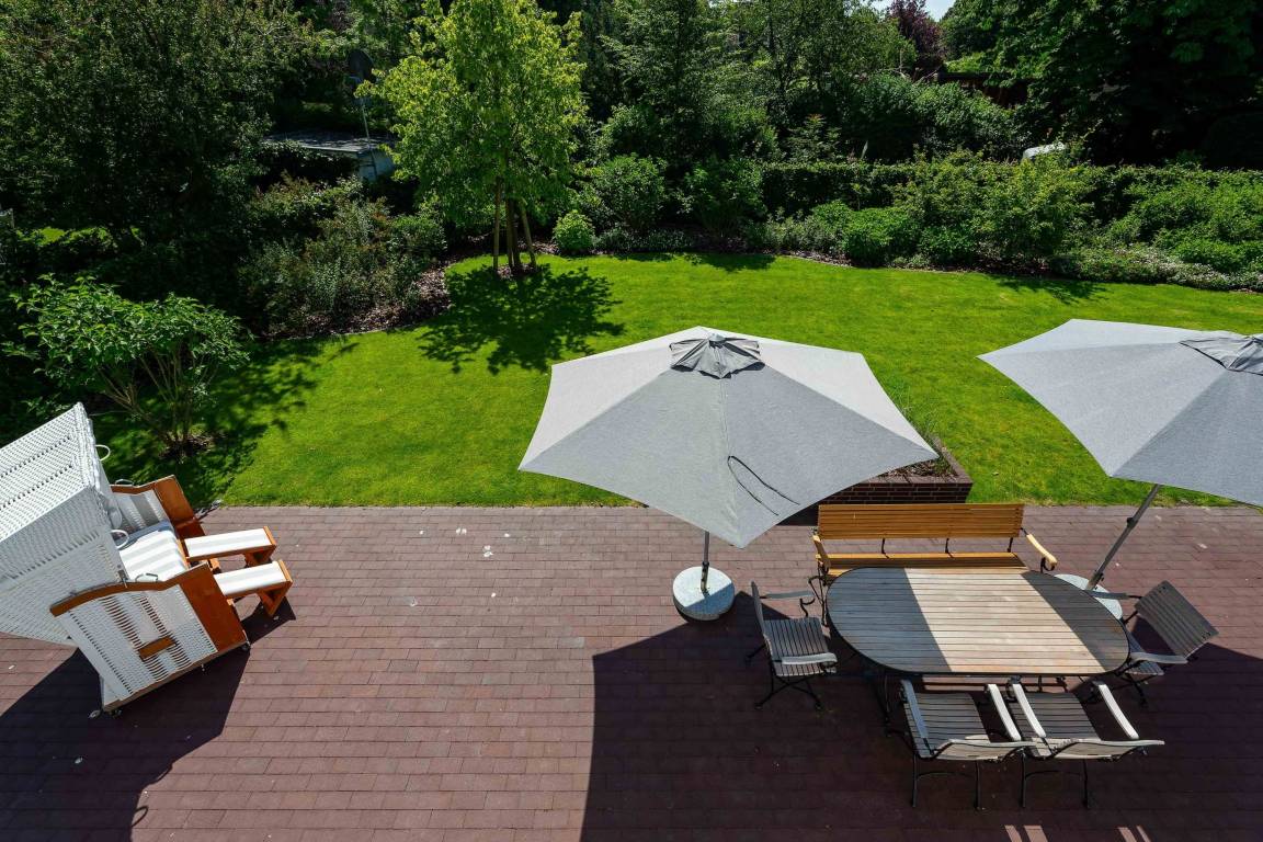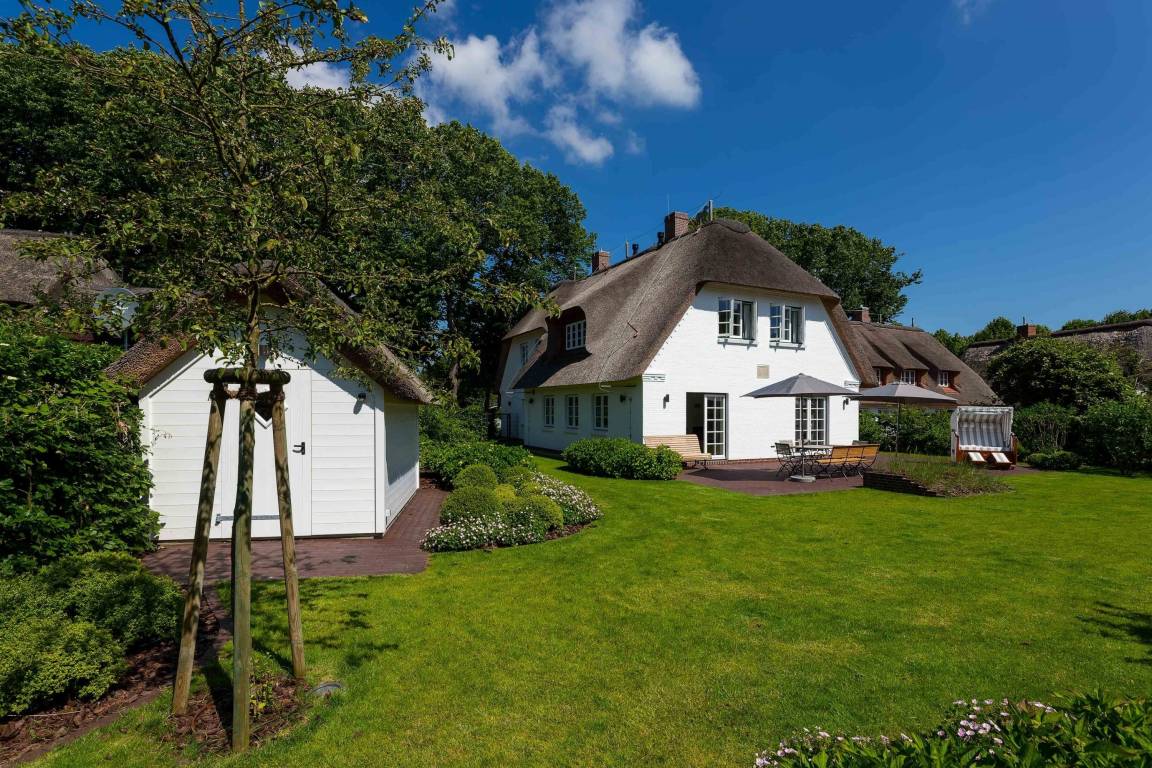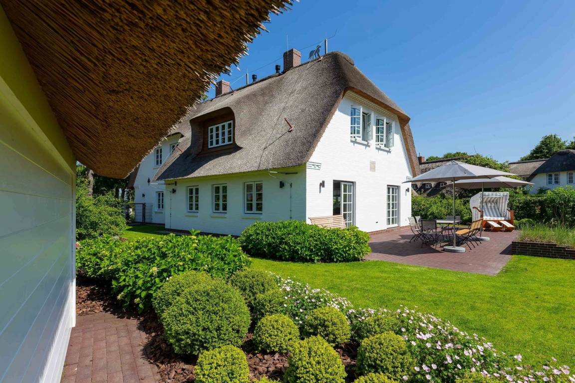 Das Haus ist ein echtes Schmuckstück und bietet abgewandt von der Straße im Südwesten einen großen eingefriedeten Garten mit umlaufender Frühstücks- und Sonnenterasse. Zum Entspannen stehen dort Bänke und andere Sitzgelegenheiten mit einem großen Gartentisch zur Verfügung. Der Strandkorb lädt zum herrlichen Sonnenbaden ein. Eine automatische Bewässerung, die nachts angesteuert wird, lässt die Pflanzen gedeihen.