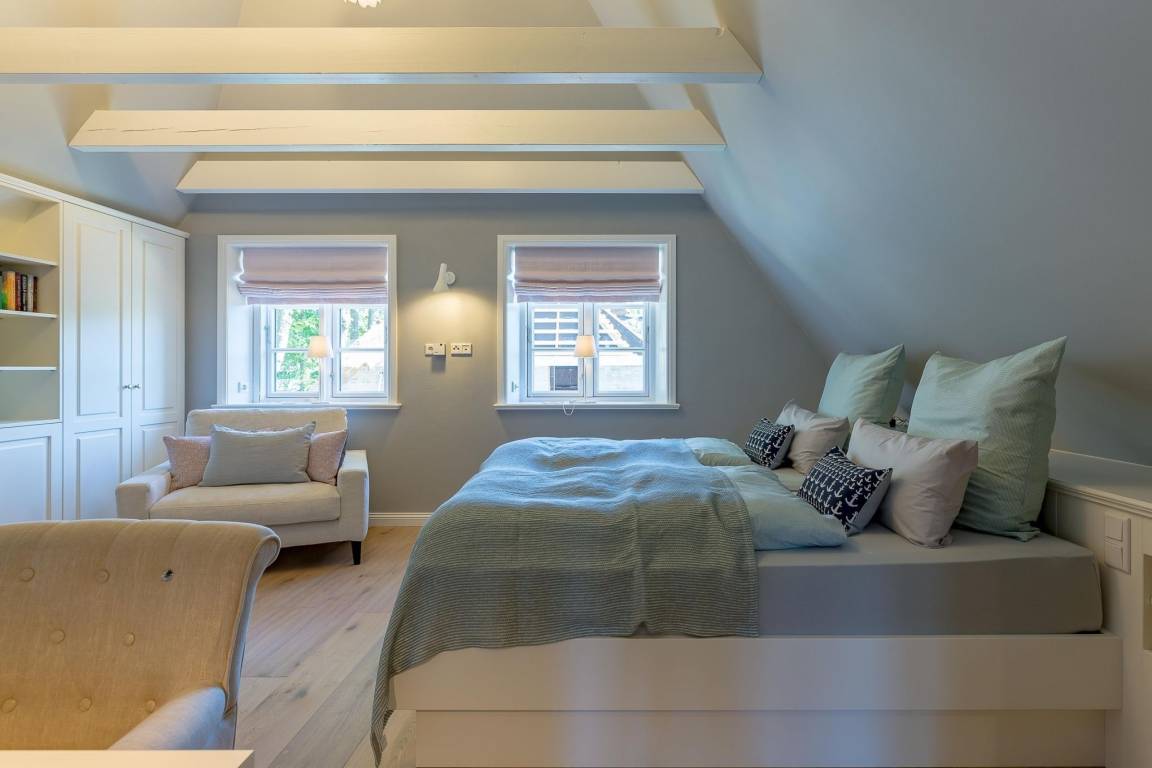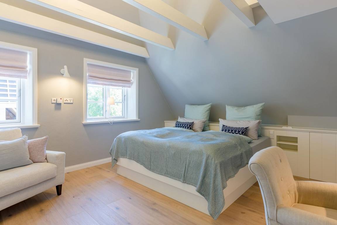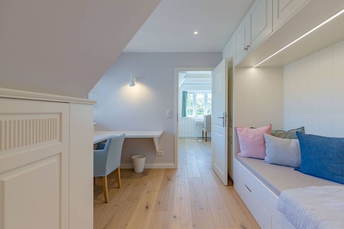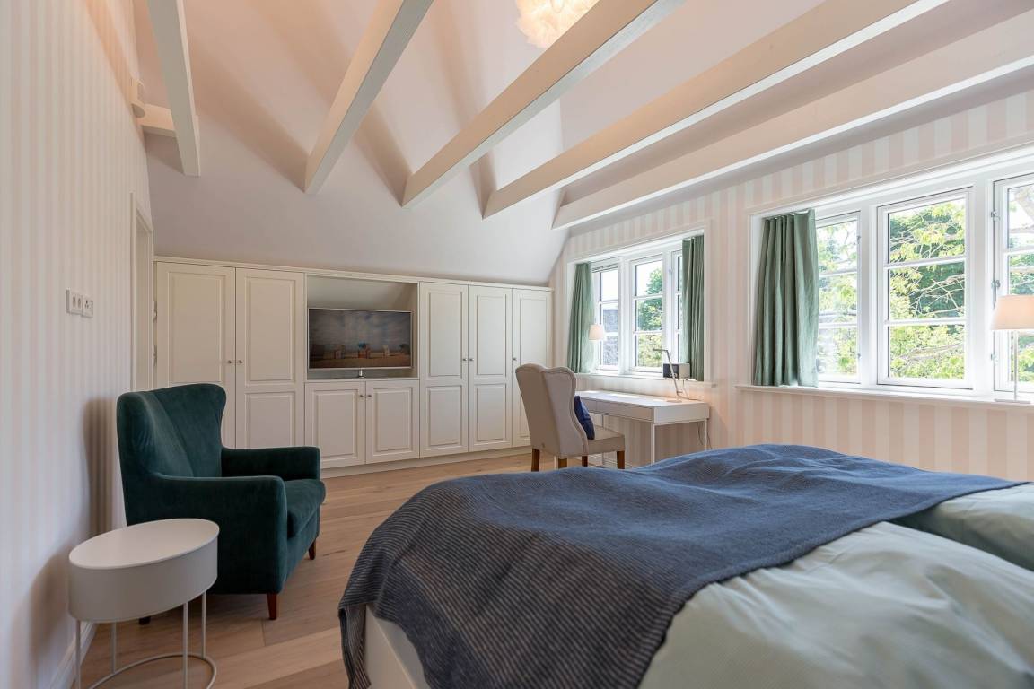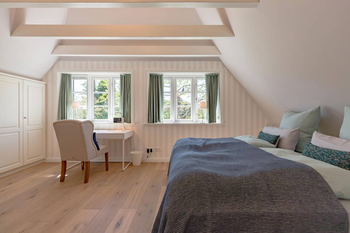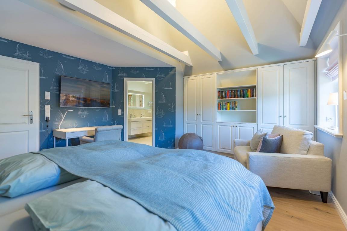 Im Obergeschoss finden Sie zwei weitere großzügige Schlafräume mit offener Kehlbalkendecke und en suite Bad. Beide Schlafräume sind ebenfalls jeweils mit einem TV und auch einem Schreibtisch ausgestattet. Ein Arbeitszimmer mit Alkoven ist einem Schlafzimmer vorgelagert. Die ebenfalls im Obergeschoss befindliche Sauna mit großer Walk-in-Dusche und Kneippgarnitur macht Ihren Wellnesstag zum Erlebnis.