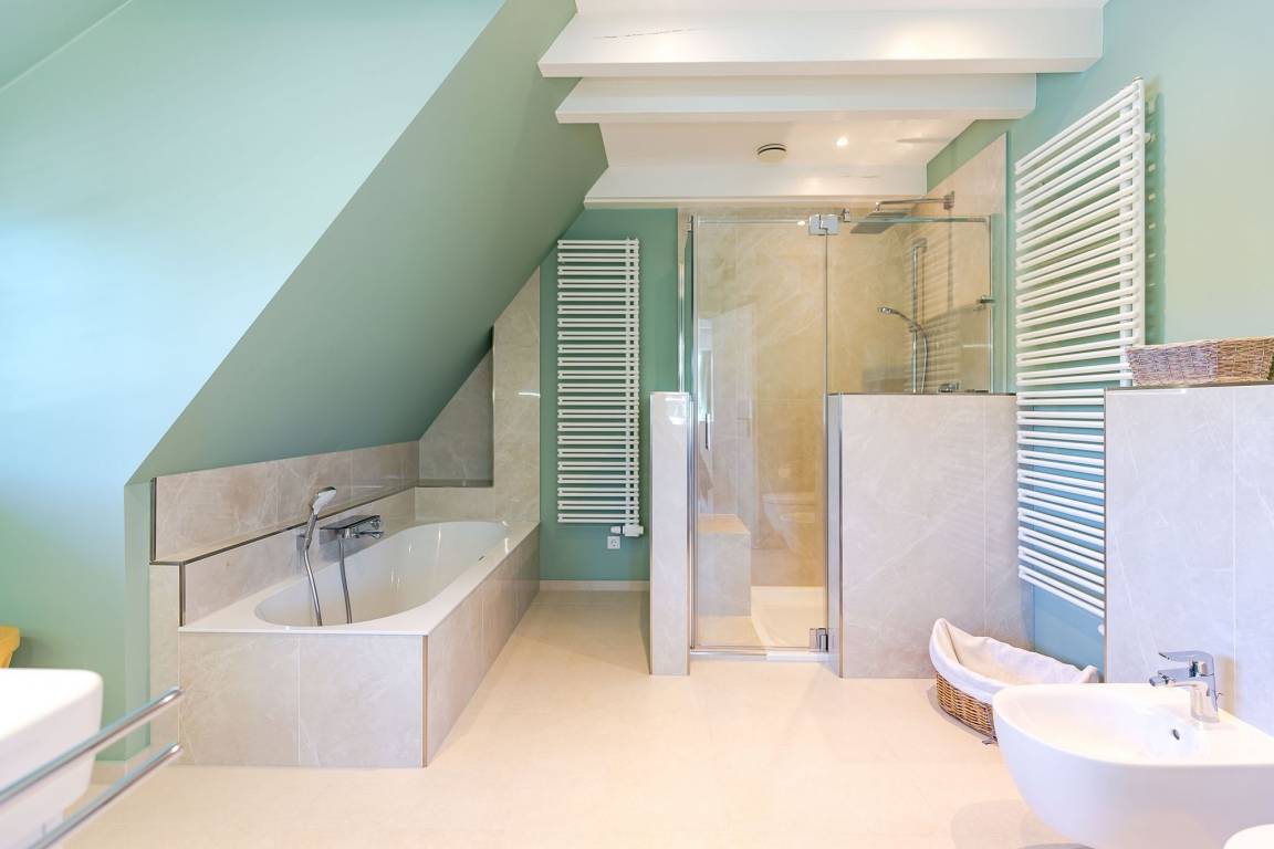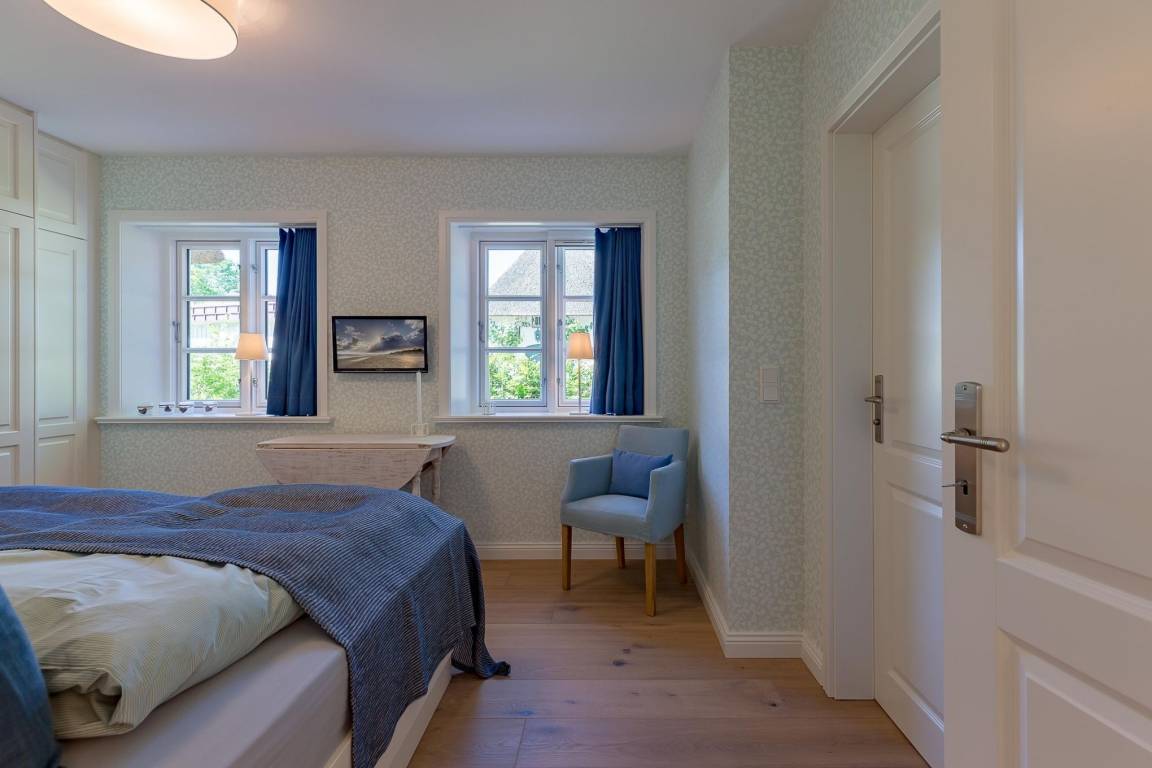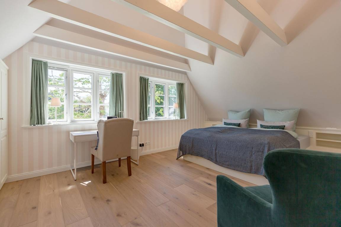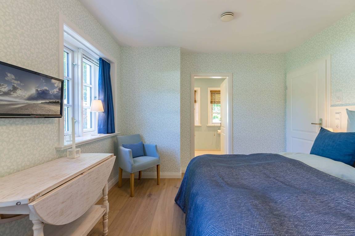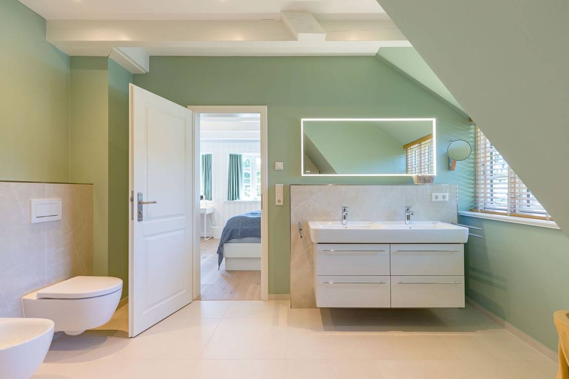 Im Obergeschoss finden Sie zwei weitere großzügige Schlafräume mit offener Kehlbalkendecke und en suite Bad. Beide Schlafräume sind ebenfalls jeweils mit einem TV und auch einem Schreibtisch ausgestattet. Ein Arbeitszimmer mit Alkoven ist einem Schlafzimmer vorgelagert. Die ebenfalls im Obergeschoss befindliche Sauna mit großer Walk-in-Dusche und Kneippgarnitur macht Ihren Wellnesstag zum Erlebnis.