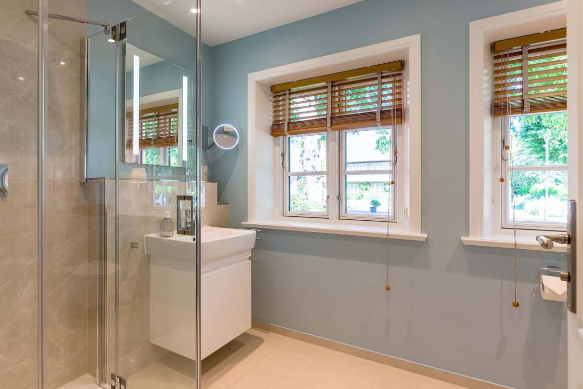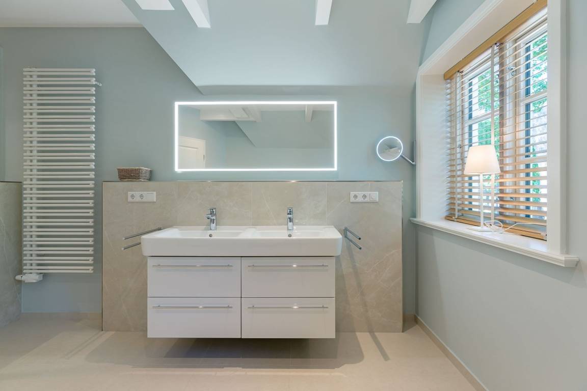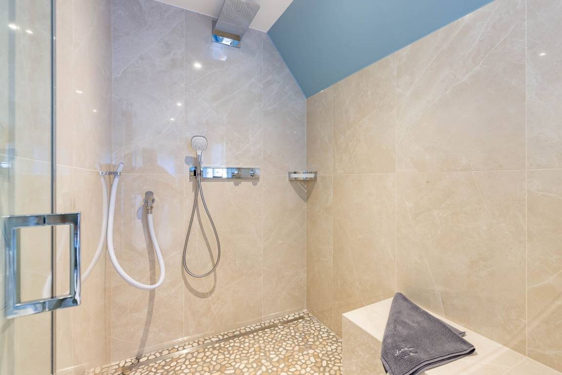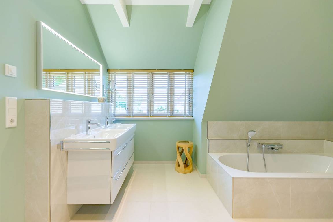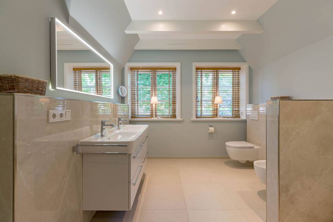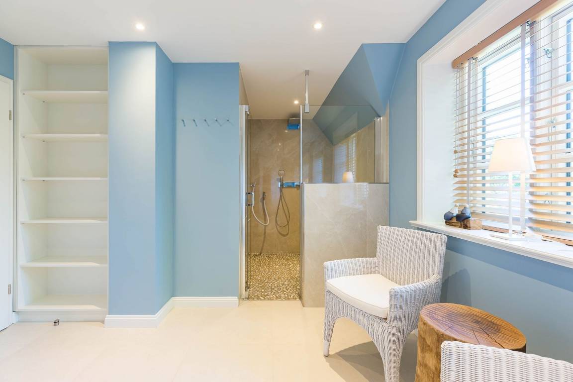 Im Obergeschoss finden Sie zwei weitere großzügige Schlafräume mit offener Kehlbalkendecke und en suite Bad. Beide Schlafräume sind ebenfalls jeweils mit einem TV und auch einem Schreibtisch ausgestattet. Ein Arbeitszimmer mit Alkoven ist einem Schlafzimmer vorgelagert. Die ebenfalls im Obergeschoss befindliche Sauna mit großer Walk-in-Dusche und Kneippgarnitur macht Ihren Wellnesstag zum Erlebnis.