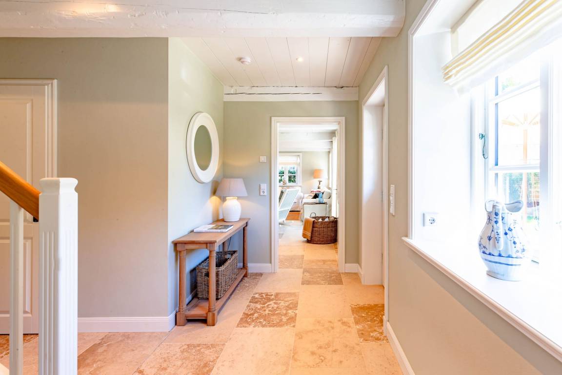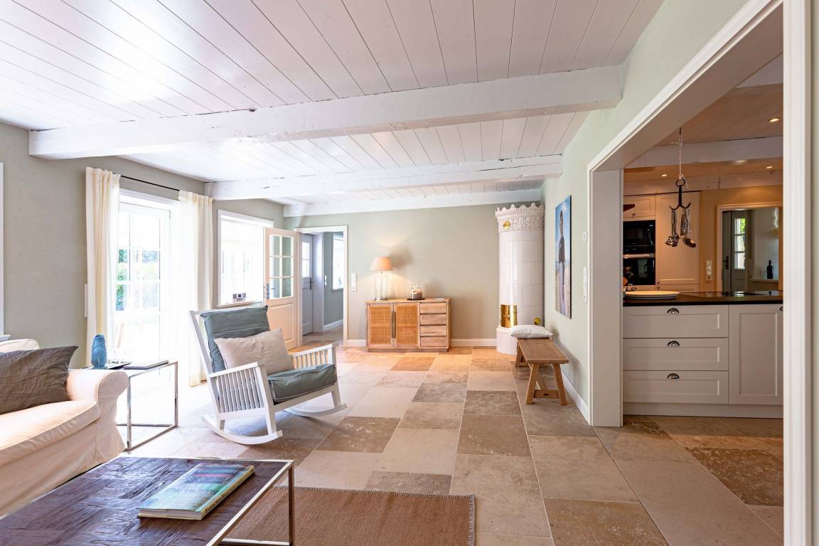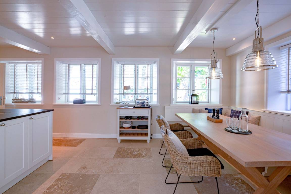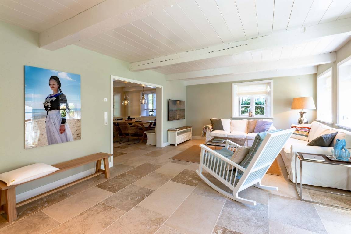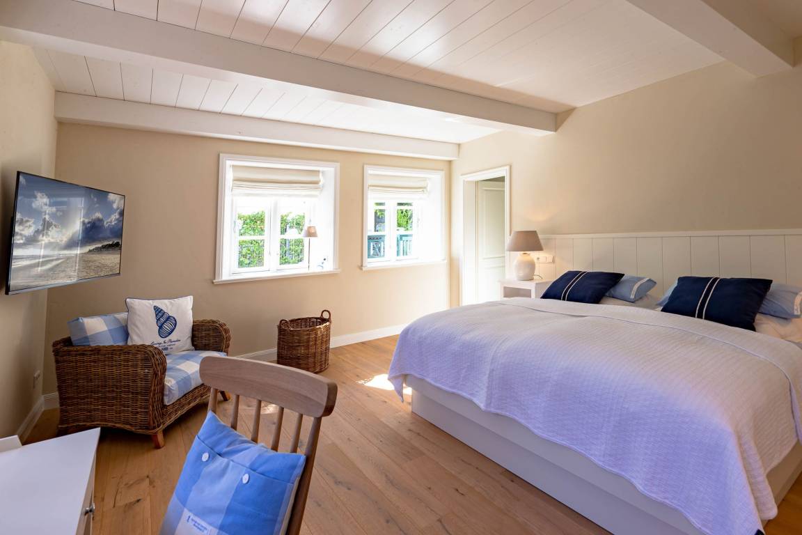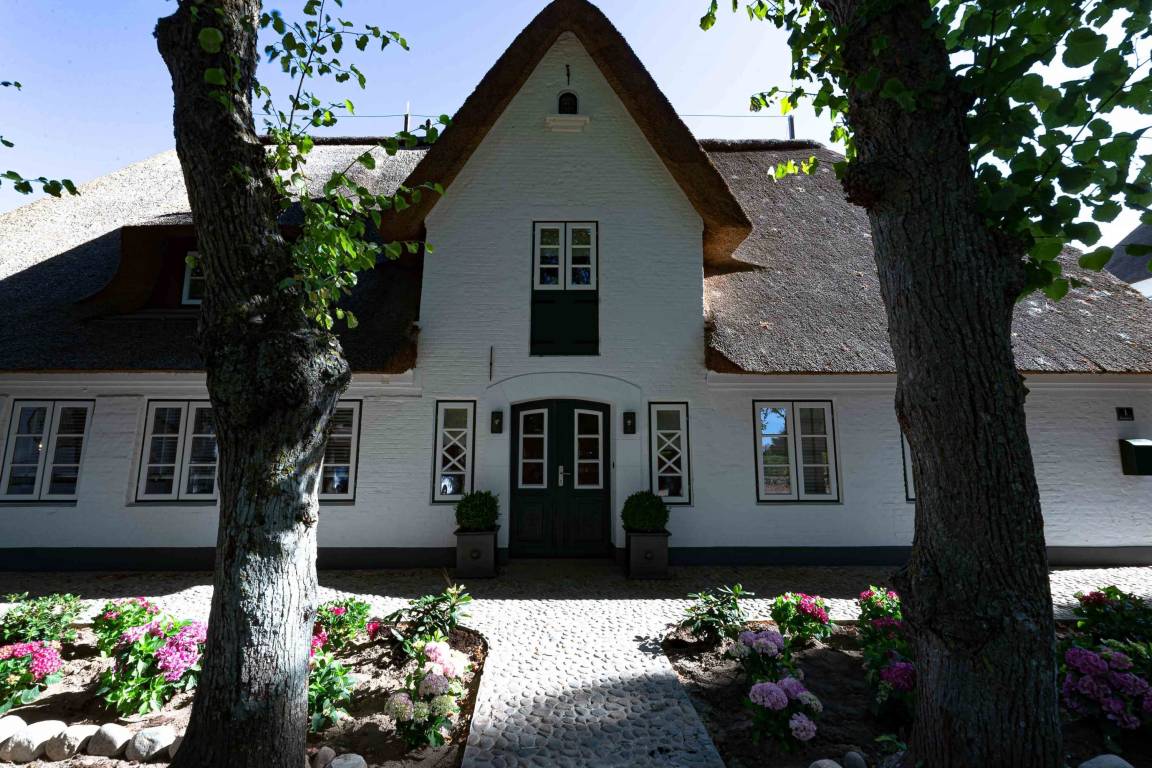 Die „Küstenliebe Nieblum" befindet sich im Dorfkern von Nieblum, dem wohl schönsten Dorf der Insel. Das denkmalgeschützte, 200qm große Kapitänshaus von 1799 wurde mit viel Sorgfalt und Liebe hochwertig renoviert und stilvoll eingerichtet. Im Haus finden 6 Personen Platz. Ein Schlafzimmer befindet sich im Erdgeschoss, zwei weitere im Obergeschoss. Jedes Schlafzimmer verfügt über ein eigenes Bad. Ein separates Gäste-WC befindet sich zusätzlich im Erdgeschoss. Die offene Küche bietet einen exklusiven Herd und eine hochwertige Küchenausstattung. An der straßenabgewandten Südseite des Hauses liegt der schöne, umschlossene Garten mit Friesenwall. Der historische Kachelofen von 1840, aber auch die Natursteinböden, die großzügige Diele mit separatem Garderobenraum und die offene Balkendecke im oberen Schlafzimmer geben der „Küstenliebe Nieblum" besonderen Charme. Der idyllische Friesenort Nieblum ist geprägt von Bauerngärten, verwinkelten Gassen und Friesenhäusern und wurde bereits als schönstes Dorf Deutschlands ausgezeichnet. Bäckerei, Fisch- und Feinkostgeschäft, Fahrradverleih, Restaurants und mehr befinden sich in fußläufiger Nähe. Der Strand ist 1200 m entfernt. Wer das Besondere sucht und sieht, ist in der „Küstenliebe Nieblum" richtig