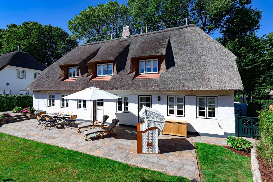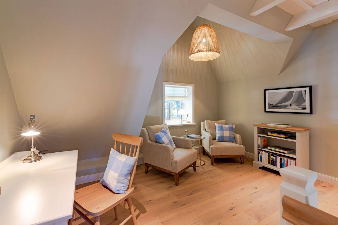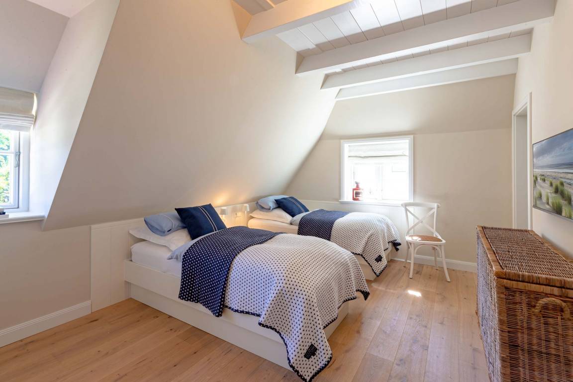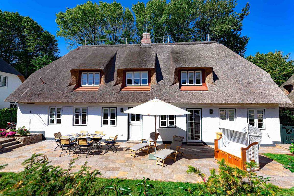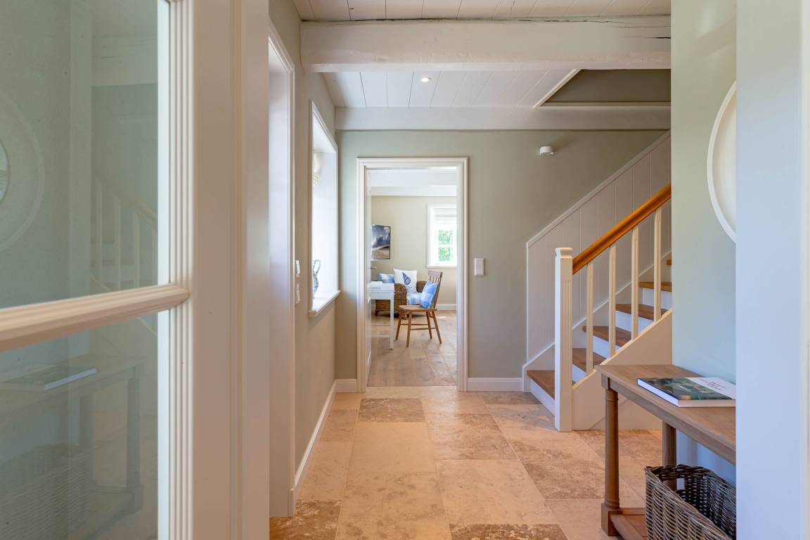 Die „Küstenliebe Nieblum" befindet sich im Dorfkern von Nieblum, dem wohl schönsten Dorf der Insel. Das denkmalgeschützte, 200qm große Kapitänshaus von 1799 wurde mit viel Sorgfalt und Liebe hochwertig renoviert und stilvoll eingerichtet. Im Haus finden 6 Personen Platz. Ein Schlafzimmer befindet sich im Erdgeschoss, zwei weitere im Obergeschoss. Jedes Schlafzimmer verfügt über ein eigenes Bad. Ein separates Gäste-WC befindet sich zusätzlich im Erdgeschoss. Die offene Küche bietet einen exklusiven Herd und eine hochwertige Küchenausstattung. An der straßenabgewandten Südseite des Hauses liegt der schöne, umschlossene Garten mit Friesenwall. Der historische Kachelofen von 1840, aber auch die Natursteinböden, die großzügige Diele mit separatem Garderobenraum und die offene Balkendecke im oberen Schlafzimmer geben der „Küstenliebe Nieblum" besonderen Charme. Der idyllische Friesenort Nieblum ist geprägt von Bauerngärten, verwinkelten Gassen und Friesenhäusern und wurde bereits als schönstes Dorf Deutschlands ausgezeichnet. Bäckerei, Fisch- und Feinkostgeschäft, Fahrradverleih, Restaurants und mehr befinden sich in fußläufiger Nähe. Der Strand ist 1200 m entfernt. Wer das Besondere sucht und sieht, ist in der „Küstenliebe Nieblum" richtig