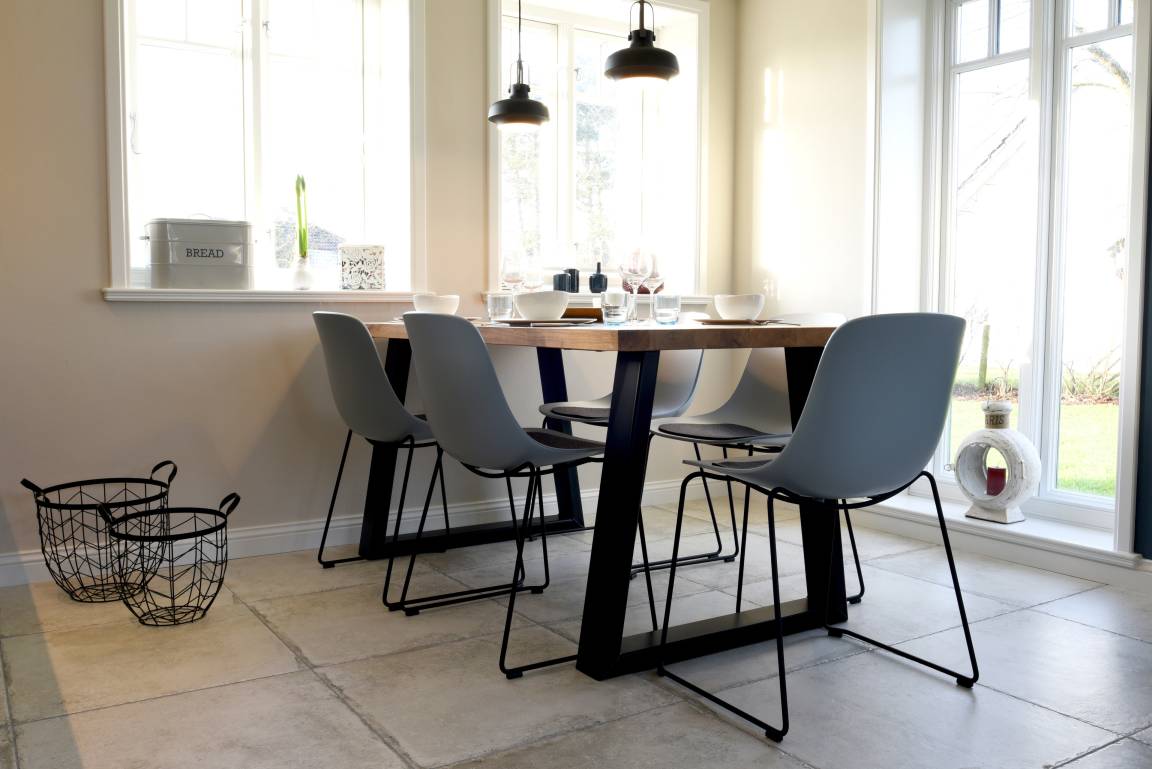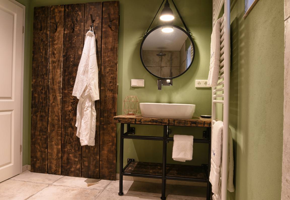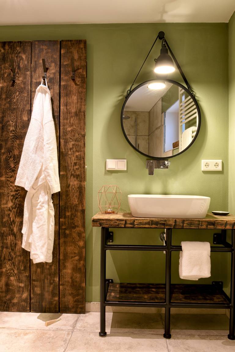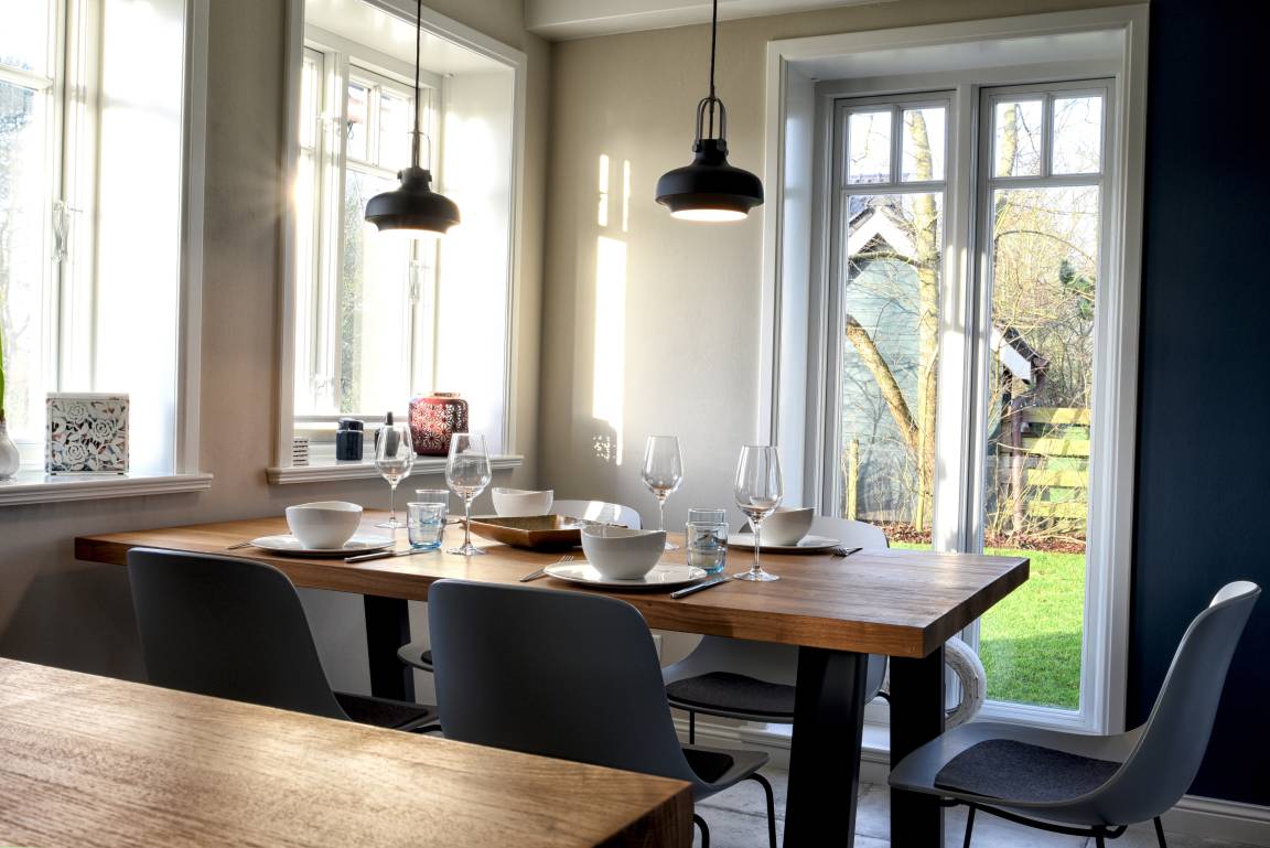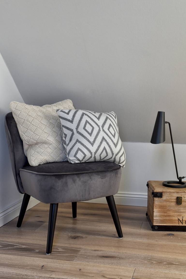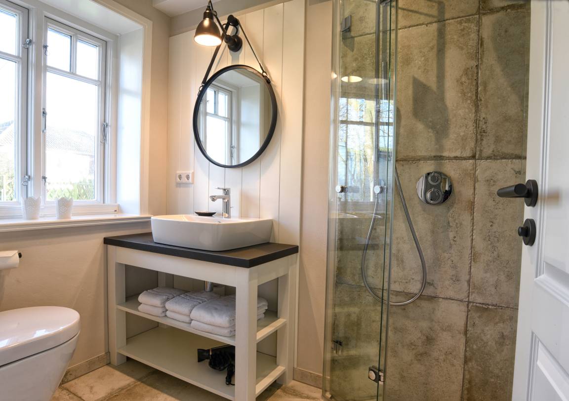 Im Erdgeschoss befindet sich die offene Küche mit dem angrenzenden Wohn- und Essbereich, eines der drei Schlafzimmer sowie ein Duschbad. Die hochwertige Tobias Stahl Küche ist mit modernen Markengeräten und insgesamt vielfältig ausgestattet. Der Wohn- und Essbereich wurde sehr ansprechend und mit viel Liebe zum Detail eingerichtet. Hier werden Sie sich garantiert sofort wohlfühlen! Das hell eingerichtete Schlafzimmer ist mit einem Doppelbett (80x200 cm) und einem Einbauschrank ausgestattet, hergestellt von hiesigen Tischlern.