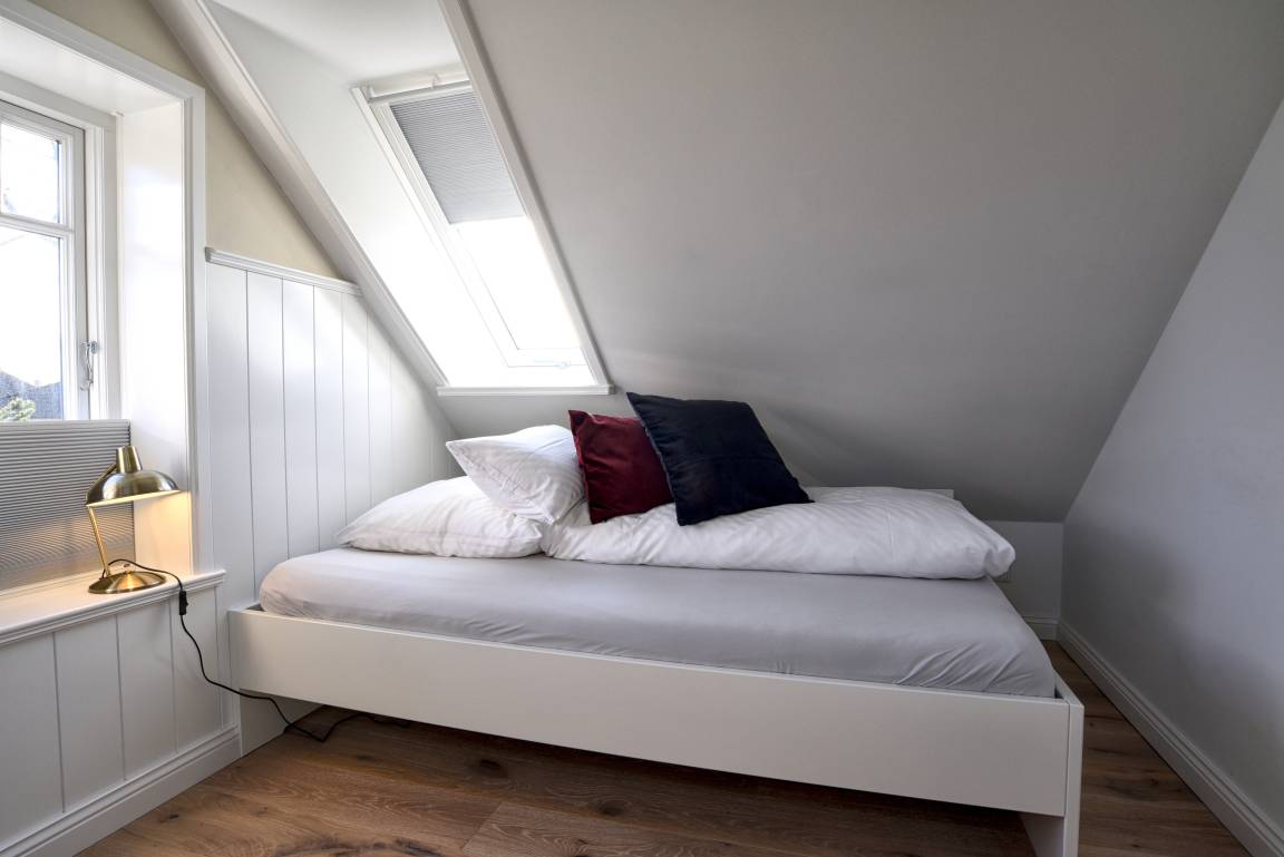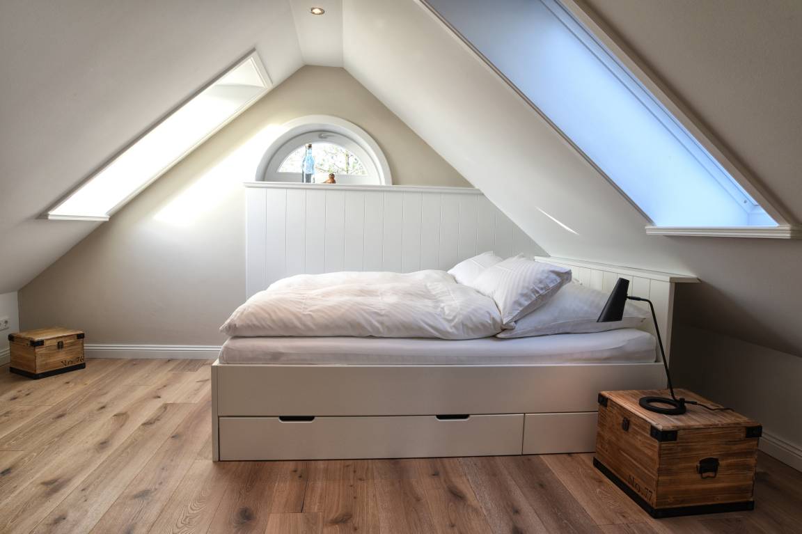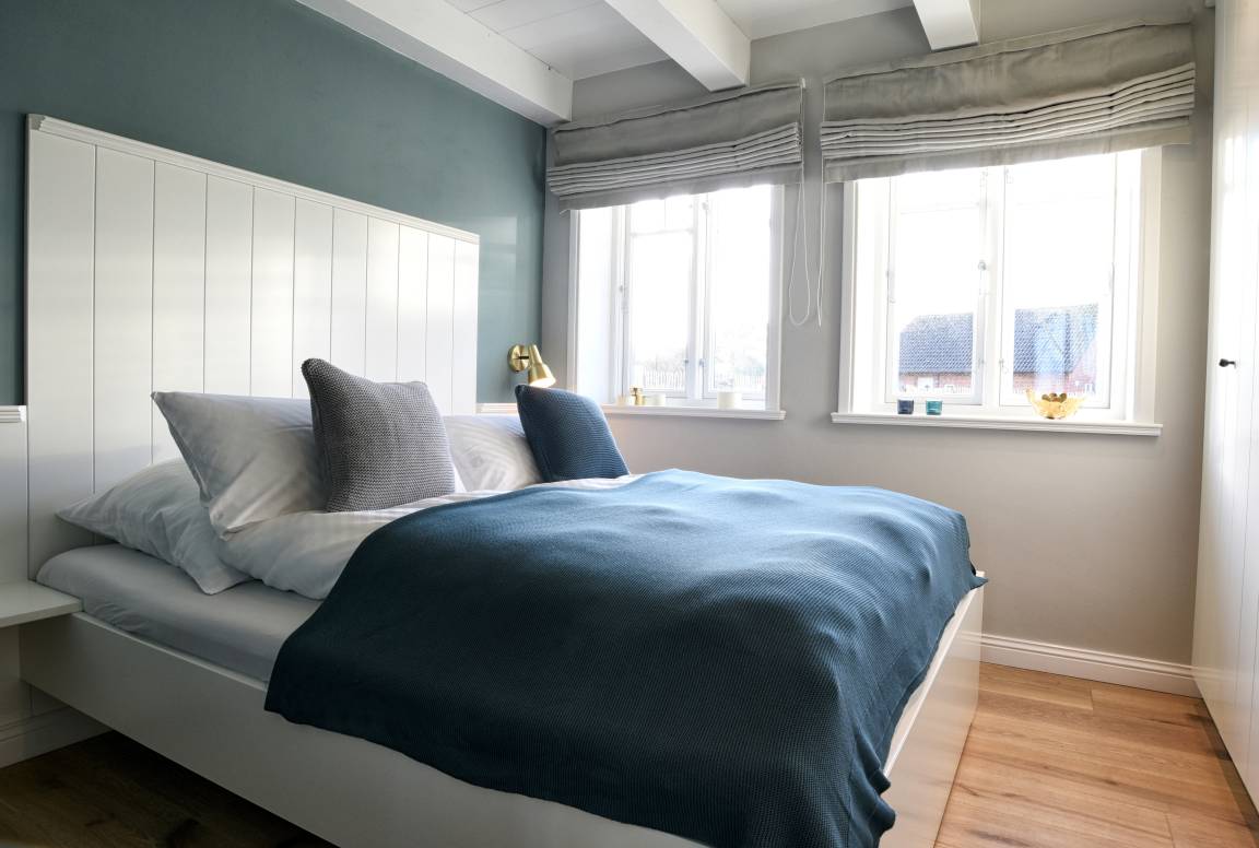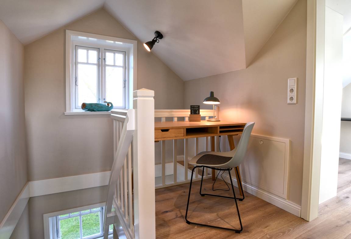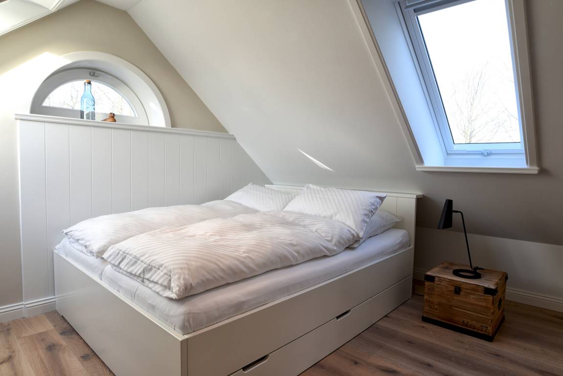 Im Obergeschoss finden Sie die zwei weiteren Schlafzimmer und ein Badezimmer mit Badewanne. Die beiden Schlafzimmer sind ebenfalls sehr hell und freundlich eingerichtet und verfügen über Einbauschränke und jeweils eine Sitzmöglichkeit. In dem einen Schlafzimmer befindet sich ein Doppelbett (80x200 cm), in dem anderen ein Queen-Size Bett (140x200 cm).