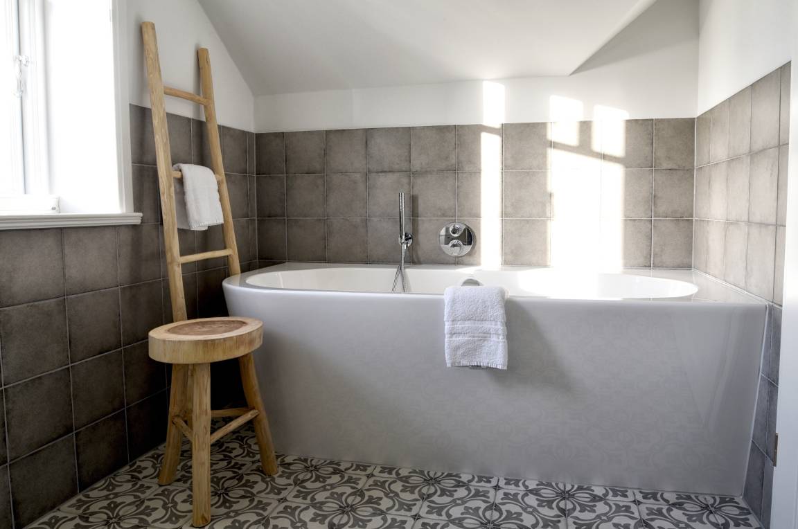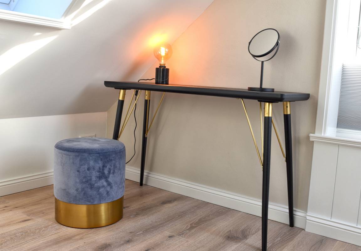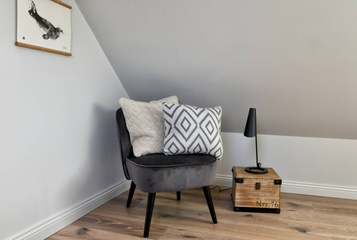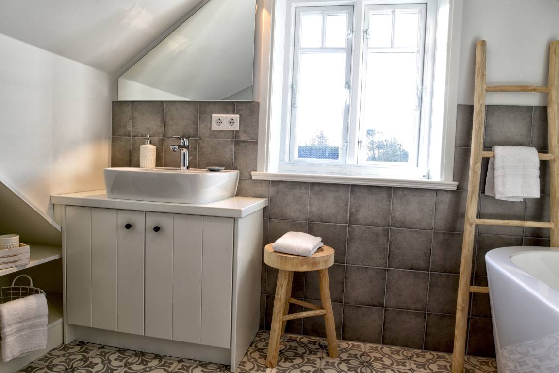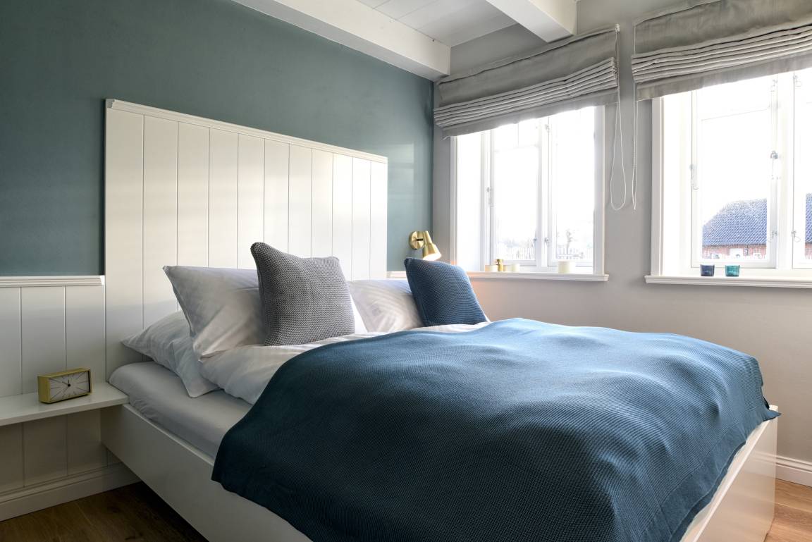 Im Obergeschoss finden Sie die zwei weiteren Schlafzimmer und ein Badezimmer mit Badewanne. Die beiden Schlafzimmer sind ebenfalls sehr hell und freundlich eingerichtet und verfügen über Einbauschränke und jeweils eine Sitzmöglichkeit. In dem einen Schlafzimmer befindet sich ein Doppelbett (80x200 cm), in dem anderen ein Queen-Size Bett (140x200 cm).