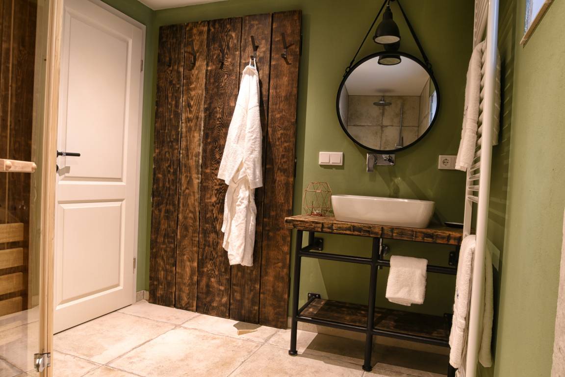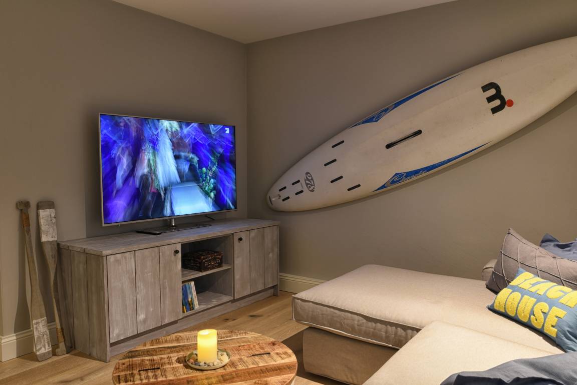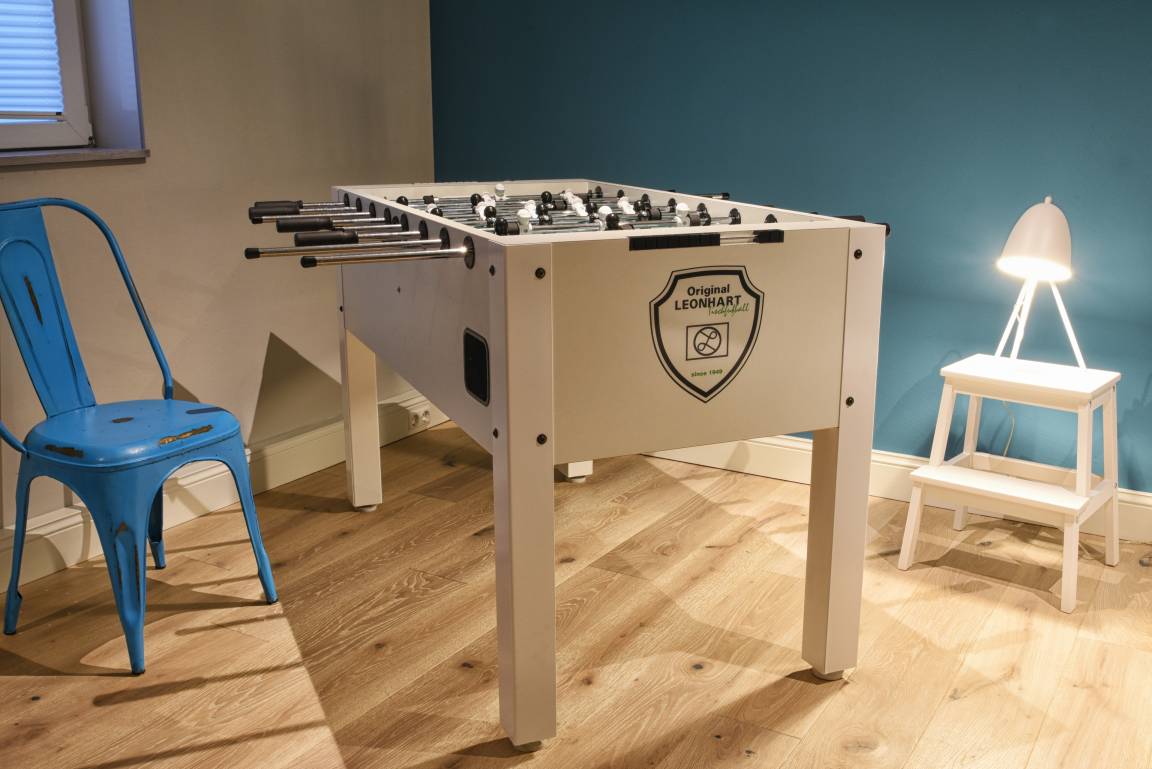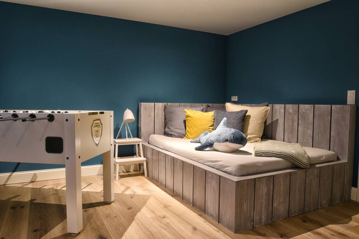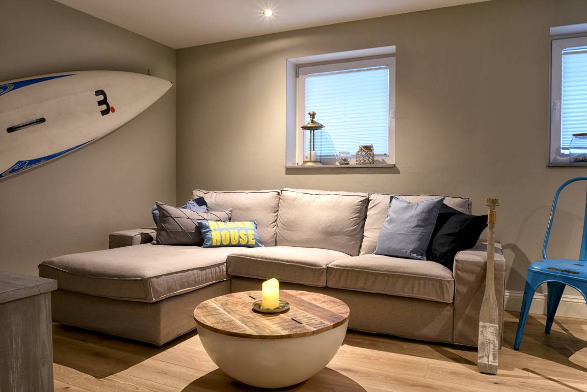 Im Untergeschoss befindet sich eine weitere Dusche und die Sauna, der Hauswirtschaftsraum - in dem Waschmaschine und Trockner untergebracht sind - und der Ruhe- und Fernsehraum. Dort befindet sich ein zweites Sofa, der Fernseher sowie ein Kickertisch und ein Tagesbett.