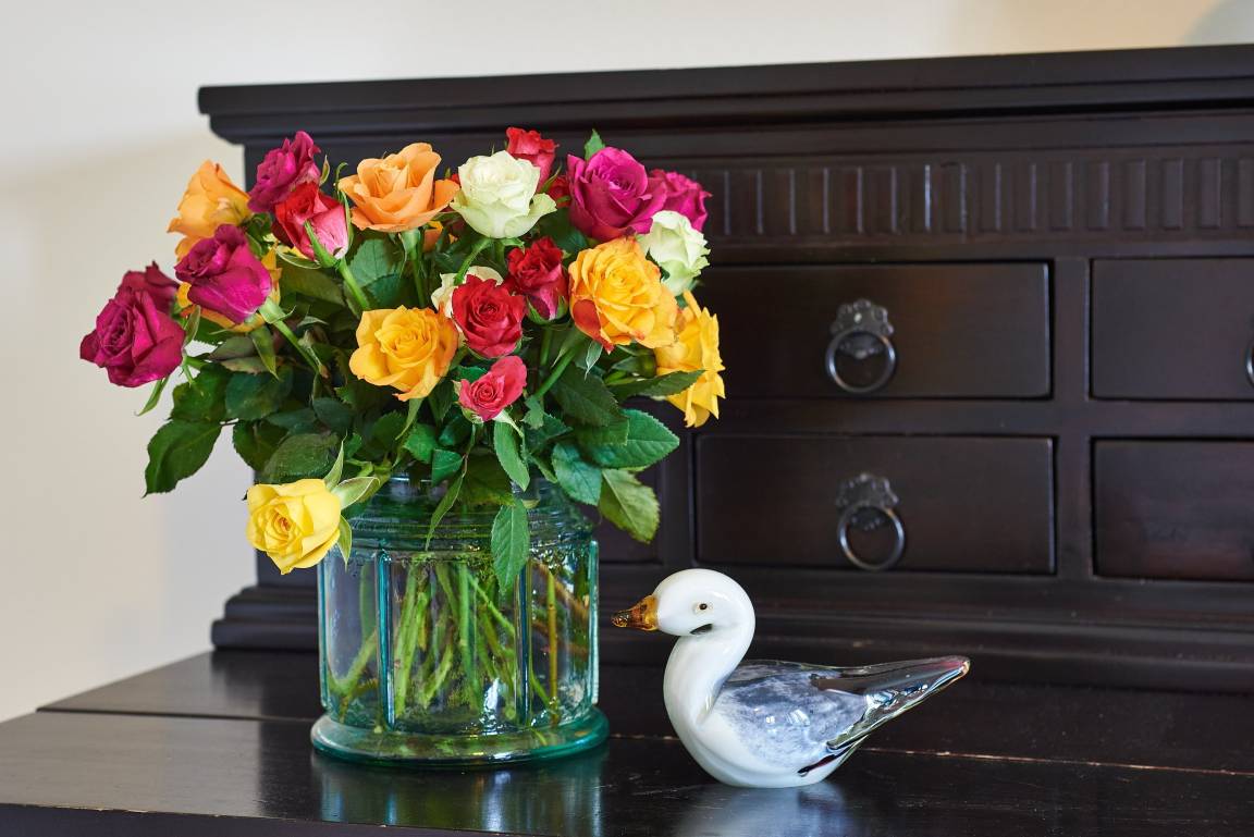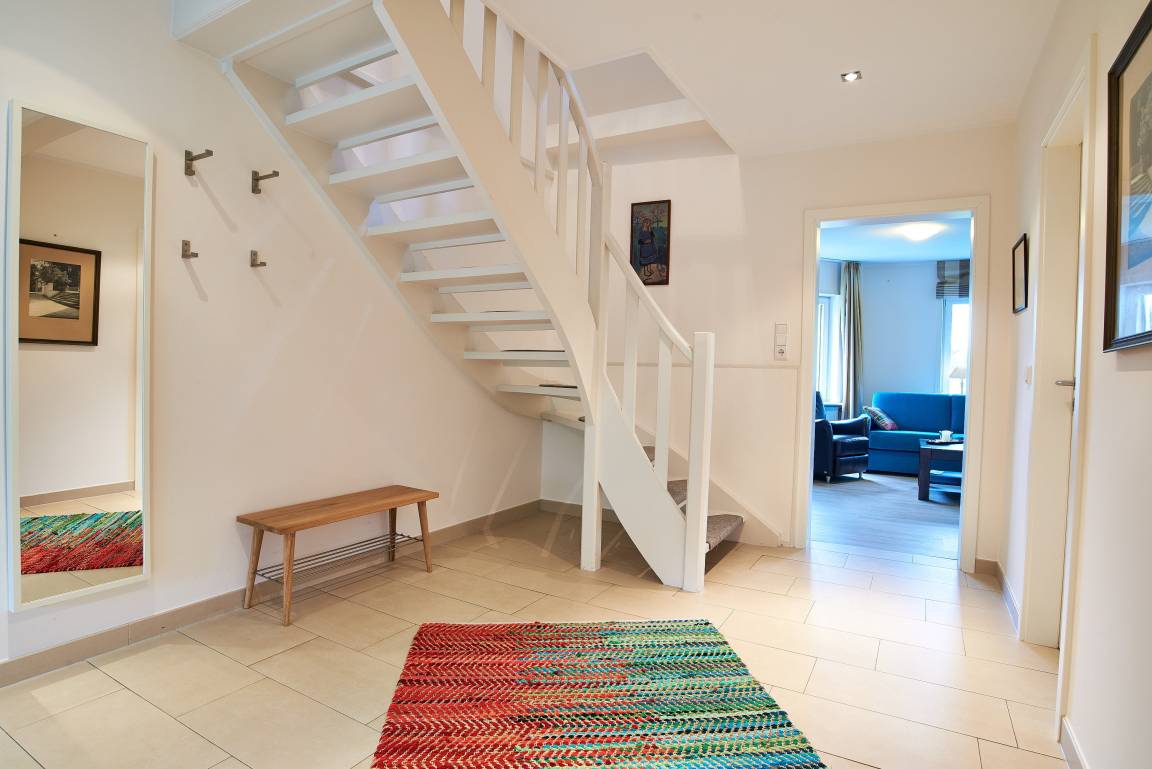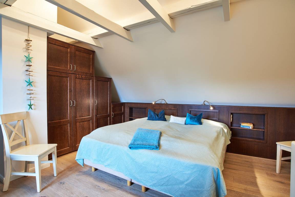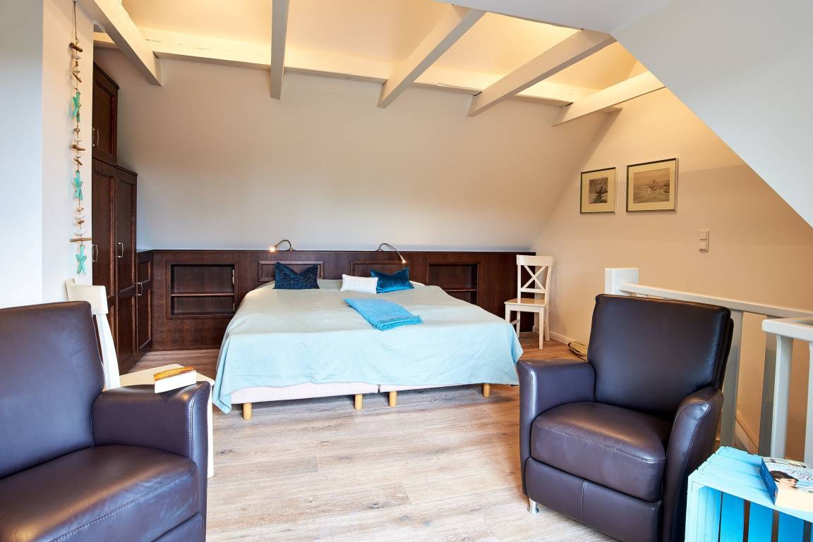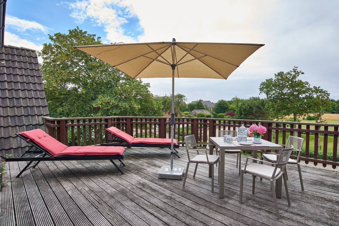 Mitten im Herzen des wunderschönen und idyllischen Ortes Nieblum, welcher unter vielen Liebhabern der Insel als schönster Ort auf Föhr gilt, befindet sich dieses Juwel nur wenige Meter entfernt vom schön angelegten und gepflegten Nieblumer Ententeich. Nieblum ist ein kleines Inseldorf, nur ca. 5 Km von der Stadt Wyk entfernt und bietet alles, was man zum täglichen Bedarf benötigt. Es gibt einen kleinen Einkaufsladen, eine Bäckerei mit hervorragenden Brötchen, Broten und süßen Gaumenfreuden, mehrere Restaurants und Cafés, eine unter den Föhrern sehr beliebte Eisdiele und natürlich einen schönen Strand mit Surfschule. Und genau in diesem hübschen Dorf liegt unsere Haushälfte Wildrose mit seinen 65 qm. Schon beim Betreten des Hauses werden Sie die offene und großzügige Bauweise der Doppelhaushälfte bemerken. Der geräumige Flur bietet reichlich Platz und von hier führt eine Treppe hinauf in den Schlafbereich, welcher mit der offenen Balkenlage, den dunklen, edlen Möbeln im Kontrast zum hell gestalteten Raum sogleich Gemütlichkeit ausstrahlt. Zugleich befindet sich im Schlafraum neben dem Boxspringbett (160x200cm) eine weitere Sitzgruppe zum Lesen, Fernsehschauen, Telefonieren oder einfach zum Entspannen und Zurückziehen. Von hier aus gelangen Sie auch auf die große Dachterrasse, die im Sommer (ca. April bis Ende September Anfang Oktober) mit Gartenmöbeln zum Verweilen einlädt.