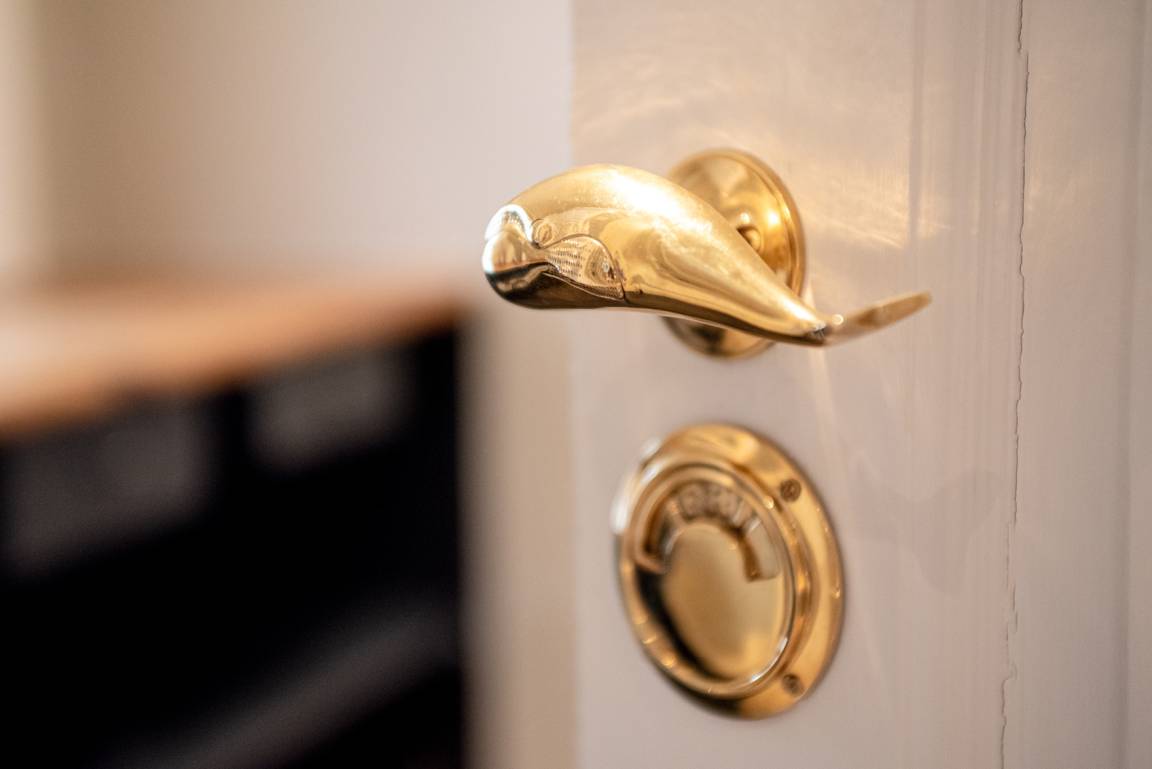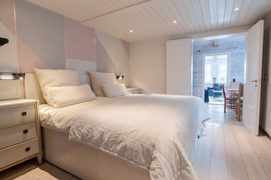 Die kleinere Sönnes Stuuv mit 60qm wird durch den alten Haupteingang des Hauses betreten. Dem großzügigen Eingangsbereich schließt sich das mit bequemen Sitzmöbeln ausgestattete Wohnzimmer an. In der vollausgestatteten Küche bietet sich der Küchentisch zum ausgiebigen Speisen, Zeitung lesen, langen Gesprächen an. Das Schlafzimmer ist mit einem großen äußerst bequemen Bett und viel Stauraum ausgestattet. Daran anschließend befindet sich das geräumige, moderne Bad, von dem aus sich eine Blickachse durch die gesamte Wohnung , durch das Fenster über Hunderte von Metern in die Allee vor dem Haus eröffnet. Hervorzuheben ist auch hier die stilsichere Ausstattung sowie wiederum Gemälde des Nieblumer Malers Fritz Chors (1884 - 1962). Zum Verweilen lädt auch eine Sitzecke vor dem Haus ein.
