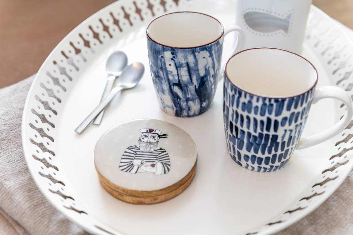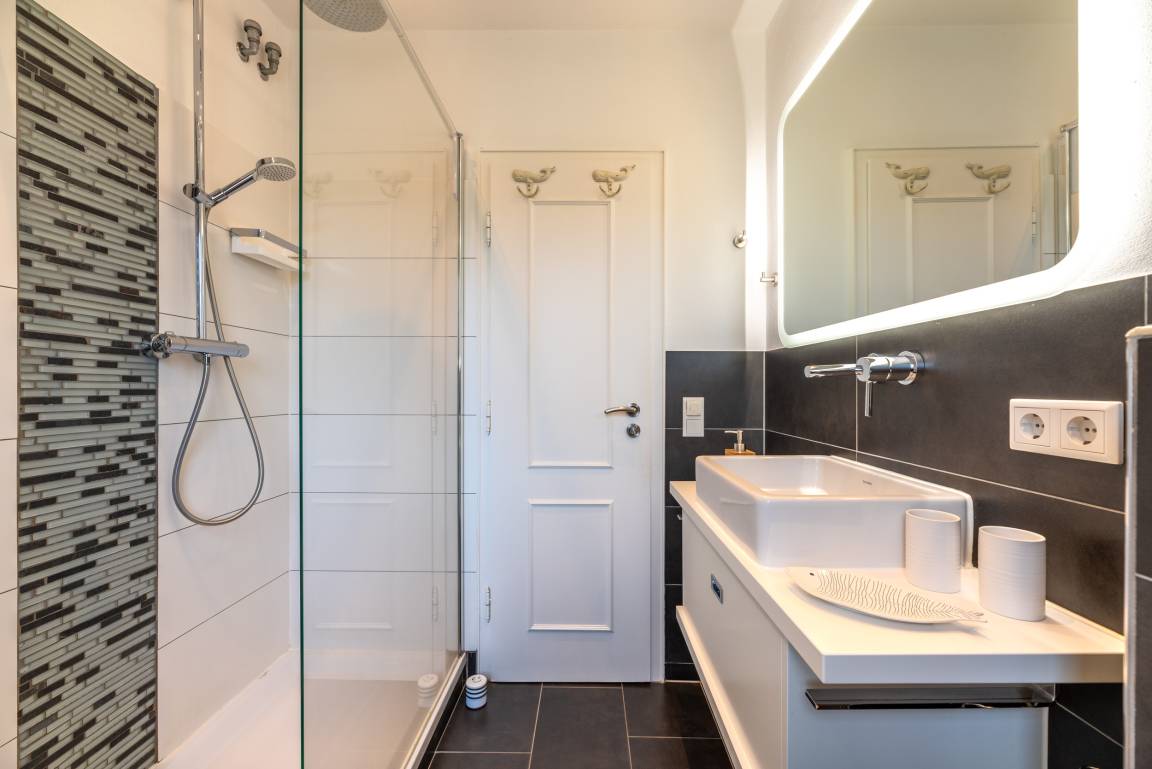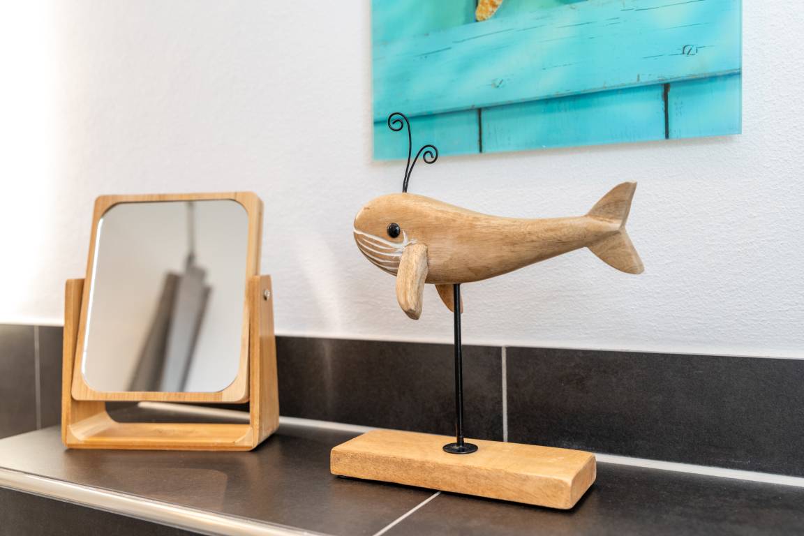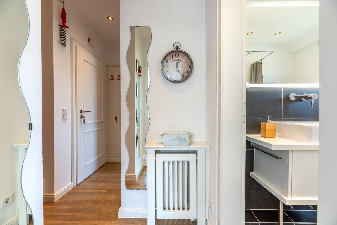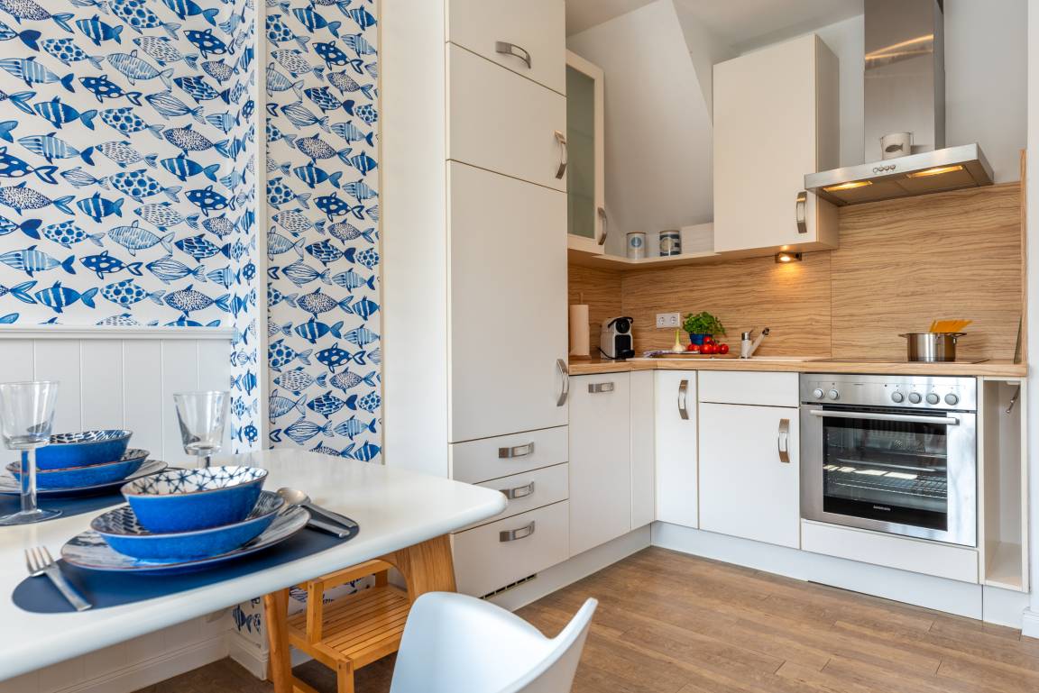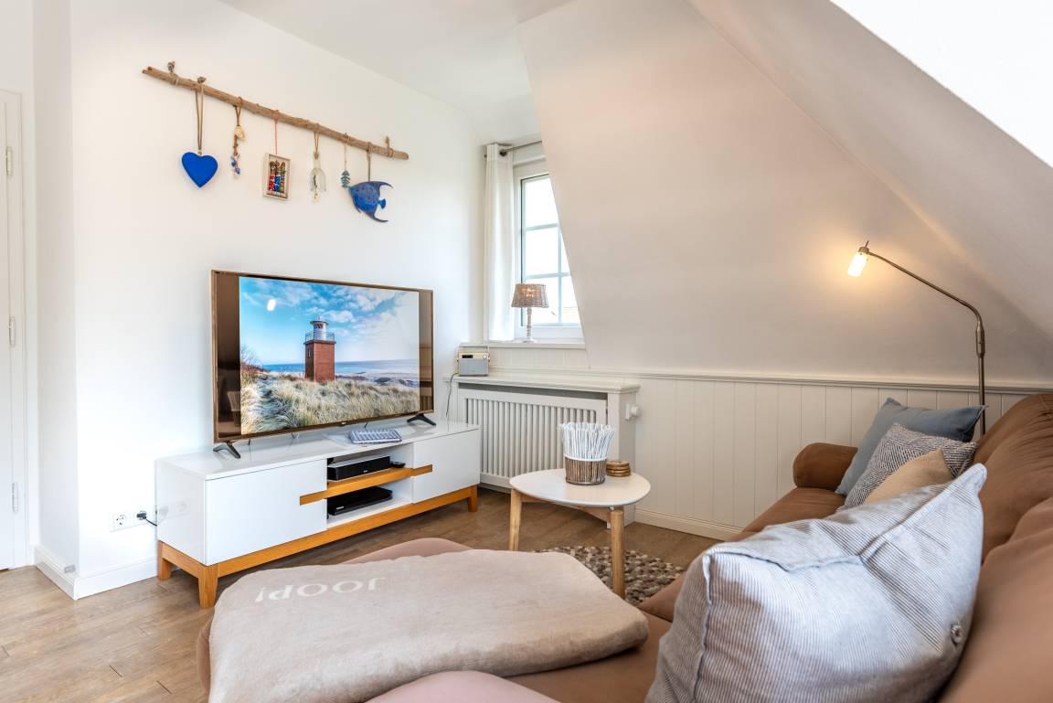 Die Wohnung befindet sich im Obergeschoss. Es gibt eine voll ausgestattete Küche mit Esstisch, eine gemütliche Schlafcouch im Wohnzimmer, ein Schlafzimmer und ein Duschbad mit Tageslicht. Zur Wohnung gehört ein Sitzplatz im Garten mit Gartenmöbeln und eigenem Strandkorb (während der Saison).